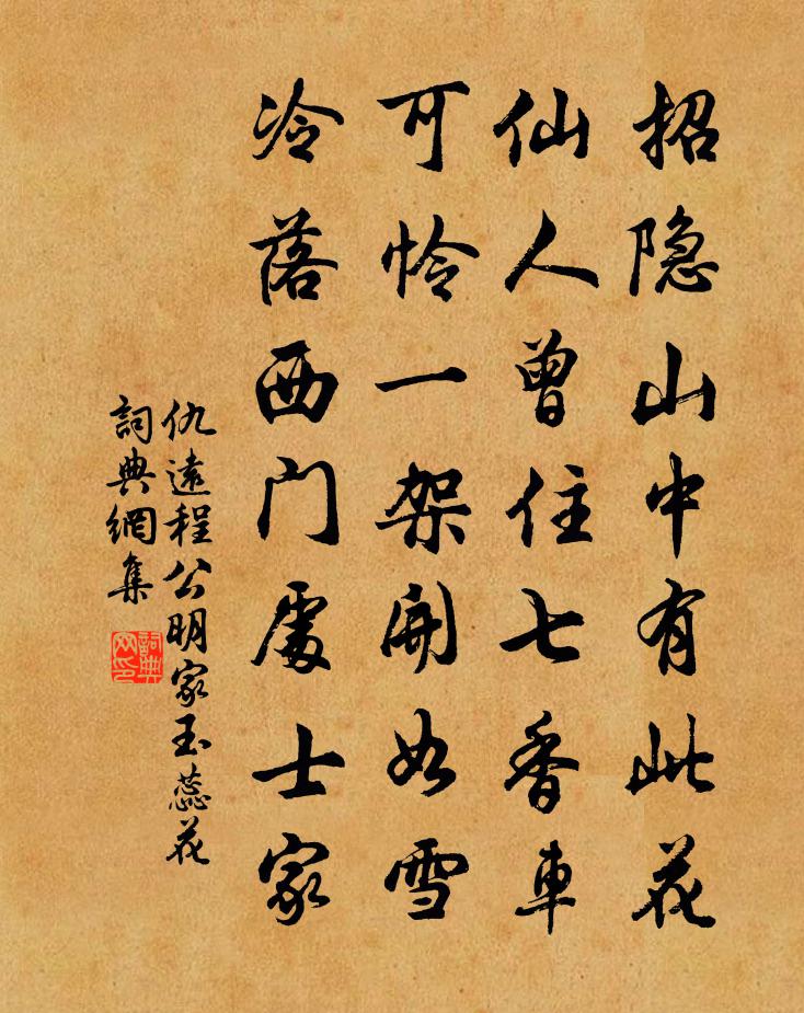 詩詞名句歷史字典書法欣賞書法字典國語詞典說文解字康熙字典古漢語字典標 題 作 者 詩 句 程公明家玉蕊花作者:仇遠 朝代:宋代程公明家玉蕊花原文招隱山中有此花,仙人曾住七香車。可憐一架開如雪,冷落西門處士家。詩詞問答問:程公明家玉蕊花的作者是誰?答:仇遠問:程公明家玉蕊花寫於哪個朝代?答:宋代仇遠程公明家玉蕊花書法欣賞程公明家玉蕊花書法作品詩詞推薦漁家傲呂渭老〔宋代〕高絆袈裟挑紙帔。一杯茶罷成行計。路入廬山風細細。輕彈指。百千三昧俱遊戲。法椅何曾燒兩臂。誰知紙上無窮烏夜啼朱敦儒〔宋代〕翦勝迎春後,和風入律頻催。前回下葉飛霜處,紅綻一枝梅。正遇時調玉燭,須添酒滿金杯。尋芳伴侶休閒過,排田家詞 / 田家行元稹〔唐代〕牛靿咤咤,田確確,旱塊敲牛蹄趵趵。種得官倉珠顆谷,六十年來兵簇簇,日月食糧車轆轆。一日官軍收海服,驅楊柳詞四解宋祁〔宋代〕垂楊無態不堪夸,猶有餘情解作花。三月紛紛飛似雪,白門啼殺叛兒鴉。再次前韻二首呈士秀曾協〔宋代〕相逢此日勝平生,不厭搘筇數送迎。樂地共欣三徑就,詩壇仍見一軍驚。風飄柳線曾經染,雪著梅梢分外清。光景送孫孔二秀才游廬山李中〔唐代〕廬山多勝景,偏稱二君游。松徑蒼苔合,花陰碧澗流。傾壺同坐石,搜句共登樓。莫學天台客,逢山即駐留。寒雨感懷呈斯遠三首趙蕃〔宋代〕少讀隱逸傳,雅意煙霞人。居官早自縛,半世幾沒身。青衫類枯葉,兩鬢如爛銀。人知趨走苦,己重疾病湮。歸微賀張儀立弄璋度正〔宋代〕弄月吟風泮水湄,幾回占喜誤蛛絲。三鱣講罷爭傳易,一鯉祥開想學詩。天傅梅花凝蝶粉,春歸柳葉畫蛾眉。何時病中放言五首韓元吉〔宋代〕長夏空齋冷欲冰,幾愁無米溷鄰僧。途窮誰為一舉手,計拙自宜三折肱。風靜鳶飛猶跕跕,日斜蚊聚已{甍瓦換羽吳子野將出家贈以扇山枕屏蘇軾〔宋代〕峨峨扇中山,絕壁信天剖。誰施大圓鏡,衡霍入戶牖。得之老月師。畫者一醉叟。常疑若人胸,自有雲夢藪。千岩送趙君十絕汪莘〔宋代〕有客胸藏太息書,蕭蕭白髮不堪梳。君王若問江東士,莫只相憐誦子虛。次韻孫從之侍郎寄題新喻周氏用德堂周必大〔宋代〕醉經飲德樂厭厭,餘味蓴羹豉下鹽。安得同為堂上客,共繙三萬軸牙籤。李絳裴度金朋說〔宋代〕輔主中興劃懋功,削平僭叛黨一循公。自憐黨起群邪進,王業蕭條不克終。同坰寄黃濟川五首吳則禮〔宋代〕甘作華顛老,聊尋潁上梅。長須喚舟楫,赤腳洗尊罍。白日要可挽,清香不受摧。若為教騕褭,載得阿川來。廣州江中作張說〔唐代〕去國年方晏,愁心轉不堪。離人與江水,終日向西南。雖然吟五首方回〔宋代〕屋上炊煙屋下燈,客來汲井具瓶繩。雖然此是尋常物,一是承平見不能。獨孤常州北亭張南史〔唐代〕北洫敞高明,憑軒見野情。朝回五馬跡,更勝百花名。海樹凝煙遠,湖田見鶴清。雲光侵素壁,水影盪閒楹。俗賴瑞鷓鴣彭元遜〔宋代〕背人西去一鶯啼。拍手還驚百舌飛。淺雨微寒春有思,宿妝殘酒欲忺時。鵁鶄浪起蒲茸暖,翡翠風來柳絮低。故遣送紫霄女道士四明謝君陸游〔宋代〕一別南充十四年,時時清夢到金泉。山 * 上秋風早,卻見神仙小自然。題羅溪李店二首楊萬里〔宋代〕棟宇整齊窗戶明,一峰對面一江橫。下程長是無佳店,佳店偏當未下程。名句推薦一寸丹心圖報國,兩行清淚為思親。于謙《立春日感懷》 罩向金籠好羽儀,分明喉舌似君稀僧定渚《詠鸚鵡》 絡緯秋啼金井闌,微霜淒淒簟色寒。李白《長相思·其一》 南國有佳人,容華若桃李。曹植《雜詩·南國有佳人》 柳葉開銀鏑,桃花照玉鞍。駱賓王《送鄭少府入遼共賦俠客遠從戎》 鳧脛雖短,續之則憂;鶴脛雖長,斷之則悲。莊子《莊子·外篇·駢拇》 相逢意氣為君飲,系馬高樓垂柳邊。王維《少年行四首》 對朝雲靉靆,暮雨霏微,亂峰相倚。黃庭堅《醉蓬萊》 紙上得來終覺淺,絕知此事要躬行。陸游《冬夜讀書示子聿》 君子欲訥於言而敏於行。孔子弟子《論語·里仁篇》