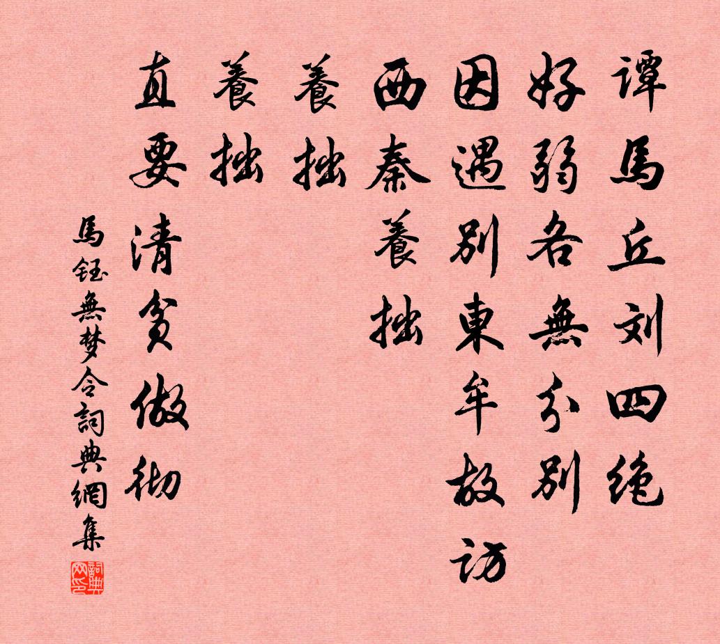 詩詞名句歷史字典書法欣賞書法字典國語詞典說文解字康熙字典古漢語字典標 題 作 者 詩 句 無夢令作者:馬鈺 朝代:元代無夢令原文譚馬丘劉四絕。好弱各無分別。因遇別東牟,故訪西秦養拙。養拙。養拙。直要清貧做徹。詩詞問答問:無夢令的作者是誰?答:馬鈺問:無夢令寫於哪個朝代?答:元代問:無夢令是什麼體裁?答:詞馬鈺無夢令書法欣賞無夢令書法作品詩詞推薦登快閣黃庭堅〔宋代〕痴兒[1]了卻公家事,快閣東西倚晚晴。落木千山天遠大,澄江一道月分明。朱弦已為佳人絕[2],青眼聊因讀後漢書陸游〔宋代〕賃舂老子吾所慕,垂世文章寧在多!詩不刪來二千載,世間惟有五噫歌。酬裴傑秀才新櫻桃權德輿〔唐代〕新果真瓊液,來應宴紫蘭。圓疑竊龍頷,色已奪雞冠。遠火微微辨,殘星隱隱看。茂先知味易,曼倩恨偷難。忍用夜過洞庭殷堯藩〔唐代〕笙歌只解鬧花天,誰是敲冰掉小船。為覓瀟湘幽隱處,夜深載月聽鳴泉。蝶戀花晏殊〔宋代〕梨葉疏紅蟬韻歇。銀漢風高,玉管聲淒切。枕簟乍涼銅漏咽。誰教社燕輕離別。草際蛩吟珠露結。宿酒醒來,不記詞笑令(⑦鶯鶯)秦觀〔宋代〕詩曰:崔家有女名鶯鶯。未識春光先有情。河橋兵亂依蕭寺,紅愁綠慘見張生。張生一見春情重。明月拂牆花樹動訪故人釋斯植〔宋代〕石榻相期久,閒尋到野房。春歸芳草暗,雲入楚山長。人影分孤驛,雞聲落曙桑。淒涼千古事,回首兩茫茫。舟中病思三首趙蕃〔宋代〕日腳陰晴屢,船身坐臥俱。溪山無入望,覊旅孰為娛。路識長安近,名非短策圖。無迷蔡謨蟹,且覓季鷹鱸。晚歸灃川韋應物〔唐代〕凌霧朝閶闔,落日返清川。簪組方暫解,臨水一翛然。昆弟忻來集,童稚滿眼前。適意在無事,攜手望秋田。南嶺齋中詠懷羊士諤〔唐代〕無心唯有白雲知,閒臥高齋夢蝶時。不覺東風過寒食,雨來萱草出巴籬。夜行偶成陳藻〔宋代〕腳踏橫塘外氏村,忽瞻北極動歸魂。貧姑生理凋零盡,八十無兒住此門。後九首劉克莊〔宋代〕坐井成小眼孔,面壁得大醫王。淨洗三生熱惱,不煩一服清涼。大慧贊釋師範〔宋代〕僧中之龍,法中之王。贊不及處,衡陽梅陽。寄人二首張佖〔宋代〕酷憐風月這多情,還到春時別恨生。倚柱尋思倍惆悵,一場春夢不分明。初晴游滄浪亭蘇舜欽〔宋代〕夜雨連明春水生,嬌雲濃暖弄微晴。簾虛日薄花竹靜,時有乳鴿相對鳴。惜竹孔武仲〔宋代〕老蘚牆陰夕照間,何人折我翠琅玕。即茲綠葉隨塵化,猶有低枝帶露殘。不放雲梢侵霰雪,因嗟世故足波瀾。故園桐君山邑人呼為小金山桐君所廬也毛滂〔宋代〕塔設新嚴跡半空,山前山後但孫桐。樓台影壓浮天浪,鐘鼓聲隨過岸風。定有龍宮在深碧,初疑海市變青紅。眾醫寄雪竇千峰琬西堂釋如珙〔宋代〕千丈崖根芋火香,天上日輪正卓午。東土西乾無祖師,白頭老僧七十五。王母祝語梔子花詩王義山〔宋代〕當年曾記晉華林,望氣紅黃梔子深。有敕諸宮勤守護,花開如玉子如金。此花端的名檐卜,千佛林中清更潔。從知淮陰侯廟梅堯臣〔宋代〕韓信未遇時,忍飢坐垂釣。歸來淮陰市,又復逢惡少。使之出胯下,一市皆大笑。龍蛇忽雲騰,蛭螾豈能料。亡命名句推薦未羞他、雙燕歸來,畫簾半卷張炎《解連環·孤雁》 日暖桑麻光似潑,風來蒿艾氣如薰。蘇軾《浣溪沙·軟草平莎過雨新》 桃花落,閒池閣。山盟雖在,錦書難托。陸游《釵頭鳳·紅酥手》 飛鳥盡,良弓藏;狡兔死,走狗烹。司馬遷《史記·越王勾踐世家》 好事不出門,壞事傳千里。佚名《增廣賢文·上集》 俯瞰黃河小,高懸白雪清。胡秉正《詠賀蘭山》 佳節清明桃李笑,野田荒冢只生愁。黃庭堅《清明》 不辭山路遠,踏雪也相過。張九齡《答陸澧》 驕奢淫逸,所自邪也。左丘明《左傳·隱公·隱公三年》 為誰醉倒為誰醒,到今猶恨輕離別。呂本中《踏莎行·雪似梅花》