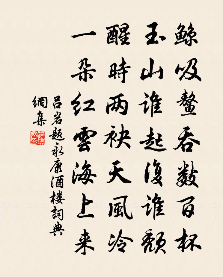 詩詞名句歷史字典書法欣賞書法字典國語詞典說文解字康熙字典古漢語字典標 題 作 者 詩 句 題永康酒樓作者:呂岩 朝代:唐代題永康酒樓原文鯨吸鰲吞數百杯,玉山誰起復誰頹。醒時兩袂天風冷,一朵紅雲海上來。詩詞問答問:題永康酒樓的作者是誰?答:呂岩問:題永康酒樓寫於哪個朝代?答:唐代問:題永康酒樓是什麼體裁?答:七絕呂岩題永康酒樓書法欣賞題永康酒樓書法作品注釋全唐詩:卷858-15詩詞推薦高士詠嚴君平吳筠〔唐代〕漢皇舉遺逸,多士鹹已寧。至德不可拔,嚴君獨湛冥。卜筮訓流俗,指歸暢玄經。閉關動元象,何必游紫庭。禪人畫師像請贊釋如珙〔宋代〕一喝從馬師起,臨濟承虛接響。病叟本無氣力,不能學這般承。有炎氏頌佚名〔先秦〕聽之不聞其聲。視之不見其形。充滿天地。苞裹六極。寄紫微高侍郎三首岳珂〔宋代〕去年紫塞兩相望,公在齊安我武昌。秋晏車箱訪流馬,夜深弧矢看天狼。不辭目斷傳烽堠,尚憶螯持共酒觴。今日浣溪沙(戲陳子長)吳儆〔宋代〕汗褪香紅雪瑩肌。裝餘靜麗霧裁衣。晚涼新浴倚欄時。簾卷輕風斜蠆發,杯深新月墮蛾眉。此時風味許誰知。和秦壽之春晚偶成八絕王之道〔宋代〕花外霏微雨弄晴,亂紅狼藉過清明。傷春正苦無聊甚,接接欣聞噪鵲聲。浣溪沙賀鑄〔宋代〕不信芳春厭老人,老人幾度送餘春。惜春行樂莫辭頻。巧笑艷歌皆我意,惱花顛酒拚君真。物情惟有醉中真。天台書事十三首曹勛〔宋代〕連雨催寒黃著苔,紛然枯葉擁閒階。了無春意到梅萼,只有瑞香先臘開。七夕杜審言〔唐代〕白露含明月,青霞斷絳河。天街七襄轉,閣道二神過。袨服鏘環珮,香筵拂綺羅。年年今夜盡,機杼別情多。梅花喜神譜欲謝一十六枝宋伯仁〔宋代〕絲絲絲共白,歷遍風霜寒。君王豈輕剪,欲療將軍安。方塘晁公溯〔宋代〕清陰布幽徑,綠水溢回塘。筍長露漬粉,蓮開風壞妝。坐多惟踵息,躁定自心涼。學道今始得,頤生真有方。酬智叔見戲二首陳師道〔宋代〕雨花風葉未宜春,私柳官渠白下門。每度清溪嘲短髮,時容使席近芳樽。雄蜂雌蝶元非偶,野馬游塵不佐鯤。若許嘲游使君盧肇〔唐代〕白帝城頭二月時,忍教清醒看花枝。莫言世上無袁許,客子由來是相師。句孫吳會〔宋代〕遊人只解游晴晝,風雨朝昏盡屬君。野眺有感釋紹嵩〔宋代〕流落復蹉跎,生崖總幾何。羈游故交少,歸思夜深多。縱目懷青島,遙天浸白波。誰令貪眺睡,到處被詩磨。道中即事方岳〔宋代〕家人不寄扊扅詩,直恐藁砧官尚微。到了不過相愛耳,未論此語是耶非。病中書蔡戡〔宋代〕短褐頹然一病僧,支離瘦骨伴枯藤。掃除習氣嗟猶在,擺脫塵緣愧未能。案上縱橫堆藥裹,篋中顛倒貯書縢。青鞋銀結條冠子徐夤〔唐代〕日下征良匠,宮中贈阿嬌。瑞蓮開二孕,瓊縷織千條。蟬翼輕輕結,花紋細細挑。舞時紅袖舉,纖影透龍綃。黃雀吟孟郊〔唐代〕黃雀舞承塵,倚恃主人仁。主人忽不仁,買彈彈爾身。何不遠飛去,蓬蒿正繁新。蒿粒無人爭,食之足為珍。莫覷交韻曾吉父清明王洋〔宋代〕暄晴猶苦促,那更遇春霖。花色存餘態,春台得重臨。主觴方意展,客意已悉侵。是底書生事,時為洛下吟。名句推薦誠者,天之道也;思誠者,人之道也。至誠而不動者,未之有也;不誠,未有能動者也。孟子《孟子·離婁章句上·第十二節》 人有不及,可以情恕。房玄齡《晉書·列傳·第六章》 一山飛峙大江邊, 躍上蔥蘢四百旋 * 《七律·登廬山》 雖萬被戮,豈有悔哉!班固《漢書·傳·司馬遷傳》 呼兒將出換美酒,與爾同銷萬古愁。李白《將進酒》 白水明田外,碧峰出山後。王維《新晴野望》 春風對青冢,白日落梁州。張喬《書邊事》 龜言此地之寒,鶴訝今年之雪。庾信《小園賦》 故人不可見,新知萬里外。文天祥《端午即事》 海日生殘夜,江春入舊年。王灣《次北固山下》