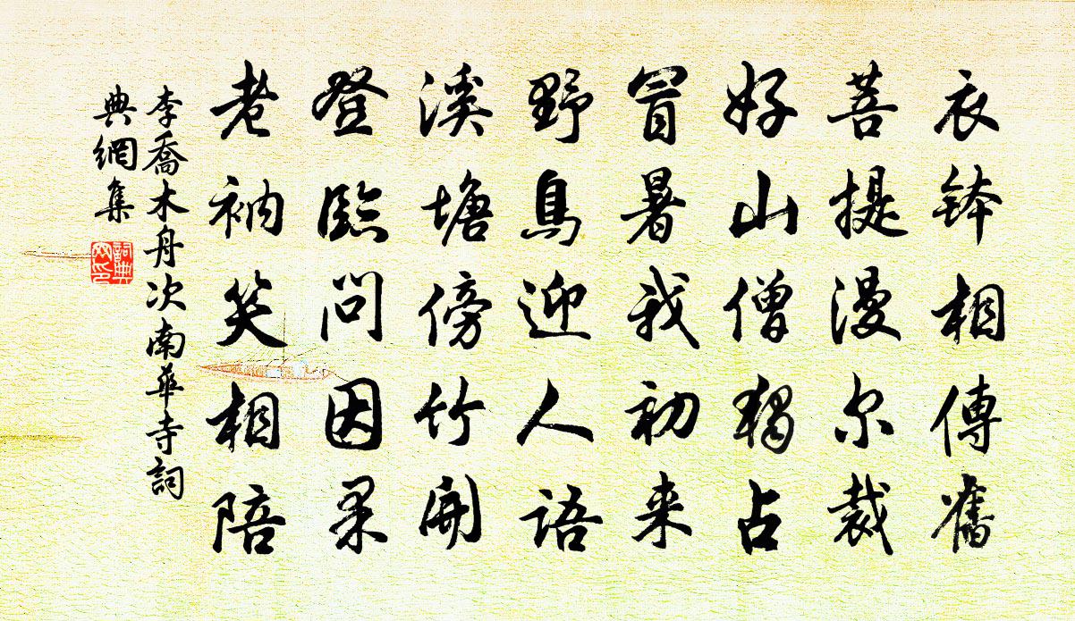 詩詞名句歷史字典書法欣賞書法字典國語詞典說文解字康熙字典古漢語字典標 題 作 者 詩 句 舟次南華寺作者:李喬木 朝代:宋代舟次南華寺原文衣缽相傳舊,菩提漫爾裁。好山僧獨占,冒暑我初來。野鳥迎人語,溪塘傍竹開。登臨問因果,老衲笑相陪。詩詞問答問:舟次南華寺的作者是誰?答:李喬木問:舟次南華寺寫於哪個朝代?答:宋代李喬木舟次南華寺書法欣賞舟次南華寺書法作品詩詞推薦挽林進士劉克莊〔宋代〕一門皆擢第,君獨老儒冠。試卷年年納,經書日日看。文為前輩賞,命合主司難。遙想泉台恨,銘旌未寫官。已亥雜詩 235龔自珍〔清代〕美人信有錯刀投,不負張衡詠四愁。k 罷心香屢回顧,古時明月照杭州。謁金門佚名〔宋代〕文章士。秀氣岳神鍾聚。看雕鵬、秋風高舉。上青天平步。五五日臨夏五。堂上稱觴笑語。桂子蘭孫齊彩舞。祝壽士廷評相會梓州石介〔宋代〕道視荀楊雖未至,分於管鮑已知深。一千二百日離別,五十六驛外相尋。重欲同君注周易,且來共我聽胡琴。月留論詩三十首·二十四元好問〔金代〕“有情芍藥含晚淚,無力薔薇臥晚枝”。拈出退之山石句,始知渠是女郎詩。曉起信筆范成大〔宋代〕午枕汗如洗,曉櫛氣稍蘇。落蛩試風露,滿意鳴相呼。倦客感節物,流光不躊躇。秋聲已如許,殘暑何足驅。人言對雪和子厚弟四首王之道〔宋代〕凍雲不成雨,巧作白玉霙。寒光僭曉色,報我東窗明。起來撥殘火,暖酒手自傾。多謝麴居士,於人殊有情。過章貢第七十九文天祥〔宋代〕崆峒地無軸,江山雲霧昏。萍漂忍流涕,故里但空存。道中望茅山有感周文璞〔宋代〕危亭對名岳,畢景扶鉤欄。白鷺伺察過,低昂若弓彎。去歲負笈游,最住元符間。櫟林帶修竹,清派流珊珊。離留詩一首馬文斌〔宋代〕希奇寶象獸中王,猛毅雄心世不當。四足端然如玉柱,雙牙利劍若金鋩。立觀峭峻成功岳,動必搖形見者慌。但心次韻德孺晚菊李處權〔宋代〕屈原作離騷,採菊餐其英。淵明賦歸來,徑荒菊猶榮。此物有至性,名因君子成。豈知時節過,不顧霜露凝。歲華書樓懷古羊士諤〔唐代〕何獨文翁化,風流與代深。泉雲無舊轍,騷雅有遺音。遠目窮巴漢,閒情閱古今。忘言意不極,日暮但橫琴。次雲見過留宿有詩因賡其韻二首黃公度〔宋代〕惜別情無賴,狂吟意有餘。琴尊閒院落,花柳暗村墟。行樂真聊爾,論交莫後予。裹糧山下約,來往未應疏。題布袋和尚豐乾禪師寒山拾得畫卷方回〔宋代〕今有二異僧,一虎隨之入城市,一曳布袋引群小兒,民間不鼎沸喧鬨乎。以人情觀之,書本相傳如此,既未親見,帥節留先生兩年粵服氓獠安之一日疏十宜欲袖陳元晉〔宋代〕木種十年計,苓培千歲根。三生疑宿植,九殞志酬恩。遠送竟須別,百懷難具論。任安窮自分,義不辱公門。酬楊侍郎憑見寄劉禹錫〔唐代〕十年毛羽摧頹,一旦天書召回。看看瓜時欲到,故侯也好歸來。春日真山民〔宋代〕韶光今幾許,我欲問流鶯。花影掃不去,草根鋤又生。心空諸妄息,身老萬緣輕。正是春風好,幽蘭不肯爭。故濮陽太守贈光祿大夫王君正路輓詞二首蘇轍〔宋代〕吳中試良守,濮上繼嘉聲。平賦權家恨,蠲租盜俗清。家貧久未葬,身去獨留名。天報多男子,終存好弟兄。緱山廟許渾〔唐代〕王子 * 月滿台,玉簫清轉鶴裴回。曲終飛去不知處,山下碧桃春自開。跋袁起岩所藏修禊序樓鑰〔宋代〕定本為世第一,此又在定武前。今日錦標玉軸,向來不直一錢。名句推薦昔日橫波目,今成流淚泉。李白《長相思三首·其二》 但遠山長,雲山亂,曉山青。蘇軾《行香子·過七里瀨》 弄兒床前戲,看婦機中織鮑照《擬行路難·其六》 欲把相思說似誰,淺情人不知。晏幾道《長相思·長相思》 春風試手先梅蕊,頩姿冷艷明沙水。趙令畤《菩薩蠻·春風試手先梅蕊》 金槳木蘭船,戲采江南蓮。劉孝威《採蓮曲·金槳木蘭船》 辭柯霜葉,飛來就我題紅。朱庭玉《天淨沙·秋》 積學以儲寶,酌理以富才劉勰《文心雕龍·神思》 撩亂邊愁聽不盡,高高秋月照長城。王昌齡《從軍行七首》 昨夜更闌酒醒,春愁過卻病。李璟《應天長·一鉤初月臨妝鏡》