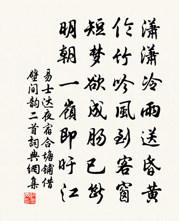 詩詞名句歷史字典書法欣賞書法字典國語詞典說文解字康熙字典古漢語字典標 題 作 者 詩 句 夜宿合塘鋪借壁間韻二首作者:易士達 朝代:宋代夜宿合塘鋪借壁間韻二首原文瀟瀟冷雨送昏黃,倫竹吟風到客窗。短夢欲成腸已斷,明朝一嶺即旴江。詩詞問答問:夜宿合塘鋪借壁間韻二首的作者是誰?答:易士達問:夜宿合塘鋪借壁間韻二首寫於哪個朝代?答:宋代易士達夜宿合塘鋪借壁間韻二首書法欣賞夜宿合塘鋪借壁間韻二首書法作品詩詞推薦春夢白玉蟾〔宋代〕我亦頻年飲大苛,吟髭撚盡為詩魔。夜來斗轉參橫後,夢在吳頭楚尾多。所喜江山無病痛,可憐故舊半消磨。水車吳良貴雪中歸方鳳〔宋代〕別時 * 映郊扉,轉眼寒風颳毳衣。豐瑞正當三白見,修程適自四明歸。因思水國銀兼浪,勝看山鄉玉作圍。老去狡童佚名〔先秦〕彼狡童兮,不與我言兮。維子之故,使我不能餐兮。彼狡童兮,不與我食兮。維子之故,使我不能息兮。寒食清明十首劉克莊〔宋代〕唐朝知制誥,多付與詩人。豈有飛花句,虛為起草臣。偶題二首劉克莊〔宋代〕自幼耽章句,年高竟未工。自稱豁達老,人號囁嚅翁。望江南/憶江南吳文英〔宋代〕三月暮,花落更情濃。人去鞦韆閒掛月,馬停楊柳倦嘶風。堤畔畫船空。懨懨醉,長日小簾櫳。宿燕夜歸銀燭外,索莫張耒〔宋代〕索莫歸未得,閒雲還滿空。愁吟對寒月,不睡到晨鐘。衣喜初冬寄,書憐手自封。何當聽夜雪,暖酒夜爐紅。句荊州僧〔唐代〕犬熟護鄰房。題可久上人房素屏強至〔宋代〕雕軒畫室吳僧居,花草禽魚屏面集。豈如蕭爽大士堂,雪山數尺平頭立。滿齋虛白已自生,隔坐紛華不容入。霜毫承天寶禪師贊黃庭堅〔宋代〕靈山會上,得個訊息。達安城中,不落裷(上雨下佰)。黃撫路口,雪裡開花。九江渡頭,無風起浪。和用明梅十三絕胡寅〔宋代〕指數春回驅歲寒,催令花落鼻先酸。要須晴昊開芳草,亂插繁華足意看。書懷寄元郎中張籍〔唐代〕轉覺人間無氣味,常因身外省因緣。經過獨愛游山客,計校唯求買藥錢。重作學官閒盡日,一離江塢病多年。吟君書弋陽館陳康伯〔宋代〕憶昨東京拜相時,武夫前導爭驅馳。上奏天子一人命,下率百寮羅綱維。泰階賜膳侑金幣,上食供進黃門賁。夜來哭刑部侍郎喬公詩徐鉉〔唐代〕舉世重文雅,夫君更質真。曾嗟混雞鶴,終日異淄磷。詞賦離騷客,封章諫諍臣。襟懷道家侶,標格古時人。逸老西溪僧舍書臥孫應時〔宋代〕燕子風微春書長,獨攜書卷臥禪房。悠然一笑無人領,只有薔薇滿院香。江水楊萬里〔宋代〕水色本正白,積深自成綠。江妃將底藥,軟此千里玉。詩人酒未醒,快吸一川淥。無物燕清甘,和露嚼野菊。古風其四十八李白〔唐代〕秦皇按寶劍。赫怒震威神。逐日巡海右。驅石駕滄津。 征卒空九寓。作橋傷萬人。但求蓬島藥。豈思農扈春。力度清霄張繼先〔宋代〕獨自行兮獨自坐。獨自歌兮獨自和。日日街頭走一過。我不識吾誰識我。人間旦暮自四時。玄中訊息不推移。覿面讀德操詩文吳則禮〔宋代〕平生饒德操,飽讀世上書。坐斷諸方舌,脊樑儂不如。去耕鄧州田,要作青鞋錢。忽然騎聖僧,吾子真天然。胸中禪人並化主寫真求贊釋正覺〔宋代〕閒雲之動,野水之流。體萬像之平等,了一身而自由。機輪無滯兮,鑿枘相投。名句推薦白白與紅紅,別是東風情味。嚴蕊《如夢令·道是梨花不是》 知者順時而謀,愚者逆理而動范曄《後漢書·列傳·朱馮虞鄭周列傳》 粉骨碎身全不怕,要留清白在人間。于謙《石灰吟》 故園東望路漫漫,雙袖龍鍾淚不乾。岑參《逢入京使》 淇澳春雲碧,瀟湘夜雨寒。憨山德清《詠竹五首》 山桃紅花滿上頭,蜀江春水拍山流。劉禹錫《竹枝詞·山桃紅花滿上頭》 一物不成,兩物見在。施耐庵《水滸傳·第十二回二》 才過清明,漸覺傷春暮。李冠《蝶戀花·春暮》 長安白日照春空,綠楊結煙垂裊風。李白《陽春歌》 三日柴門擁不開,階平庭滿白皚皚。柳宗元《酬王二十舍人雪中見寄》