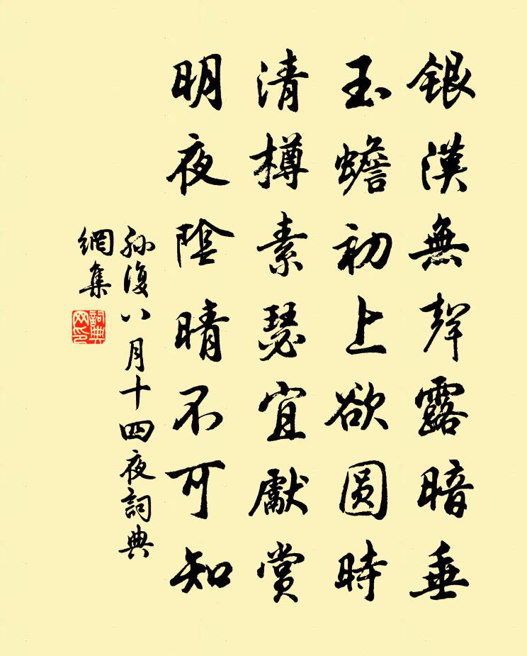 詩詞名句歷史字典書法欣賞書法字典國語詞典說文解字康熙字典古漢語字典標 題 作 者 詩 句 八月十四夜作者:孫復 朝代:宋代八月十四夜原文銀漢無聲露暗垂,玉蟾初上欲圓時。清樽素瑟宜先賞,明夜陰晴不可知。詩詞問答問:八月十四夜的作者是誰?答:孫復問:八月十四夜寫於哪個朝代?答:宋代孫復八月十四夜書法欣賞八月十四夜書法作品詩詞推薦蝶戀花周邦彥〔宋代〕小閣陰陰人寂後。翠幕褰風,燭影搖疏牖。夜半霜寒初索酒。金刀正在柔荑手。彩薄粉輕光欲透。小葉尖新,未放列女操 / 烈女操孟郊〔唐代〕梧桐相待老,鴛鴦會雙死。貞女貴徇夫,捨生亦如此。波瀾誓不起,妾心古井水。題阮孚墓鞏豐〔宋代〕千古高風挽不回,故山花落又花開。莫欺亭畔蒼蒼鮮,曾印高人屐齒來。【越調】小桃紅_○題情佚名〔元代〕○題情 暗思金屋配合春嬌,是那一點花星照也。向這歡娛中深埋了禍根苗,我一從見了那個妖嬈,他便和咱燕早春書事薛能〔唐代〕百蠻降伏委三秦,錦里風回歲已新。渠濫水泉花巷濕,日銷冰雪柳營春。何年道勝蘇群物,盡室天涯是旅人。焚卻叔弼雲履常不飲故不作詩勸履常飲蘇軾〔宋代〕我本畏酒人,臨觴未嘗訴。平生坐詩窮,得句忍不吐。吐酒茹好詩,肝胃生滓污。用此較得喪,天豈不足付。吾儕春晚留淮上吳龍翰〔宋代〕淮山歷歷春雲澹,淮水湯湯夜月輝。此處杜鵑啼不到,江南行客未成歸。和學士秋懷一十五首李彌遜〔宋代〕官居城郭枕山根,嬉語兒童亦帶村。老子痴頑甘避俗,欲從社叟學方言。春霽花萼樓南聞宮鶯楊凌〔唐代〕祥煙瑞氣曉來輕,柳變花開共作晴。黃鳥遠啼鳷鵲觀,春風流出鳳凰城。臨高台三首吳沆〔宋代〕高台跨崇岡,檐宇鎖空霧。新晴洗雙目。十里在跬步。霏霏漁蒲煙,冉冉富春樹。風花不我私,何以理愁緒。誰梳和致仕沈郎中李建勛〔唐代〕欲謀休退尚因循,且向東溪種白蘋。謬應星辰居四輔,終期冠褐作閒人。城中隔日趨朝懶,楚外千峰入夢頻。殘照送王主簿游南海張登〔唐代〕平生推久要,留滯共三年。明日東南路,窮荒霧露天。曠懷常寄酒,素業不言錢。道在貧非病,時來醜亦妍。過山題張獲軒詩卷吳子實〔宋代〕句法親傳得,江湖老獲軒。推敲深得趣,窮達可曾論。好爵無三字,清名有五言。還知綺奇處,難弟復難昆。八聲甘州佚名〔宋代〕一團春雪,拋在玉爐中煎。炎炎進火不住添。要曉得通紅無焰煙。須管莫虧折,斤兩依然。如此三千。鍛鍊待不搖偶題曹鄴〔唐代〕白玉先生多在市,青牛道士不居山。但能共得丹田語,正是忙時身亦閒。句馮杞〔宋代〕人物英雄故沔州,嶓岷千古奉雙流。傷逝三首趙文〔宋代〕老人不哭自銷魂,況復長號病眼昏。終日哭聲那可聽,一聲聲有一般言。寄華山僧賈島〔唐代〕遙知白石室,松柏隱朦朧。月落看心次,雲生閉目中。五更鐘隔岳,萬尺水懸空。苔蘚嵌岩所,依稀有徑通。持敬齋吟金朋說〔宋代〕恭己時存養,敬以充四端。唯狂能克念,作聖抑何難。送子云五首韓元吉〔宋代〕水闊湖南道,春深可當游。鳥聲喧綠樹,花影趁行舟。短袖那容舞,良疇不易謀。有親垂白髮,斂板未應羞。名句推薦不剪春衫愁意態,過收燈、有些寒在史達祖《夜行船·正月十八日聞賣杏花有感》 別有根芽,不是人間富貴花。納蘭性德《採桑子·塞上詠雪花》 三日柴門擁不開,階平庭滿白皚皚。柳宗元《酬王二十舍人雪中見寄》 白日光天兮無不曜,江左 一隅獨未照。魏收《魏書·列傳·卷四十四》 別來幾春未還家,玉窗五見櫻桃花。李白《久別離》 千古英雄同一嘆,傷懷豈止為蛾眉沈約《昭君辭》 花時同醉破春愁,醉折花枝作酒籌。白居易《同李十一醉憶元九》 飛鴻過也。萬結愁腸無晝夜。蔣氏女《減字木蘭花·題雄州驛》 便向夕陽影里,倚馬揮毫。納蘭性德《風流子·秋郊即事》 風遞幽香出,禽窺素艷來。齊己《早梅》