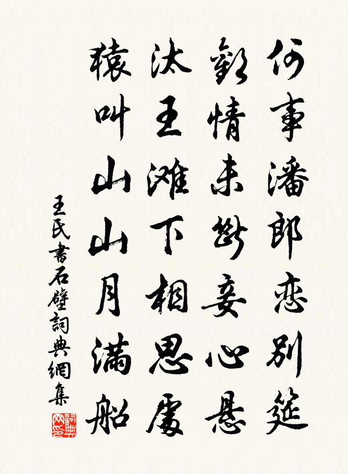 詩詞名句歷史字典書法欣賞書法字典國語詞典說文解字康熙字典古漢語字典標 題 作 者 詩 句 書石壁作者:王氏 朝代:宋代書石壁原文何事潘郎戀別筵,歡情未斷妾心懸。汰王灘下相思處,猿叫山山月滿船。詩詞問答問:書石壁的作者是誰?答:王氏問:書石壁寫於哪個朝代?答:宋代問:書石壁是什麼體裁?答:七絕王氏書石壁書法欣賞書石壁書法作品注釋全唐詩:卷799-17詩詞推薦善利閣次伯仁所題趙子良畫四首裘萬頃〔宋代〕扁舟兩漁翁,清唱發日暮。安得如鴟夷,相與五湖去。採藥潘匯征〔宋代〕採藥歸來抱膝吟,煙霞情 * 山林。不留蹤跡在圖畫,三十六峰何處尋。山坡羊·驪山懷古張養浩〔元代〕驪山四顧,阿房一炬,當時奢侈今何處?只見草蕭疏,水縈紆。至今遺恨 * 樹。列國周齊秦漢楚,贏,都變做了極相思蔡伸〔宋代〕相思情味堪傷。誰與話衷腸。明朝見也,桃花人面,碧蘚迴廊。別後相逢唯有夢,夢回時、展轉思量。不如早睡,秋感毛直方〔宋代〕宇宙百年身,江湖萬里心。世情高枕遠,詩味閉門深。白髮銷窮達,青山傲豐今。情知秋亦客,何事感秋吟。菩薩蠻張桂〔宋代〕東風忽驟無人見。玉塘煙浪浮花片。步濕下香階。苔黏金鳳鞋。翠鬟愁不整。臨水閒窺影。摘得野薔薇。游蜂相趁挽沈提刑李石〔宋代〕金馬堂堂有陸沉,斯人出處可重尋。豸冠議論回天力,繡節平反念母心。一代師承無別派,百年朋舊托遺音。便當蝶戀花趙令畤〔宋代〕尺素重重封錦字。未盡幽閨,別後心中事。佩玉采絲文竹器。願君一見知深意。環玉長圓絲萬系。竹上斕斑,總是自贊釋慧性〔宋代〕紫霄峰下,以毒攻毒。撒土拋沙,拗直作曲。撼動四大神州,拳踢掀翻地軸。性禪沒興遭逢,切忌望空呵{左口右入蒲關先寄秦中故人岑參〔唐代〕秦山數點似青黛,渭上一條如白練。京師故人不可見,寄將兩眼看飛燕。第二百卷避亂柯岩綠坡諸公以詩見寄王鎡〔宋代〕柯栝各西東,音書久不通。山河隔今古,天地老英雄。局敗橫難著,愁多酒易中。花前多少恨,無語寄春風。出郊李流謙〔宋代〕頗愛晚涼出,適當秋霽初。豐年田父語,喬木野人廬。畦稻根根直,池荷葉葉疎。冷官無事業,歸舍了殘書。題開聖寺李涉〔唐代〕宿雨初收草木濃,群鴉飛散下堂鍾。長廊無事僧歸院,盡日門前獨看松。南鄉子陳師道〔宋代〕急雨打寒窗。雨氣侵燈暗壁缸。窗下有人挑錦字,行行。淚濕紅綃減舊香。往事最難忘。更著秋聲說斷腸。曲渚圓詠迎春黃胖韓某〔宋代〕腳踏虛空手弄春,一人頭上要安身。忽然線斷兒童手,骨肉都為陌上塵。拋球樂長筌子〔元代〕細開根基妙道,幾人深知。自大朴初分,剖散洪ㄨ,畫八卦帝尊伏犧。辨百草、功顯神農,播稼穡、德布華夷。次舟行到{上艹右羊}莪和清老韻王炎〔宋代〕詩中巧手妙穿楊,便可階升屈宋堂。句挾冰霜堪卻暑,令人心地亦清涼。風雨中望峽口諸山奇甚戲作短歌陸游〔宋代〕白鹽赤甲鹽天下雄,鹽拔地突兀鹽摩蒼穹,鹽凜然猛士撫長劍,空有豪健無雍容,不令氣象少渟滀,常恨天地無全水龍吟蘇軾〔宋代〕小溝東接長江,柳堤葦岸連雲際。煙村瀟灑,人閒一哄,漁樵早市。永晝端居,寸陰虛度,了成何事。但絲蓴玉藕自昌化雙溪館下步尋溪源至治平寺二首蘇軾〔宋代〕亂山滴翠衣裘重,雙澗響空窗戶搖。飽食不嫌溪筍瘦,穿林閒覓野芎苗。卻愁縣令知游寺,尚喜漁人爭渡橋。正似名句推薦阿婆還似初笄女,頭未梳成不許看。袁枚《遣興》 江山留勝跡,我輩復登臨。孟浩然《與諸子登峴山》 勝地不常,盛筵難再;蘭亭已矣,梓澤丘墟。王勃《滕王閣序》 蘭生幽谷,不為莫服而不芳。舟在江海,不為莫乘而不浮。君子行義,不為莫知而止休。劉安及其門客《淮南子·說山訓》 落花有淚因風雨,啼鳥無情自古今。屈大均《壬戌清明作》 城上高樓接大荒,海天愁思正茫茫。柳宗元《登柳州城樓寄漳汀封連四州》 出政施教,賞善罰暴。墨子《墨子·37章 非命(下)》 紫泉宮殿鎖煙霞,欲取蕪城作帝家。李商隱《隋宮》 隱約遙峰,和淚謝娘眉嫵。史達祖《綺羅香·詠春雨》 寧戀本鄉一捻土,莫愛他鄉萬兩金。吳承恩《西遊記·第十二回》