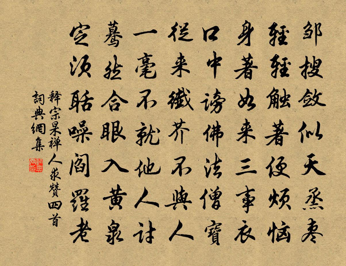 詩詞名句歷史字典書法欣賞書法字典國語詞典說文解字康熙字典古漢語字典標 題 作 者 詩 句 禪人求贊四首作者:釋宗杲 朝代:宋代禪人求贊四首原文鄒搜斂似天烝棗,輕輕觸著便煩惱。身著如來三事衣,口中謗佛法僧寶。從來纖芥不與人,一毫不就他人討。驀然合眼入黃泉,定須聒噪閻羅老。詩詞問答問:禪人求贊四首的作者是誰?答:釋宗杲問:禪人求贊四首寫於哪個朝代?答:宋代釋宗杲禪人求贊四首書法欣賞禪人求贊四首書法作品詩詞推薦戒壇周文璞〔宋代〕相君孫女小乘僧,身入只園佛律行。 * 戒壇秋色冷,箇中螻蟻亦長生。酬張太祝晚秋臥病見寄白居易〔唐代〕高才淹禮寺,短羽翔禁林。西街居處遠,北闕官曹深。君病不來訪,我忙難往尋。差池終日別,寥落經年心。露濕縣齋十詠載榮桐寧參〔宋代〕幾年惟悴質,一旦類生稊。玉甃青初滿,銀床綠乍齊。雅勝玄雨潤,高稱嶧陽低。況有蒼姬葉,還當副剪圭。贈潘尼詩陸機〔魏晉〕水會于海。雲翔於天。道之所混。孰後孰先。及子雖殊。同升太玄。舍彼玄冕。襲此雲冠。遺情市朝。永志丘園。憶京雒木芍藥三絕蘇籀〔宋代〕廬陵涑水攜參佐,媚紫嬌黃左與姚。何物山丹炫流俗,雒生懊惱慍蓬飄。頌釋真慈〔宋代〕撥塵見佛,佛亦是塵。問了答了,直下翻身。陳待制湖樓趙師秀〔宋代〕何處飛來縹緲中,人間惟有畫圖同。兩層簾幕垂無地,一片笙簫起半空。岩竹倒添秋水碧,渚蓮平接夕陽紅。遊人道見蓼花范成大〔宋代〕秋風裊裊露華鮮,去歲如今刺釣船。歙縣門西見紅蓼,此身曾在白鷗前。歌寄留英禪德釋重顯〔宋代〕當時臨際辭黃蘗,或指河南或河北。英禪此日下中峰,機案曾焚笑仍則。九包一角慚稱瑞,導月觀星亦非意。爭似題楊叔雅水墨百花圖方回〔宋代〕梅梢前後兩枝春,春世中間各寫真。忽見花王大如斗,始知天地有君臣。戀繡衾(或送肉色牡丹同賦)劉辰翁〔宋代〕困如宿酒猶未銷。滿華堂、羞見目招。忽折向、西鄰去,教旁人、看上馬嬌。肉色似花難可得,但花如、肉色妖嬈自訟鄭剛中〔宋代〕我昔岔地冬少袴,四壁亦無惟有柱。自從腳蹈官職場,暖及奴胥妻子飫。線因針入敢忘針,入室古雲當見妒。雲衢赴楚州次自田途中阻淺,問張南史劉長卿〔唐代〕楚城今近遠,積靄寒塘暮。水淺舟且遲,淮潮至何處。皂鏡冊傅夢得〔宋代〕依然一冊巧裝成,故紙為胎越樣輕。四畔黑雲都罩盡,中間只有月長明。彭公堂郭印〔宋代〕一瞻遺像起遐思,慶曆風流想見之。政化寬平無後日,文詞純質似當時。溪山寂寂人何在,林沼依依澤未衰。堂共山村王銍〔宋代〕家依溪口破殘村,身伴渡頭零落雲。更向空山拾黃葉,姓名那有世人聞。蠟梅二首張鎡〔宋代〕金谷園中夜罷炊,照花滴蠟上林枝。清芬更比寒梅耐,不是蜂房供蜜脾。重到城東有感三首鄭獬〔宋代〕曾訪花翁醉玉壺,重來花下盡平蕪。東風繞袖應相識,記得當年舊酒徒。右寄此詩後忽得簡雲兒曹亦寄五言用韻畢同殆姜特立〔宋代〕天性固自同,學問亦有源。胡為兩章句,韻韻皆蟬聯。有如五音作,琴瑟隨宮懸。排比不亂行,又似貫珠然。竊意贈道士參寥孟浩然〔唐代〕蜀琴久不弄,玉匣細塵生。絲脆弦將斷,金徽色尚榮。知音徒自惜,聾俗本相輕。不遇鍾期聽,誰知鸞鳳聲。名句推薦露清枕簟藕花香,恨悠揚。顧敻《虞美人·觸簾風送景陽鍾》 微吟不道驚溪鳥,飛入亂雲深處啼。沈周《題畫》 棄捐勿復道,努力加餐飯。佚名《行行重行行》 爭渡,爭渡,驚起一灘鷗鷺。李清照《如夢令·常記溪亭日暮》 柳條百尺拂銀塘,且莫深青只淺黃。楊萬里《新柳》 記得那年花下,深夜,初識謝娘時。韋莊《荷葉杯·記得那年花下》 古木陰中系短篷,杖藜扶我過橋東。志南《絕句》 江頭宮殿鎖千門,細柳新蒲為誰綠?杜甫《哀江頭》 莫辭秉燭通霄坐,明日相思隔隴煙。王守仁《諸門人送至龍里道中二首》 萬里煙塵。回首中原淚滿巾。朱敦儒《採桑子·彭浪磯》