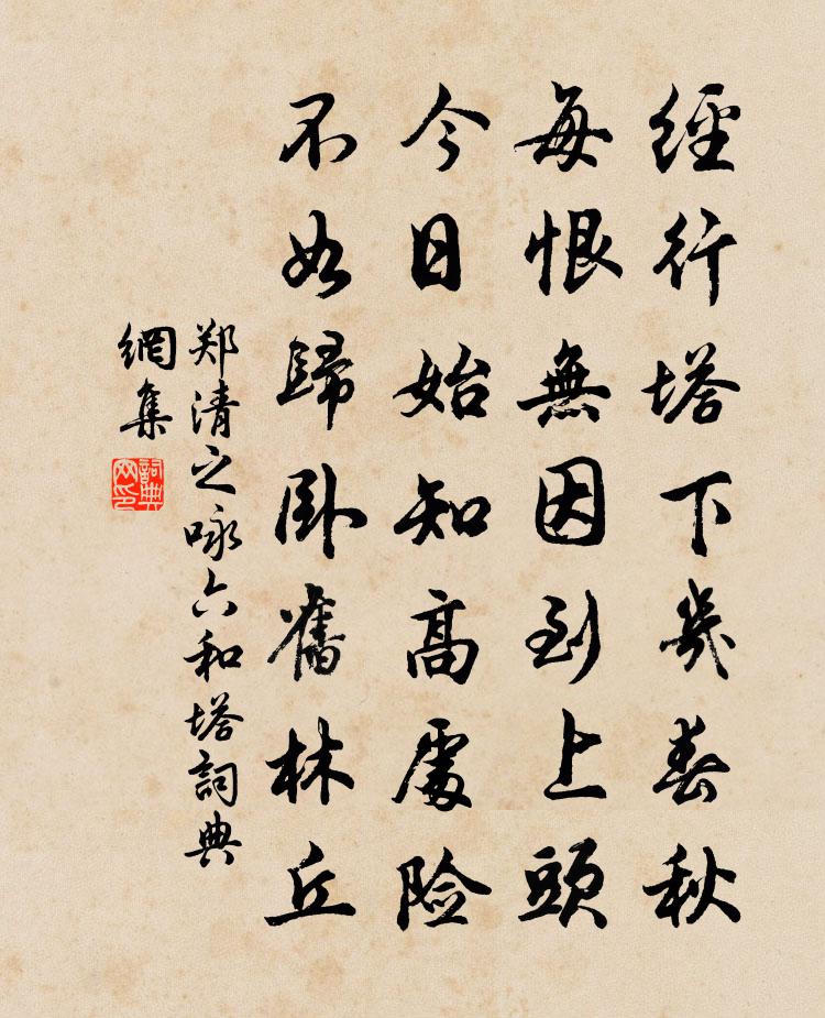 詩詞名句歷史字典書法欣賞書法字典國語詞典說文解字康熙字典古漢語字典標 題 作 者 詩 句 詠六和塔作者:鄭清之 朝代:宋代詠六和塔原文經行塔下幾春秋,每恨無因到上頭。今日始知高處險,不如歸臥舊林丘。詩詞問答問:詠六和塔的作者是誰?答:鄭清之問:詠六和塔寫於哪個朝代?答:宋代鄭清之詠六和塔書法欣賞詠六和塔書法作品詩詞推薦言志獻浙東廉訪辭召徐靈府〔唐代〕野性歌三樂,皇恩出九重。那煩紫宸命,遠下白雲峰。多愧書傳鶴,深慚紙畫龍。將何佐明主,甘老在岩松。贈南豐宰趙虛齋二章利登〔宋代〕有口寧食薇,有身寧衣褐。居然觀八荒,獨立招皓月。清風亦知人,蕭蕭動幽樾題玉泉張伯玉〔宋代〕靈源曾記古篇章,飛入霜筠萬丈長。六月林風吹寶瑟,九秋山翠坼銀潢。試茶石鼎雲含液,釀酒兵廚菊有香。到此雨霖鈴王吉昌〔元代〕萬綠心歇。放神情和暢,痼疾蟄窟。清虛道業修崇,蠕神息、運無倉卒。七曜迎真虛室潔,冷輝冰骨。鎮九天、十獨游虎跑泉小庵范成大〔宋代〕苔徑彎環入,茅齋取次成。蔓花緣壁起,閒草上階生。宿雨松篁色,新晴燕雀聲。筒泉烹御米,聊共老僧傾。皇甫真人像贊宋高宗〔宋代〕皇甫高士,眉字列仙。以道興世,孰計其年。閒雲在空,孤鶴行天。掀髯一笑,同乎自然。聽段處士彈琴方乾〔唐代〕幾年調弄七條絲,元化分功十指知。泉迸幽音離石底,松含細韻在霜枝。窗中顧兔初圓夜,竹上寒蟬盡散時。唯有頌古十首釋行鞏〔宋代〕學洚波瀾卷未乾,幾煩仙屐上林巒。天香吹落秋風老,不覺相攜到廣寒。法雲寺雙檜(一作晉朝柏樹)溫庭筠〔唐代〕晉朝名輩此離群,想對濃陰去住分。題處尚尋王內史,畫時應是顧將軍。長廊夜靜聲疑雨,古殿秋深影勝雲。一下好事近(次曹提管春行)洪咨夔〔宋代〕二十四番風,才見一番花鳥。已是有人春瘦,正遠山橫峭。踏青底用十分晴,半陰晴方好。深院日長睡起,又海棠題衢州石壁寺徐照〔宋代〕岩上橫生脈,平林一里溪。眾船寒渡集,高寺遠山齊。殘磬吹風斷,眠禽壓竹低。自嫌昏黑至,難認壁間題。筇竹頌黃庭堅〔宋代〕偉邛崍之美竹,初發跡於(左牛右羊)(左牛右可)。有山而不險,有水而無波。金聲而玉節,故貫四時而不改其送家安國赴成都教授三絕蘇轍〔宋代〕石室多年款志平,新書久溷里中生。遣師今見朝廷意,文律還應似兩京。和傅山父小園十詠李曾伯〔宋代〕著我數椽浮翠碧,借公一水漾琉璃。心閒境樂鎮長好,拈起風光總是詩。題李彭州南亭魏了翁〔宋代〕花木精神面面全,誰將好景作南園。栗留枝上春風思,鶗鴃聲中曉屐痕。檐外梅礬兄及弟,檻前竹鶴子生孫。我今阻風累日泊寶積山下張耒〔宋代〕繫船淮北雨如軸,繫船淮南風斷橋。客行有期日月疾,歲事欲晚霰雪驕。山根浪頭作雷吼,縮手敢試舟師篙。不用贈張駉陳必復〔宋代〕乍見語相合,苦吟心更親。老於琴得趣,隱與牧為鄰。一夜檐花雨,十年江樹春。所交半湖海,恨晚識斯人。感遇其一李白〔唐代〕吾愛王子晉,得道伊洛濱。金骨既不毀,玉顏長自春。可憐浮丘公,猗靡與情親。舉首白日間,分明謝時人。二仙杭州過璘上人花圃蔡襄〔宋代〕封培剪剝奪天工,欄下長年見萬紅。投老暗知心力少,自開還落信春風。夜坐有感年四十陳文蔚〔宋代〕仲尼切戒取人惡,隈子真能不動心。嗟我痴頑何所得,但能於此惜分陰。名句推薦賞必加於有功,刑必斷於有罪。劉向《戰國策·秦三·范子因王稽入秦》 流水孤村,荒城古道。陳霆《踏莎行·晚景》 冬夜夜寒覺夜長,沉吟久坐坐北堂。李白《夜坐吟》 一身報國有萬死,雙鬢向人無再青。陸游《夜泊水村》 凡軍欲其眾也,心欲其一也,三軍一心則令可使無敵矣。李昉、李穆、徐鉉《太平御覽·兵部·卷二》 驛寄梅花,魚傳尺素。秦觀《踏莎行·郴州旅舍》 人散市聲收,漸入愁時節。劉克莊《生查子·元夕戲陳敬叟》 花滿河陽,為君羞褪晨妝茜。吳文英《燭影搖紅·賦德清縣圃古紅梅》 雲和積雪蒼山晚,煙伴殘陽綠樹昏。周朴《春日秦國懷古》 為奏薰琴唱,仍題寶劍名。張九齡《奉和聖制送尚書燕國公赴朔方》