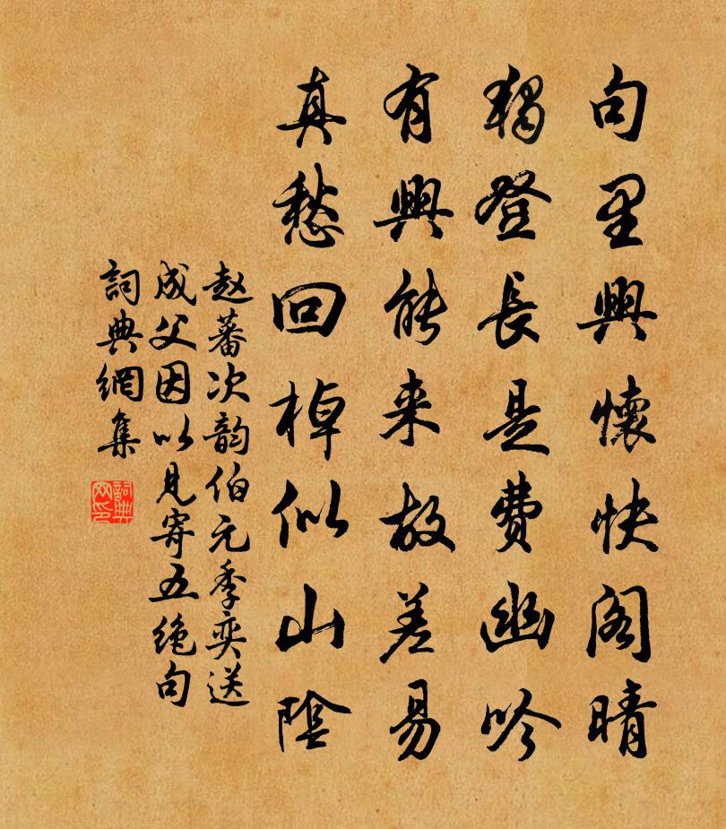 詩詞名句歷史字典書法欣賞書法字典國語詞典說文解字康熙字典古漢語字典標 題 作 者 詩 句 次韻伯元季奕送成父因以見寄五絕句作者:趙蕃 朝代:宋代原文句里興懷快閣晴,獨登長是費幽吟。有興能來故差易,真愁回棹似山陰。詩詞問答問:《次韻伯元季奕送成父因以見寄五絕句》的作者是誰?答:趙蕃問:該詩寫於哪個朝代?答:宋代書法欣賞次韻伯元季奕送成父因以見寄五絕句書法作品詩詞推薦次韻王定國得潁倅二首蘇軾〔宋代〕仙風入骨已凌雲,秋水為文不受塵。一噫固應號地籟,餘波猶足掛天紳。買牛但自捐三尺,射鼠何勞挽六鈞。莫向亨道至能對棋月下文振聞後堂歌聲逃席而起方岳〔宋代〕高梧動涼吹,月色如新磨。吾儕冰雪胸,如此良夜何。二客信不凡,一局欲燦柯。中庭人語寂,玉佩鳴相摩。勝士寄左次魏二首劉克莊〔宋代〕同事征西府,聞君已繡衣。小侵今視昔,大捷是耶非。酋長輿屍返,偏裨奏凱歸。六關天樣險,莫遣賊飛能。洋州三十景二樂榭鮮于侁〔宋代〕珍躋積翠外,絺結穹隆間。軒檻最佳處,四顧惟江山。淮上雜詩六首梅堯臣〔宋代〕舟閣下灘遲,蒼黃暮灘上,偏愁逆水風,更駕崩沙浪。落日看已昏,漁燈遠相向。夜闌天轉寒,坐待潮流漲。贈山老借館程公許〔宋代〕三生雲水僧,失腳困下吏。每逢道人語,莫逆猶夙嗜。況茲當龍象,共飲良有味。寶坊寄囂氛,一室淡如水。蹇驢重午餉菜楚俗也鄧撫乾以詩來謝次韻答之三首項安世〔宋代〕大家朱書亭午時,人家艾人張天師。惟有書生最窮餓,盤中日出菜離離。泛舟晚出北關趙企〔宋代〕舟泛寒塘靜,人歸一葉間。影疏行處柳,青遠望中山。道在身從老,詩窮意覺閒。到家秋斂足,有謂庵柴關。鷓鴣天(為老人壽)洪咨夔〔宋代〕天理從來屈有信。東風到處物皆春。門前驄馬權奇種,台上慈烏反哺心。花島屐,柳湖尊。好將長健傲長貧。諸孫臨刈旱苗二首鄭剛中〔宋代〕黃梅雨斷水如湯,百日連秋苦亢陽。所在自應知孝婦,孰雲今尚有弘羊。沛然天澤因誰靳,蠢爾黎民重可傷。罪己石塘感舊十絕劉克莊〔宋代〕比丘會泣別瞿曇,秦失三號吊老聃。自笑此翁非鐵漢,白頭來此哭同參。送司空文明歸江上舊居李端〔唐代〕野菊有黃花,送君千里還。鴻來燕又去,離別惜容顏。流水通歸夢,行雲失故關。江風正搖落,宋玉莫登山。題瑞岩惺惺石謝伋〔宋代〕寧復露稜角,明心不受欺。千年誰可轉,空照是宗師。挽俞致政洪咨夔〔宋代〕涉世萬緣薄,愛書雙眼明。身從平處立,道向拙中生。啖蔗何妨晚,栽槐恰待榮。偈成投筆去,天闊暮雲橫。自笑陸游〔宋代〕自笑謀生事事疏,年來錐與地俱無。平章春韭秋菘味,拆補天吳紫鳳圖。食肉定知無骨相,珥貂空自逛頭顱。惟余金山張栻〔宋代〕萬頃洪濤里,巍然閱古今。雲煙三島接,花木四時深。亂石維舟住,西風倚檻吟。朝宗知不斷,淒切此時心。次韻家叔陳與義〔宋代〕袞袞諸公車馬塵,先生孤唱發陽春。黃花不負秋風意,白髮空隨世事新。閉戶讀書真得計,戴餚從學豈無人。只應偈頌一百一十七首釋紹曇〔宋代〕二月十五,瞿曇滅度。山鳥悲春,山花泣雨。盡大地人,有屈無伸處。獨有瑞嚴拄杖子,鐵作心腸渾不顧。唱玉平送從叔書記山陰隱居李洞〔唐代〕山頂絕茅居,雲泉繞枕虛。燒移僧影瘦,風展鷺行疏。隆中蘇軾〔宋代〕諸葛來西國,千年愛未衰。今朝游故里,蜀客不勝悲。誰言襄陽野,生此萬乘師。山中有遺貌,矯矯龍之姿。龍蟠名句推薦林花謝了春紅,太匆匆。無奈朝來寒雨晚來風。李煜《相見歡·林花謝了春紅》 綠暗紅稀春已暮,燕子銜泥,飛入垂楊處。葛長庚《鳳棲梧·綠暗紅稀春已暮》 莫失莫忘,仙壽恆昌。曹雪芹《紅樓夢·第八回》 居身務期質樸,教子要有義方。朱柏廬《朱子家訓·全文》 斷送一生憔悴,只銷幾個黃昏。趙令畤《清平樂·春風依舊》 白梅懶賦賦紅梅,逞艷先迎醉眼開。曹雪芹《詠紅梅花得“梅”字》 夜寒微透薄羅裳,無限思量。秦觀《畫堂春·春情》 朝雲亂人目,帝女湘川宿。吳均《登二妃廟》 此去經年,應是良辰好景虛設。柳永《雨霖鈴·寒蟬淒切》 流水本自斷人腸,堅冰舊來傷馬骨。盧思道《從軍行》