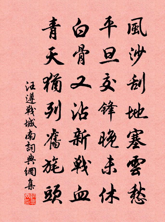 詩詞名句歷史字典書法欣賞書法字典國語詞典說文解字康熙字典古漢語字典標 題 作 者 詩 句 戰城南作者:汪遵 朝代:唐代戰城南原文風沙刮地塞雲愁,平旦交鋒晚未休。白骨又沾新戰血,青天猶列舊旄頭。詩詞問答問:戰城南的作者是誰?答:汪遵問:戰城南寫於哪個朝代?答:唐代問:戰城南是什麼體裁?答:七絕汪遵戰城南書法欣賞戰城南書法作品注釋全唐詩:卷602-41詩詞推薦真游覓唐輿題詩不見有懷其人八首趙蕃〔宋代〕雨後林園合,風前裘褐輕。當游元不惡,有士與同行。定識田中趣,殊勝俗里情。誰過江驛靜,日聽筍輿聲。蟬潘牥〔宋代〕秋事遽如許,空山夜已蟬。多吟清露底,偏傍竹籬邊。翼似霜余葉,聲如雨後泉。兒曹讀書罷,貪聽不成眠。夜寒鄭剛中〔宋代〕獵獵風吹屋上茅,夜寒都在早梅梢。明朝管取東窗暖,又看羲經過一爻。春雪二首張耒〔宋代〕春雲驕不行,凍雨作飛雪。夜深歸無燭,已覺馬蹄滑。那知事未已,通夕注不歇。堂寒曉附火,檐滴更清絕。前者臥病月余呈子由二首張耒〔宋代〕蔀室悠悠昏復朝,強披莊子說逍遙。四禪未到風猶梗,九轉無功火不燒,學道若為調鹿馬,是身不實似芭蕉。丹砂次昌叔韻王安石〔宋代〕寄公無國寄鍾山,垣屋青松晻靄間。長以聲音為佛事,野風蕭颯水潺湲。與契兄趙蕃〔宋代〕因懷碧雲友,發興青林端。要盡深幽趣,渾忘下上難。泉聲流咽絕,松韻響高寒。久作廬山別,疑從夢境看。寄希晝釋惟鳳〔宋代〕關中吟鬢改。多事與心違。客路逢人少,家書入闕稀。秋聲落晚木,夜魄透寒衣。幾想林間社,他年許共歸。春興陳以莊〔宋代〕輕衫短帽久塵埃,零落香篝愧麝煤。春半工夫花繡了,社邊訊息燕銜來。豈無綠野供千騎,幸有黃封可一杯。明日初秋閒記園池草木范成大〔宋代〕越城芳徑手親栽,紅淺黃深次第開。不用小山招陷賦,身如強健日千回。與夫同詠詩蘇檢妻〔唐代〕楚水平如鏡,周回白鳥飛。金陵幾多地,一去不知歸。題九龍巖錢懷哲〔宋代〕瀟湘行邁遇初秋,何幸因官得一游。無異體陵三室洞,九仙羽客是吾儔。偈頌一百一十七首釋紹曇〔宋代〕善護菩提樹有年,金枝玉葉蔭兒孫。大功難紀人間世,千佛名書補處尊。訪景山許伯詡〔宋代〕奉陪南極老,來慕北山名。鑒石濃書墨,流觴款敘情。問誰挹仙袂,我笑縛塵纓。知是龍門客,終難臥孔明。舟中望九華山李中〔唐代〕排空蒼翠異,輟棹看崔嵬。一面雨初歇,九峰雲正開。當時思水石,便欲上樓台。隱去心難遂,吟余首懶回。僧休寓題黃滔〔唐代〕每憶家山即涕零,定須歸老舊雲扃。銀河水到人間濁,丹桂枝垂月里馨。霜雪不飛無翠竹,鯨鯢猶在有青萍。三千同曾元恕游龍山呂穆仲不至蘇軾〔宋代〕青春不覺老朱顏,強半銷磨簿領間。愁客倦吟花以酒,佳人休唱日銜山。共知寒食明朝過,且赴僧窗半日閒。命駕山林古松釋文珦〔宋代〕古松形甚怪,得性在山林。偃蓋盤空老,流脂入地深。青霜曾換骨,野火誤燒心。材大誠難用,良工亦漫尋。偈頌一百一十七首釋紹曇〔宋代〕半夜逾場面,六年棲雪。餓得腸枯,凍得骨折。那更見明星,兩眼添重屑。後代兒孫苦證羊,一年一度爭饒舌。正都下臥中曾豐〔宋代〕屋密風傳冷,窗虛月漏明。九衢朝馬動,四壁候蟲鳴。街吏高呵道,衙官急殺更。人行吾尚臥,自分利名輕。名句推薦雨過一蟬噪,飄蕭松桂秋。杜牧《題揚州禪智寺》 心即理也。天下又有心外之事,心外之理乎王陽明《傳習錄·卷上·徐愛錄》 寄語天涯客,輕寒底用愁。于謙《除夜太原寒甚》 春近寒雖轉,梅舒雪尚飄。陰鏗《雪裡梅花詩》 論至德者不和於俗,成大功者不謀於眾。司馬遷《史記·趙世家》 子規夜半猶啼血,不信東風喚不回。王令《送春》 長風蕭蕭渡水來,歸雁連連映天沒。盧思道《從軍行》 滿載一船秋色,平鋪十里湖光。張孝祥《西江月·阻風山峰下》 古台搖落後,秋日望鄉心。劉長卿《秋日登吳公台上寺遠眺》 知而好問,然後能才。荀子《荀子·儒效》