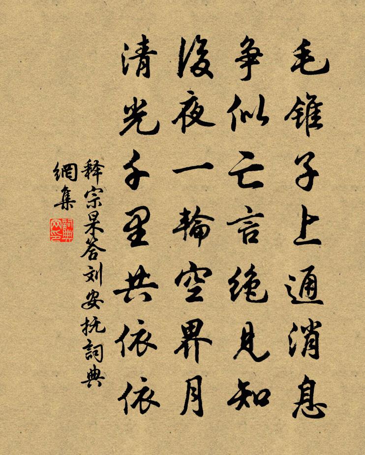 詩詞名句歷史字典書法欣賞書法字典國語詞典說文解字康熙字典古漢語字典標 題 作 者 詩 句 答劉安撫作者:釋宗杲 朝代:宋代答劉安撫原文毛錐子上通訊息,爭似亡言絕見知。後夜一輪空界月,清光千里共依依。詩詞問答問:答劉安撫的作者是誰?答:釋宗杲問:答劉安撫寫於哪個朝代?答:宋代釋宗杲答劉安撫書法欣賞答劉安撫書法作品詩詞推薦對酒作陸游〔宋代〕齒落不廢嚼,足跛尚能履。書生之所遭,僥倖有如此。自知窮事業,元不直杯水。徒行若車安,蔬食如肉美。或時秋近頗有涼意陸游〔宋代〕平旦面數箸,晡時飯一杯。枝梧長日過,悵望早秋來。團扇尋詩寫,緇巾借樣裁。惟應水邊坐,待得市船回。念奴嬌辛棄疾〔宋代〕晚風席吹雨,戰席新荷、聲席亂明珠蒼璧。誰把香奩收寶鏡,雲錦紅涵湖碧。飛鳥翻空,游魚吹浪,慣趁笙歌席。題妙庭觀陸楠〔宋代〕聞說瑤池事渺然,那知此地有飛仙。玉皇妙曲人何在,金鼎靈丹世莫傳。漫寫風姿□俗眼,空餘窟室奉爐煙。何時至啟至學慚半古才不逮人雖酷好風騷而不成文李至〔宋代〕吾家何所有,冬月勝袁安。紙帳可床暖,地爐容客寬。樹頭風勢大,窗外雪怕乾。卻念無衣者,何當度此寒。寄題殊公禪老黃雲閣二首強至〔宋代〕大士當年密行成,山居黃色有雲生。黃雲已共斯人去,飛閣猶為此地名。欲到塵埃先擺落,縱觀氣象亦崢嶸。誰雲山中曹勛〔宋代〕告才吾君得掛冠,交親猶肯問平安。連天秋色雁已過,滿檻竹聲風逗寒。對客杯盤心共醉,催人節物歲將闌。但知點絳唇邵亨貞〔元代〕萼綠仙人,孤山雪後相逢處。舊時村路。璨璨琅*樹。玉出藍田,不受纖塵*。長懷古。羅浮風度。夢逐麼禽去。【中呂】粉蝶兒 寄情人佚名〔元代〕江景蕭疏,那堪楚天秋暮,戰西風柳敗荷枯。立夕陽,空凝佇,江鄉古渡,水接天隅,眼瀰漫晚山煙樹。 【醉和鍾道士若谷投贈韻程公許〔宋代〕流年袞袞擁頭浪,蕭騷白髮三千丈。人生勞祿底須多,何嗟及矣負米養。滄溟不禁尾水匯,養素略窺道家說。庶幾百一詩 四應璩〔魏晉〕細微可不慎。堤潰自蟻穴。腠理早從事。安復勞針石。哲人覩未形。愚夫闇明白。曲突不見賓。燋爛為上客。思願和陶淵明飲酒二十首方回〔宋代〕明年五十九,早歲已聞道。憶昔初遠遊,豈信今遽老。暇日一醉娛,往事萬念槁。懸知身死後,豈無數詩好。心欲次韻韶俯李通直二首蘇軾〔宋代〕青山只在古城隅,萬里歸來卜築初。會見四山朝鶴駕,更看三李跨鯨魚。欲從抱朴傳家學,應怪中郎得異書。待我燕歌行高適〔唐代〕漢家煙塵在東北,漢將辭家破殘賊。男兒本自重橫行,天子非常賜顏色。摐金伐鼓下榆關,旌旆逶迤碣石間。校尉梅友李龍高〔宋代〕老子平生怕熱瞞,論心只可話餘酸。劉郎枉了夸豪傑,甘向伾文托歲寒。季春下澣游南龕馮伯規〔宋代〕四山如蝟毛,中有線路縈。誰人導我來,得此掌許平。雨後天宇空,夏氣和且清。休日一無事,駕言南山行。南山一笑陸游〔宋代〕半醉微吟不怕寒,江邊一笑覺天寬。莫愁艇子急沖雨,何遜梅花頻倚闌。萬事任從皮外去,百年聊作夢中觀。放翁酹江月 游句曲茅山薩都剌〔元代〕一壺幽綠,愛松陰滿地,蕊珠宮府。老鶴一聲霜襯履,隔斷人間塵土。月戶雲窗,石田瑤草,丹井飛龍虎。荼蘼花江神子/江城子蘇軾〔宋代〕相逢不覺又初寒。對尊前。惜流年。風緊離亭,冰結淚珠圓。雪意留君君不住,從此去,少清歡。轉頭山下轉頭看黃兵部生辰仲並〔宋代〕地上泉流府庫充,艱難天與歲時豐。他時若論關中漕,合數蕭何第一功。名句推薦人家見生男女好,不知男女催人老。王建《短歌行》 惟有年時芳儔在,一例差池雙剪。梁啓超《金縷曲·丁未五月歸國旋復東渡卻寄滬上諸君子》 思量舊夢,黃梅聽雨,危闌倦倚鄧廷楨《水龍吟·雪中登大觀亭》 會稽愚婦輕買臣,余亦辭家西入秦。李白《南陵別兒童入京》 窈窕淑女,君子好逑。佚名《關雎》 天下殆哉,岌岌乎。孟子《孟子·萬章章句上·第四節》 恐是仙家好別離,故教迢遞作佳期。李商隱《辛未七夕》 摘青梅薦酒,甚殘寒,猶怯薴蘿衣。湯恢《八聲甘州·摘青梅薦酒》 今日漢宮人,明朝胡地妾。李白《王昭君二首》 差若毫釐,謬以千里。魏收《魏書·列傳·卷六十六》