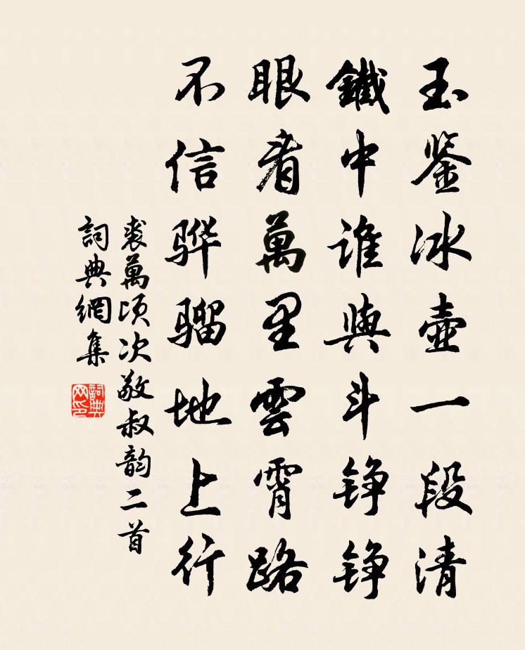 詩詞名句歷史字典書法欣賞書法字典國語詞典說文解字康熙字典古漢語字典標 題 作 者 詩 句 次敬叔韻二首作者:裘萬頃 朝代:宋代次敬叔韻二首原文玉鑒冰壺一段清,鐵中誰與斗錚錚。眼看萬里雲霄路,不信驊騮地上行。詩詞問答問:次敬叔韻二首的作者是誰?答:裘萬頃問:次敬叔韻二首寫於哪個朝代?答:宋代裘萬頃次敬叔韻二首書法欣賞次敬叔韻二首書法作品詩詞推薦感舊陸游〔宋代〕塵土暗貂裘,森然白髮稠。年光真袞袞,吾事竟悠悠。馬宿平沙夜,烽傳絕塞秋。故人零落盡,追寫只添愁。避地杜甫〔唐代〕避地歲時晚,竄身筋骨勞。詩書遂牆壁,奴僕且旌旄。行在僅聞信,此生隨所遭。神堯舊天下,會見出腥臊。過虎頭磯楊萬里〔宋代〕虎臥中流扼兩涯,目光須怒首仍回。真陽峽袖君須記,個是瞿塘灩澦堆。老人村王溉〔宋代〕山前老澤經行路,百歲翁翁猶健步。非仙非佛非鬼神,不識人間鹽與醋。嗜欲既淺亦機深,窟宅宜與仙家鄰。某獲造司空府得至便座見文禽五六夷猶曲池上毛滂〔宋代〕幾年不解向滄洲,矰繳曾傷質轉幽。端倚主人憐采色,要隨鵷鷺濯清流。行途賦得四更應詔詩庾信〔南北朝〕四更天欲曙。落月垂關下。深谷暗 * 。欹松橫礙馬。撒金錢袁綯〔宋代〕頻瞻禮。喜昇平、又逢元宵佳致。鰲山高聳翠。對端門、珠璣交制。似嫦娥降仙宮,乍臨凡世。恩露勻施,憑御欄七十翁吟七言十首方回〔宋代〕自笑衰頹七十翁,全將拙鈍易豪雄。猶賢乎已思詩苦,不失其馳飲酒恭。女嫁男婚俱失望,廷臚殿對總書空。倚樓過九疑馬大同〔宋代〕帝德於今祀萬年,如何遺像托疏椽。憑誰為假丹青手,付與梅仙十萬錢。謝銀工薛昭緯〔唐代〕一碟氈根數十皴,盤中猶更有紅鱗。早知文字多辛苦,悔不當初學冶銀。三二年來夜夢每過吾廬之西一士支家觀書飲酒陸游〔宋代〕西鄰好友工談笑,每見明知是夢中。樽酒不空書滿架,何時真得與君同?蝶戀花(送妓)姜特立〔宋代〕飄粉吹香三月暮。病酒情懷,愁緒渾無數。有個人人來又去。歸期有恨難留駐。明日尊前無覓處。咿軋籃輿,只向幕客載酒舟中即席序別文天祥〔宋代〕故人滿江海,遊子下瀟湘。夢載月千里,意行雲一方。櫓聲人語小,岸影客心長。總是浮萍跡,飛花莫近檣。雙楓浦(在瀏陽縣)杜甫〔唐代〕輟棹青楓浦,雙楓舊已摧。自驚衰謝力,不道棟樑材。浪足浮紗帽,皮須截錦苔。江邊地有主,暫借上天回。陪間荊州九日登高晏示坐中呈二帥孫應時〔宋代〕龍山東畔細腰宮,荊蜀元戎一笑同。正復樓台看戲馬,何妨絲管送飛鴻。紅萸 * 年華里,落木長江晚思中。下客蜀王登福感寺塔三首貫休〔唐代〕天資忠孝佐金輪,香火空王有宿因。此世喜登金骨塔,前生應是育王身。封疆歲暮笙歌合,襦褲正初錦繡新。釋子蠟梅三絕潘良貴〔宋代〕旦評人物尚雌黃,草木何妨定短長。試問清芳誰第一,蠟梅花冠百花香。千葉石榴鄧深〔宋代〕誰家巧歸為花謀,針絲殘零細意收。不管生紅難熨貼,從教百皺綴枝頭。夢遊海山二首蘇泂〔宋代〕紺幰行空半簇花,太真扶轡極夭斜。一聲何處寧王笛,吹入春風百萬家。月泉趙寺丞壽像贊釋慧開〔宋代〕身為皇族,名著南宮,孔孟屋裹,做模打樣。釋毛室內,談玄說空。似個般伎倆,半錢不直,又說甚道理三教俱通名句推薦不知何處火,來就客心然。沈佺期《寒食》 一看腸一斷,好去莫回頭。白居易《南浦別》 柳外斜陽,水邊歸鳥,隴上吹喬木。辛棄疾《念奴嬌·登建康賞心亭呈史致道留守》 敏捷詩千首,飄零酒一杯。杜甫《不見》 佇倚危樓風細細。望極春愁,黯黯生天際。柳永《蝶戀花·佇倚危樓風細細》 伏雨朝寒愁不勝,那能還傍杏花行。納蘭性德《浣溪沙·伏雨朝寒愁不勝》 蜀魂飛繞百鳥臣,夜半一聲山竹裂。林景熙《冬青花》 我欲乘槎,直窮銀漢,問津深入。許有壬《水龍吟·過黃河》 湘西一杯酒,渺渺紅葉換。趙蕃《次韻酬吳德夫去秋送行之作》 笑漸不聞聲漸悄,多情卻被無情惱。蘇軾《蝶戀花·春景》