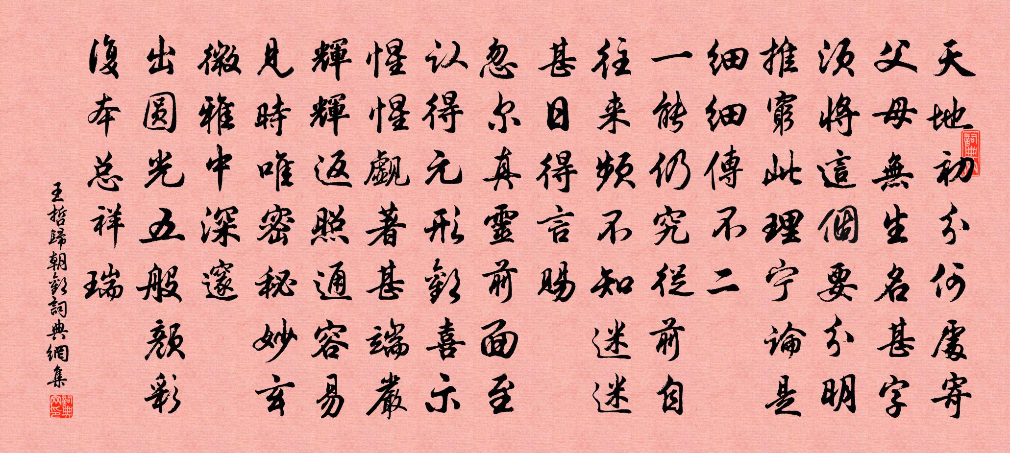 詩詞名句歷史字典書法欣賞書法字典國語詞典說文解字康熙字典古漢語字典標 題 作 者 詩 句 歸朝歡作者:王哲 朝代:元代歸朝歡原文天地初分何處寄。父母無生名甚字。須將這個要分明,推窮此理寧論是。細細傳不二。一能仍究從前自。往來頻,不知迷迷。甚日得言賜。忽爾真靈前面至。認得元形歡喜示。惺惺覷著甚端嚴,輝輝返照通容易。見時唯密秘,妙玄微雅中深邃。出圓光,五般顏彩,複本總祥瑞。詩詞問答問:歸朝歡的作者是誰?答:王哲問:歸朝歡寫於哪個朝代?答:元代問:歸朝歡是什麼體裁?答:詞王哲歸朝歡書法欣賞歸朝歡書法作品詩詞推薦次韻和長文禖祀郊外見寄並呈韓子華梅堯臣〔宋代〕鵓鴣知雨在桑中,雄逐雌飛自不同。胡粉未生輕蝶白,燕脂先綻野櫻紅。高高樹里鞦韆月,獵獵牆頭蓓蕾風。曉下秋日寇準〔宋代〕柳衰蟬噪寒煙淡,地迥山遙暮雨收。宛是昔年秋氣味,只添多病與離愁。沁園春(壽太守·十二月十三日)劉子實〔宋代〕臘後寒收,柳眼青歸,梅花笑生。正陽和有腳,日邊送暖,洪鈞換軸,天上回星。試巧春盤,介眉春酒,生意從頭盈上人許渾〔唐代〕月沉霜已凝,無夢竟寒燈。寄世何殊客,修身未到僧。二毛梳上雪,雙淚枕前冰。借問曹溪路,山多路幾層。雨陸游〔宋代〕家近蓬萊白玉京,草堂登望不勝清。初驚野色昏昏至,已見波紋細細生。殘醉頓消迎亂點,微吟漸苦入寒聲。只愁憶將渡揚子江梅堯臣〔宋代〕月暈知天風,舟人夜相語。平明好掛帆,白浪須出浦。此身猶在吳,歸夢預到楚。今日念同來,吾妻己為土。句錢惟演〔宋代〕離人南浦多春草,越鳥栖枝有早梅。東岩施頭陀所隱也頭陀唐人初居郡之奉對寺太李流謙〔宋代〕勝地憶屢到,變革非昔年。律居掃積陋,禪房侈舊觀。老衲不可見,遺事故老傳。使君擅一壑,憑愚妄自賢。定心送林一甫試浙漕二首陳杰〔宋代〕偶題熟紙光浮桂,漫遣生綃色染藍。入手功名如此耳,人間看北會成南。哭明堂裴主簿盧照鄰〔唐代〕締歡三十載,通家數百年。潘楊稱代穆,秦晉忝姻連。風雲洛陽道,花月茂陵田。相悲共相樂,交騎復交筵。始謂深村趙希邁〔宋代〕道傍無驛舍,投宿向深村。閒喚鄰翁語,翛然古意存。半籬花隔水,數畝竹當門。傳說岡頭樹,時留虎爪痕。送王德和赴調改秩韓元吉〔宋代〕樽酒盤蔬語夜闌,三年猶得幾追歡。海棠半折春方好,楊柳都青社正寒。籌畫定應瞻武帳,文華端合待金鑾。割雞遍地錦佚名〔宋代〕太古今日說因由。趙州橋下度春秋。唱住橋邊水不流。一葉落時天下好惡吟邵雍〔宋代〕惡死好生,去害就利。天下之人,其情無異。村行即事釋文珦〔宋代〕客中頗覺身無事,徐步西村引興長。茅舍竹籬分向背,麥畦麻棱間青黃。少婦乘時方煮繭,老翁擇日又移秧。農家鸚鵡曲 錢塘初夏馮子振〔元代〕錢塘江上親曾住。司馬槱不是村父。縷金衣唱徹流年,幾陣紗窗梅雨。夢回時不見犀梳,燕子又銜春去。便人間月高峰山何異〔宋代〕快登十里壇,望極千里眼。天近風轉清,地高日難晚。禽聲自圓熟,山色真平遠。再來除荊棘,踏月歸路穩。送聖徙入京兼呈紀常子進范祖禹〔宋代〕二年隔京洛,思見亦已久。驪駒將戒行,姑共一杯酒。君來買園林,山川既富有。顧我猶旅人。安排臥林藪。不意句幸夤遜〔唐代〕深妝玉瓦平無壠,亂拂蘆花細有聲。漁家傲引/漁家傲洪适〔宋代〕四月圓荷錢學鑄。鱗鱗波暖鴛鴦語。無數燕雛來又去。魚未取。釣絲直上蜻蜓聚。風弄碧漪搖島嶼。奇雲蘸影千峰名句推薦春水別來應到海,小松生命合禁霜李覯《秋晚悲懷》 夫孝,百行之冠,眾善之始也。范曄《後漢書·列傳·劉趙淳于江劉周趙列傳》 漢月垂鄉淚,胡沙費馬蹄。岑參《磧西頭送李判官入京》 此夜星繁河正白,人傳織女牽牛客。沈佺期《七夕曝衣篇》 神人之言微,聖人之言簡,賢人之言明,眾人之言多,小人之言妄。陳繼儒《小窗幽記·集醒篇》 人主莫喜強臣,臣下戒懷妄念。來俊臣《羅織經·事上卷第二》 無恆產而有恆心者,惟士為能。孟子《孟子·梁惠王章句上·第八節》 爭渡,爭渡,驚起一灘鷗鷺。李清照《如夢令·常記溪亭日暮》 一聲何滿子,雙淚落君前。張祜《宮詞·故國三千里》 白日何短短,百年苦易滿。李白《短歌行》