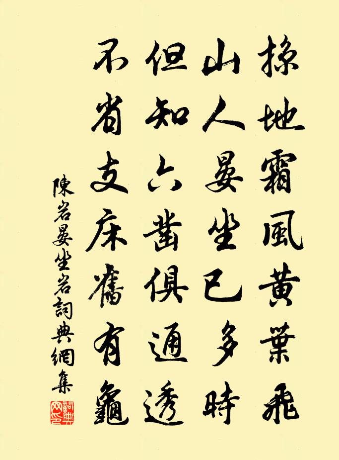 詩詞名句歷史字典書法欣賞書法字典國語詞典說文解字康熙字典古漢語字典標 題 作 者 詩 句 晏坐岩作者:陳岩 朝代:宋代晏坐岩原文掠地霜風黃葉飛,山人晏坐已多時。但知六鑿俱通透,不省支床舊有龜。詩詞問答問:晏坐岩的作者是誰?答:陳岩問:晏坐岩寫於哪個朝代?答:宋代陳岩晏坐岩書法欣賞晏坐岩書法作品詩詞推薦朱放自杭州與故里相使君立碑回因以奉簡吏部楊侍郎制文劉長卿〔唐代〕片石羊公後,淒涼江水濱。好辭千古事,墮淚萬家人。鵩集占書久,鸞回刻篆新。不堪相顧恨,文字日生塵。卜居蘇轍〔宋代〕我歸萬里初無宅,鳳去千年尚有台。誰為繞池先種竹,可憐當砌已栽梅。囊資只數腰金在,歸計長遭鬢雪催。欲就次韻高子勉十首黃庭堅〔宋代〕峴南羈旅井,灞上獵歸亭。日繞分魚市,風回落雁汀。筆由詩客把,笛為故人聽。但恐蘇耽鶴,歸時或姓丁。春夜二首劉象〔唐代〕幾處兵戈阻路岐,憶山心切與山違。時難何處披懷抱,日日日斜空醉歸。一別杜陵歸未期,只憑魂夢接親知。近來山中僧陸龜蒙〔唐代〕手關一室翠微里,日暮白雲棲半間。白雲朝出天際去,若比老僧猶未閒。又和前韻十首廖行之〔宋代〕新詩筆力可天回,萬里東風掃凍開。照眼玉英清徹骨,花神報子亦瓊瑰。首尾吟邵雍〔宋代〕堯夫非是愛吟詩,詩是堯夫讓仆時。止會搖頭道又錯,奈何轉腳復為非。比圖為家效功力,更卻與物生瑕疵。失在病後戲呈謨老禪師李彌遜〔宋代〕霜髭病起叵相侵,銷盡平生未了心。一事關身俱是夢,萬緣彈指已非今。月林清影元無定,山路幽香不可尋。喚取和俞教授見寄並非韻黃庚〔宋代〕天邊日月似梭飛,百歲光陰難預期。有酒不妨留野客,無錢何惜典春衣。江山猶記登臨處,身世都非少壯時。晚影除夜曹松〔唐代〕殘臘即又盡,東風應漸聞。一宵猶幾許,兩歲欲平分。燎暗傾時斗,春通綻處芬。明朝遙捧酒,先合祝堯君。王先輩草堂陸龜蒙〔唐代〕松徑隈雲到靜堂,杏花臨澗水流香。身從亂後全家隱,日校人間一倍長。金籙漸加新品秩,玉皇偏賜羽衣裳。何如山居雜詩九十首曹勛〔宋代〕山中四序景,巧供晨夕間。茶甌不少輟,詩魔常畏閒。生計付風雨,年華寄毛顏。支筇正獨立,棲禽相與還。新澗亭白居易〔唐代〕煙蘿初合澗新開,閒上西亭日幾回。老病歸山應未得,且移泉石就身來。倦尋芳(林鐘羽花翁遇舊歡吳門老妓李憐,邀分韻同賦此詞)吳文英〔宋代〕墜瓶恨井,分鏡迷樓,空閉孤燕。寄別崔徽,清瘦畫圖春面。不約舟移楊柳系,有緣人映桃花見。敘分攜,悔香瘢欒城范成大〔宋代〕頹垣破屋古城邊,客傳蕭寒爨不煙。明府牙緋危受杖,欒城風物一悽然!廣教寺張弋〔宋代〕英雄居處終奇特,幾度欲來今始能。騎省文高存古篆,橋公樹朽長寒藤。清流並繞分三澗,翠竹相依住數僧。沙鳥偈頌一百零二首釋紹曇〔宋代〕有一物,黑似漆,常在面門出入。騎聲蓋色,妙密中險崖。倒用逆施,險崖中妙密。三世諸佛遠之愈親,白牯狸奴秋胡行 二謝惠連〔南北朝〕繫風捕影。誠知不得。念彼奔波。意慮回惑。漢女倐忽。洛神飄揚。空勤交甫。徒勞陳王。題震澤寺壁佚名〔宋代〕民力久已竭,天乎不見憐。三年兩遭水,十室九無煙。田沒官徵賦,家貧子賣錢。秋風江上路,忽見渡江船。和韓叔夏碧泉胡宏〔宋代〕靈源一派似河傾,隱映長天萬古情。林影淡搖秋月冷,澗翻先凝玉壺清。舊栽沿岸柳陰合,新種數株梅子成。誰引名句推薦黃鳥翩翩楊柳垂,春風送客使人悲。高適《東平別前衛縣李寀少府 / 送前衛縣李宷少府》 遊絲冉冉花枝靜,青壁迢迢白鳥過。王守仁《春晴》 借錢塘潮汐,為君洗盡,岳將軍淚!陳德武《水龍吟·西湖懷古》 博學而詳說之,將以反說約也。孟子《孟子·離婁章句下·第十五節》 石澗凍波聲,雞叫清寒晨。李賀《自昌谷到洛後門》 秋江帶雨,寒沙縈水,人瞰畫閣愁獨。史達祖《八歸·秋江帶雨》 易樂者必多哀,輕施者必好奪。王通《中說·卷一·王道篇》 欲買桂花同載酒,終不似,少年游。劉過《唐多令·蘆葉滿汀洲》 娶妻無媒毋須恨,書中自有顏如玉。趙恆《勸學詩》 騮馬新跨白玉鞍,戰罷沙場月色寒。王昌齡《出塞二首》