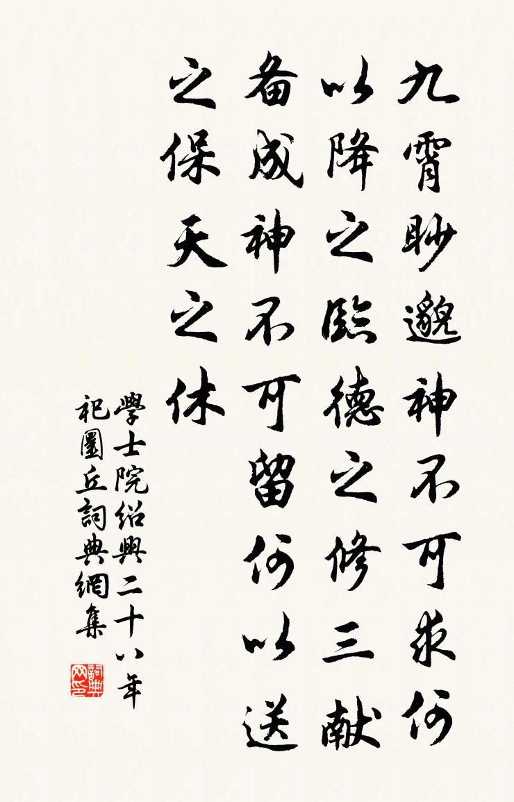 詩詞名句歷史字典書法欣賞書法字典國語詞典說文解字康熙字典古漢語字典標 題 作 者 詩 句 紹興二十八年祀圜丘作者:學士院 朝代:宋代紹興二十八年祀圜丘原文九霄眇邈,神不可求。何以降之,臨德之修。三獻備成,神不可留。何以送之,保天之休。詩詞問答問:紹興二十八年祀圜丘的作者是誰?答:學士院問:紹興二十八年祀圜丘寫於哪個朝代?答:宋代學士院紹興二十八年祀圜丘書法欣賞紹興二十八年祀圜丘書法作品詩詞推薦二十八日雪二十九日未已賦詩凡五首趙蕃〔宋代〕霰集瓦跳鳴,風橫窗竹聲。陰來由有漸,落地勢難平。龍具愁終夜,鶉衣起遲明。兒時故狂甚,老境只寒生。嘯台李廌〔宋代〕步兵遊方外,棄禮真太簡。過差生杯酒,況復能白眼。蘇門鸞鳳音,戲技猶赧赧。當知愧孫登,不獨嵇中散。代張京尹賀皇太子生辰三首彭龜年〔宋代〕青禁羅雞戟,朱明出虎闈。布宣當浩穰,簡樂著精微。有志窺成畫,無材守一圻。徒能歌聖子,重潤更重暉。答林行父宋伯仁〔宋代〕男兒未肯著漁蓑,且把屠龍一劍磨。宣室豈容無賈誼,詞林尚可著廉頗。壯懷每被愁懷惱,官況寧如旅況多。我欲紹熙癸丑二月二十六日蔣助教言正招游陽華婆李長庚〔宋代〕春風今日扇微和,觸目江山發興多。如畫幽岩無十里,輕衫短帽得婆娑。六銖五首白玉蟾〔宋代〕我醉輒指麾,莫向太帝說。要煉五彩石,去補西天缺。真一酒(並引)蘇軾〔宋代〕米、麥、水三一而已,此東坡先生真一酒也。撥雪披雲得乳泓,蜜蜂又欲醉先生。(真一色味,頗類予在黃州日所偈五首釋彌光〔宋代〕一九與二九,相逢不出手。凍得鴟吻頭,面南看北斗。諸禪人,曉不曉,地爐火冷莫嫌寒,更有樵夫赤腳走。詠史六首陳勝吳廣樂雷發〔宋代〕假號偷名只可憐,枉拋錢鎛弄戈鋋。隴頭燕雀應相笑,鴻鵠元來是項燕。行香子蘇軾〔宋代〕清夜無塵,月色如銀。酒斟時,須滿十分。浮名浮利,虛苦勞神。嘆隙中駒,石中火,夢中身。雖抱文章,開口誰踏莎行 春雨連日吳存〔元代〕夜溜瓶懸,朝陰墨鎖。一年桃李糊塗過。欲留晴賞待清明,晴時只恐清明蹉。倚杖孤吟,焚香默坐。春衫莫把春泥詩一首釋道濟〔宋代〕何須林景勝瀟湘,只願西湖化為酒。和身臥倒西湖邊,一浪來時吞一口。雲居佑禪師燒香頌黃庭堅〔宋代〕一身入定千身出,雲居不打這鼓笛。虎馱太華入高麗,波斯鼻孔撐白日。新交行李洪〔宋代〕君不見洛陽拜塵友,欲取金印擊肘後。又不見長安輕薄兒,誰道青雲不可梯。雨露翻覆豈無意,炙手新交舊交棄。雪中雪坡十憶姚勉〔宋代〕磥砢擎雲十丈松,冰髯不剪照瓏松。曉窗明眼山前雪,猶似巡檐看玉龍。春日釋紹嵩〔宋代〕風流盡付小園春,濃麝分香入四鄰。何事晚來微雨後,山花知繡草如茵。春日西興道中呂祖謙〔宋代〕檐鐸無聲鳥語稀,徑深鍾梵出花遲。日長遍繞溪南寺,未信東風屬酒旗。潘丞孩子皎然〔唐代〕愛子性情奇,初生玉樹枝。人曾天上見,名向月中知。我識嬰兒意,何須待佩觿。同林擇之姚宏甫游鼓山趙汝愚〔宋代〕幾年奔走厭塵埃,此日登臨亦快哉。江月不隨流水去,天風直送海濤來。故人契闊情何厚,禪客飄零事已灰。堪嘆贈別歐陽全真三首趙蕃〔宋代〕往者贛州牧,與君鄉里儒。身俱上黃閣,官或伏青蒲。薦口寧虛啟,才名不可誣。下僚如處士,鯁論亦時須。名句推薦綠槐煙柳長亭路,恨匆忙分離去。惠洪《青玉案·綠槐煙柳長亭路》 大樹底下好遮陰張南莊《何典·第十回》 文章本天成,妙手偶得之。陸游《文章》 相見易得好,久住難為人。佚名《增廣賢文·上集》 綠竹半含籜,新梢才出牆。杜甫《嚴鄭公宅同詠竹》 若耶溪傍採蓮女,笑隔荷花共人語。李白《採蓮曲》 單于北望拂雲堆,殺馬登壇祭幾回。王之渙《涼州詞二首》 一自胡塵入漢關,十年伊洛路漫漫。陳與義《詠牡丹》 我寄愁心與明月,隨君直到夜郎西。李白《聞王昌齡左遷龍標遙有此寄》 雪沫乳花浮午盞,蓼茸蒿筍試春盤。蘇軾《浣溪沙·細雨斜風作曉寒》