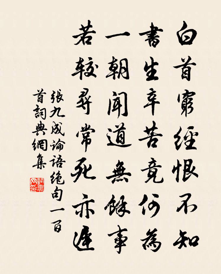 詩詞名句歷史字典書法欣賞書法字典國語詞典說文解字康熙字典古漢語字典標 題 作 者 詩 句 論語絕句一百首作者:張九成 朝代:宋代論語絕句一百首原文白首窮經恨不知,書生辛苦竟何為。一朝聞道無餘事,若較尋常死亦遲。詩詞問答問:論語絕句一百首的作者是誰?答:張九成問:論語絕句一百首寫於哪個朝代?答:宋代張九成論語絕句一百首書法欣賞論語絕句一百首書法作品詩詞推薦句玄幽〔唐代〕一萬蓮經三十春,半生不蹋院門塵。題雲際寺上方盧綸〔唐代〕松高蘿蔓輕,中有石床平。下界水長急,上方燈自明。空門不易啟,初地本無程。回步忽山盡,萬緣從此生。次韻君澤正月五日早見示方回〔宋代〕人人有此珠,萬古天地寶。法當潛厥光,蚌谷護其表。能使華岳移,可叱峽流倒。未若床缺足,梓匠不自造。脫華感皇恩晁沖之〔宋代〕蝴蝶滿西園,啼鶯無數。水閣橋南路。凝佇。兩行煙柳,吹落一池飛絮。鞦韆斜掛起,人何處。把酒勸君,閒愁莫送鄭天休宋祁〔宋代〕春筠蒸遍擿鋒摧,剡奏飄然別上台。授簡客驚枚乘去,探書人繼史公來。爆桐度曲離筵慘,樵的分風使棹催。千萬永壽縣太君周氏輓辭二首王安石〔宋代〕子引金閨籍,身開石窮封。露輴悲吉路,象服儼虛容。楚挽雖多相,萊衣不更縫。誰知逝川底,劍自喜相逢。小園即事二首劉克莊〔宋代〕何處瑤姬款戶來,薔薇花下暫裴徊。分明粉蝶通訊息,未有人知一朵開。遠齋和示疏字韻四詩復用韻並呈子肅趙蕃〔宋代〕杖履過從每恨疏,何當有屋並門居。我疑奇字就公問,公賦新詩令我書。無事晝棋仍夜酌,有時溪楫更山車。從教梅花喜神譜爛熳二十八枝宋伯仁〔宋代〕紫陌暖風細,露房山更深。蜜甜不知味,萬花空損心。訪潯陽友人不遇韋莊〔唐代〕不見安期悔上樓,寂寥人對鷺鷥愁。蘆花雨急江煙暝,何處潺潺獨棹舟?破琴蘇軾〔宋代〕破琴雖未修,中有琴意足。誰雲十三弦,音節如佩玉。新琴空高張,絲聲不附木。宛然七弦箏,動與世好逐。陋矣送石與德孺李處權〔宋代〕坡老仇池安在哉,佛家鷲嶺解飛來。但令氣象侔沖霍,可要孤高切斗魁。渦處正堪承雨露,浪中莫使長莓苔。明窗雜興陸游〔宋代〕瞿聃揚墨寧非學,治獄行兵亦有師。惟是儒生知擇術,百年窮達守書詩。送程子方歸蜀仇遠〔宋代〕薄葺田園溧澤邊,鄉心常夢蜀山川。梨花知幾逢寒食,麥飯誰能灑墓田。矍鑠老翁輕客路,扶攜稚子上江船。東還送明老游雁盪五首吳芾〔宋代〕師到龍湫謁矩羅,為言別久渴心多。當年見處祥光滿,試問今還記得麽。酬皇甫十六侍御曾見寄(此公時貶舒州司馬)李嘉祐〔唐代〕自顧衰容累玉除,忽承優詔赴銅魚。江頭鳥避青旄節,城裡人迎露網車。長沙地近悲才子,古郡山多憶舊廬。更枉寓舍遭雨漏甚趙蕃〔宋代〕無計補天漏,寧關以瓦為。晝居衣數燎,宵臥枕頻移。慣悶長憑酒,窮愁更有詩。何須僂句問,可向穴居知。湖州歌九十八首 其四十七汪元量〔宋代〕絲雨綿雲五月寒,淮堧遺老笑儒冠。行軍元帥來相探,折送駝峰炙一盤。湛庵出示憲使陳益之近作且蒙記憶再次韻一首李壁〔宋代〕重將倦翼羾天關,流浪深慚佛眼看。名宿青燈仍燕坐,故人白雪自幽彈。西江一吸還居士,寒涕雙垂任懶殘。應笑袁州北崇勝寺二首趙蕃〔宋代〕病中曾覓扊扅炊,別後東西無自知。似說諸侯枉行卷,卻從群彥赴明時。相如定辱君王問,鄭老寧容爾汝期。幾欲名句推薦世事漫隨流水,算來一夢浮生。李煜《烏夜啼·昨夜風兼雨》 楊柳乍如絲,故園春盡時。納蘭性德《菩薩蠻·問君何事輕離別》 重賞之下,必有勇夫。畢沅《續資治通鑑·宋紀·宋紀十七》 王者不言有無,諸侯不說多少,食祿之 家,不與百姓爭利。李大師、李延壽《南史·列傳·卷三十三》 秋已無多,早是敗荷衰柳。潘希白《大有·九日》 騷人可煞無情思,何事當年不見收。李清照《鷓鴣天·桂花》 吠犬雜鳴雞,燈火熒熒歸路迷。納蘭性德《南鄉子·秋暮村居》 危橋屬幽徑,繚繞穿疏林。柳宗元《巽公院五詠·苦竹橋》 從前種種,譬如昨日死;從後種種,譬如今日生袁黃《了凡四訓·立命之學》 千步虹橋,參差雁齒,直趨水殿。柳永《破陣樂·露花倒影》