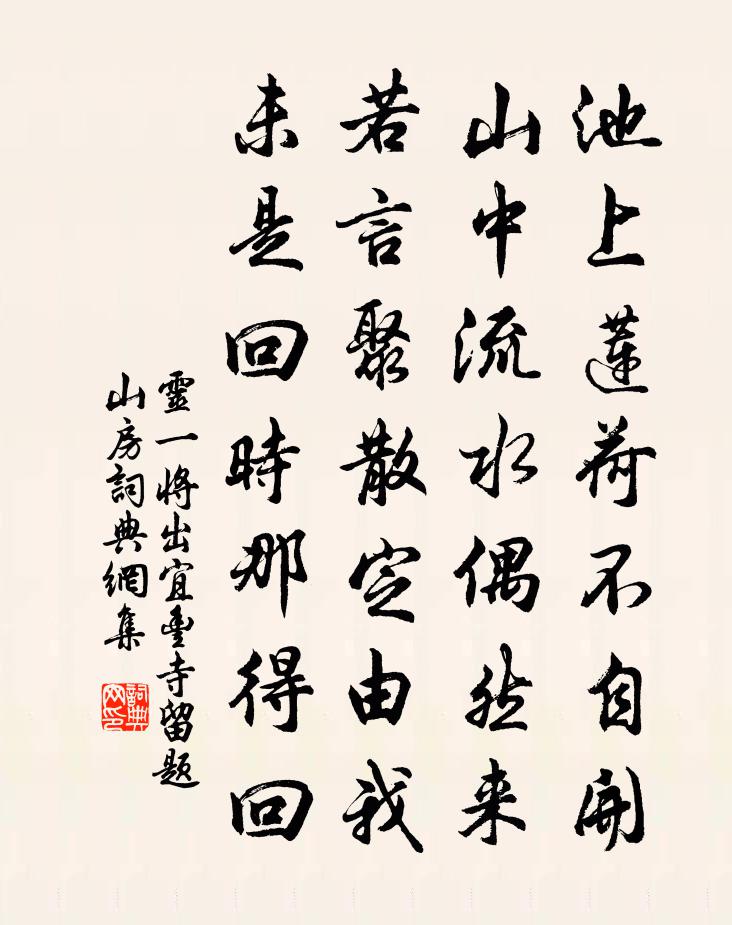 詩詞名句歷史字典書法欣賞書法字典國語詞典說文解字康熙字典古漢語字典標 題 作 者 詩 句 將出宜豐寺留題山房作者:靈一 朝代:唐代將出宜豐寺留題山房原文池上蓮荷不自開,山中流水偶然來。若言聚散定由我,未是回時那得回。詩詞問答問:將出宜豐寺留題山房的作者是誰?答:靈一問:將出宜豐寺留題山房寫於哪個朝代?答:唐代問:將出宜豐寺留題山房是什麼體裁?答:七絕靈一將出宜豐寺留題山房書法欣賞將出宜豐寺留題山房書法作品注釋全唐詩:卷809-39詩詞推薦和安上弟游湖山諸寺二首蘇頌〔宋代〕十里湖山繞四門,遊人朝暮隘重闉。樓台遠近連郊郭,到處皆為水石鄰。瑞香花董嗣杲〔宋代〕春沁幽花透骨清,矮窠殊邁百芳馨。紫英四出醉嬌粉,綠萼千攢簇巧丁。自覆薰籠須閉戶,誰栽錦傘都當庭。晝眠東偏小室去日最遠每逃暑之地戲作五字陸游〔宋代〕肅肅檐陰轉,泠泠筧水鳴。高墉日氣遠,方簟午風清。渴愛餐漿美,慵便葛屨輕。新秋忽在眼,結束問山程。挽鄭計院劉克莊〔宋代〕方與譽髦連茹進,忽然避弋下喬來。空令歸訪盟鷗社,不使重登市駿台。古有孟嘗能好客,今無鮑叔青分財。吾衰荼醾盧梅坡〔宋代〕荼醾結屋是何年,風雨摧頹為愴然。飛似綠珠樓上墜,困於畢卓瓮間眠。門前礙路旋移來,壓架欹斜緣作堆。三月奉平淮夷雅表。皇武命丞相度董師集大功也柳宗元〔唐代〕皇耆其武,於溵於淮。既巾乃車,環蔡具來。狡眾昏嚚,甚毒於酲。狂奔叫呶,以乾大刑。皇咨於度,惟汝一德。自潁上歸再題寺壁二絕劉渙〔宋代〕顛倒儒冠二十春,歸來重喜訪僧鄰。千奔萬競無窮竭,老竹枯松特地新。佛印清勝帖贊岳珂〔宋代〕欲溯共洄,先涉其流。欲觀其人,先視其與游。東坡之名,在昌黎武威之間。而師之能,亦文暢秘演之儔。德必有酬賀遂亮韓思彥〔唐代〕古人一言重,嘗謂百年輕。今投歡會面,顧盼盡平生。簪裾非所託,琴酒冀相併。累日同游處,通宵唉素誠。霜飄送趙汝楫分教建安胡仲弓〔宋代〕又領皋比走建安,青衿喜色上眉端。詩因老去難言別,氈到春來不覺寒。當日紫陽傳授學,他年粉省校讎官。聖門漁父詞(六之四)周紫芝〔宋代〕趁梅尋得水邊枝。獨棹漁船卻過溪。人似玉,醉如泥。閒歌五色線中詩。臘夜雪霽月彩交光開閣臨軒竟睡不得…寄江陵副使杜中丞李群玉〔唐代〕月華臨霽雪,皓彩射貂裘。桂酒寒無醉,銀笙凍不流。懷哉梁苑客,思作剡溪游。竟夕吟瓊樹,川途恨阻修。庚午蛾眉亭張埴〔宋代〕漠漠西淮雲散,滔滔東海潮歸。鷗鳥飛來石壁,柳花撲上人衣。次韻何子應留詩為別王灼〔宋代〕追攀筆墨幸同時,蘇季如今不願師。自托柳州曾指授,年來稍稍許言詩。和何長官六言次韻蘇軾〔宋代〕作邑君真伯厚,去官我豈曼容。一廛願托仁政,六字難賡變風。五噫已出東洛,三復願比南容。學道未從潘盎,(答謝景山遺古瓦硯歌歐陽修〔宋代〕火數四百炎靈銷,誰其代者當塗高。窮奸極酷不易取,始知文章基扃牢。坐揮長喙啄天下,豪傑競起如蝟毛。董呂湘竹詞釋斯植〔宋代〕湘魂何自怨,千古尚名存。不種庭邊竹,那知有淚痕。望龍山懷道士許法棱劉長卿〔唐代〕心惆悵,望龍山。雲之際,鳥獨還。懸崖絕壁幾千丈,綠蘿裊裊不可攀。龍山高,誰能踐。靈原中,蒼翠晚。嵐煙重遊道岩吳棟〔宋代〕玄都重到拂題塵,屈指於今十四春。白石煙消丹灶冷,蒼崖日永畫樓新。山中自笑黔驢技,天外誰知海鶴身。洞口驀山溪(月夜)謝逸〔宋代〕霜清木落,深院簾櫳靜。池面捲菸波,瑩香水、一奩明鏡。修筠拂檻,疏翠挽嬋娟,山霧斂,水雲收,野闊江天迥名句推薦盧家少婦鬱金堂,海燕雙棲玳瑁梁。沈佺期《古意呈補闕喬知之 / 古意 / 獨不見》 紛披乍依迥,掣曳或隨風。李世民《詠興國寺佛殿前幡》 民之從事,常於幾成而敗之。老子《老子·德經·第六十四章》 靈台無計逃神矢,風雨如磐暗故園。魯迅《自題小像》 獨睡起來情悄悄,寄愁何處好。納蘭性德《謁金門·風絲裊》 但遠山長,雲山亂,曉山青。蘇軾《行香子·過七里瀨》 重足而立,側目而視。司馬遷《史記·汲鄭列傳》 千載休談南渡錯,當時自怕中原復。文徵明《滿江紅·拂拭殘碑》 亂雲低薄暮,急雪舞迴風。杜甫《對雪》 若農服田力穡,乃亦有秋。佚名《尚書·商書·盤庚上》
