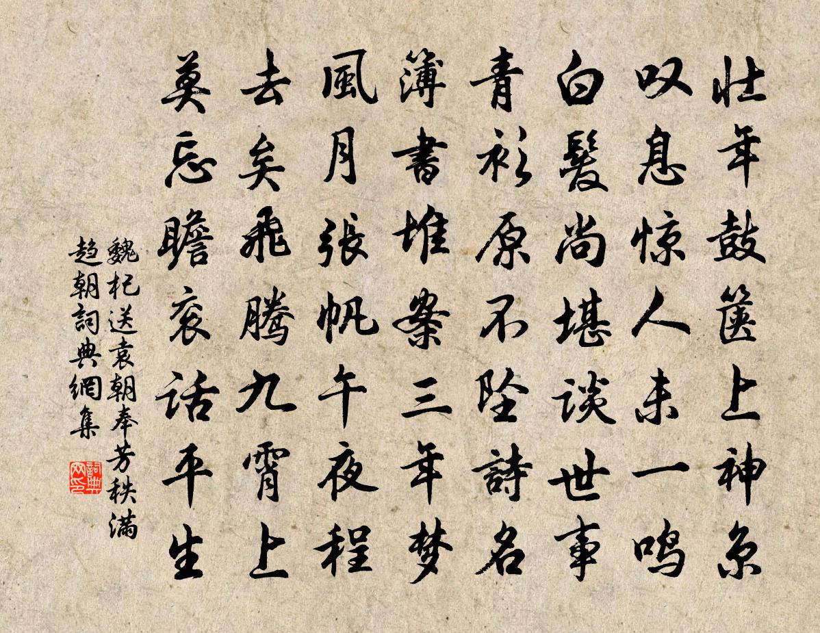 詩詞名句歷史字典書法欣賞書法字典國語詞典說文解字康熙字典古漢語字典標 題 作 者 詩 句 送袁朝奉芳秩滿趨朝作者:魏杞 朝代:宋代送袁朝奉芳秩滿趨朝原文壯年鼓篋上神京,嘆息驚人未一鳴。白髮尚堪談世事,青衫原不墜詩名。簿書堆案三年夢,風月張帆午夜程。去矣飛騰九霄上,莫忘瞻袞話平生。詩詞問答問:送袁朝奉芳秩滿趨朝的作者是誰?答:魏杞問:送袁朝奉芳秩滿趨朝寫於哪個朝代?答:宋代魏杞送袁朝奉芳秩滿趨朝書法欣賞送袁朝奉芳秩滿趨朝書法作品詩詞推薦滿江紅(壽大山兄)蕭泰來〔宋代〕七十人稀,嘗記得、少陵舊語。誰知道、五園庵主,壽今如許。書底青瞳如月樣,鏡中黑鬢無雙處。與人間、世味清湘縣郊外雜花盛開,有懷石湖范成大〔宋代〕午行清湘縣,妍暖春事嘉。柴荊鬧桃李,冥冥一川花。故園豈少此,愈此百倍加。我寧不念歸,顧作失木鴉。百年二十三日使風趙蕃〔宋代〕江行已屬北風權,此去寧憂上水船。臥聽招呼帆轉腳,起看飛濺水平舷。鷗乘逸氣沿仍溯,雁怯驚吹斷復連。玄妙程帥以詩見慰用韻謝之陳造〔宋代〕平時聯輝星,轉首食既月。誰能玄覽空,影事睨盈缺。老了一掬淚,未憗謝天合。生世岐高下,末路各一穴。莊生杜鵑花得紅字真山民〔宋代〕愁鎖巴雲往事空,只將遺恨寄芳叢。歸心千古終難白,啼血萬山都是紅。枝帶翠煙深夜月,魂飛錦水舊東風。至今覽古李商隱〔唐代〕莫恃金湯忽太平,草間霜露古今情。空糊赬壤真何益,欲舉黃旗竟未成。長樂瓦飛隨水逝,景陽鍾墮失天明。回頭獨行五首趙蕃〔宋代〕所思終不見,渺渺政愁余。試向江頭釣,怕逢雙鯉魚。偈頌二百零五首釋正覺〔宋代〕飲乾巨海,推倒須彌,廓大靈通更是誰。馨香秀林枬檀枝,哮吼出屈師子兒。三千界現一彈指,八萬門開雙用眉。重至秀山售屋將歸十首方回〔宋代〕百戰黃塵里,偷閒我亦能。隔牆呼酒友,過渡訪詩僧。謾說銅分虎,寧防玉點蠅。千金牘背事,空復憤填膺。餞何君元赴汾陽儒諭何夢桂〔宋代〕雪月堂前冷掾廳,況如此邑甚於冰。行移太白西邊次,去占高青最上層。冷不然官舍燭,俸涼自糴太倉升。詩書莫送陳用之遠遊舒岳祥〔宋代〕流水寫清音,青山發令姿。左右惟所取,囊篋恆相隨。君游且有日,欲訪燕趙奇。此行猶在眼,已作久別思。君如金縷曲 賀(賀字原缺,據丁藏精鈔本補)袁謝應芳〔元代〕卜宅椒園裡。響丁丁、風斤月斧,杏梁飛起。窗戶青紅煙樹綠,*耀碧山鄉里。雞共犬、也知輪美。燕子飛來堂下七夕讀牛女事汪炎昶〔宋代〕天澄灝氣輝銀灣,驚鴻未陣點紺寒。畢逋之孫嗜穢腐,為梁豈無鵷與鶯。暫拋機梭息鞅靷,別久未愜須臾懽。聚落六言陸游〔宋代〕愛馬能成一癖,結髦可忘百憂。我亦時時自笑,開編萬事俱休。任德廣通判拉游長松以詩見貽次其韻李流謙〔宋代〕已成倦鳥不知還,碌碌無奇合抱關。五斗未供雞鶩飽,一身長占簿書間。何妨使我留東閣,久自從公仰泰山。佳句寄宜興趙大夫二首劉宰〔宋代〕勝地古陽羨,清才今長官。能令三害遠,坐使四民安。勿謂時無幾,仍防弊有端。做成循吏樣,傅與世人看。頌古五十七首釋道昌〔宋代〕千里萬里,不著便處卻能回,閉了方丈依前來。雙收雙放,半合半開。主賓全體用,石女老黃梅。送楊屯田通判永興王禹偁〔宋代〕長安棄廢比藩方,通理猶宜占省郎。入洛才名齊二陸,有唐門戶本三楊。袖中丹桂家聲在,道畔豐碑祖德光。莫向贈李榮道士盧照鄰〔唐代〕錦節銜天使,瓊仙駕羽君。投金翠山曲,奠璧清江濆。圓洞開丹鼎,方壇聚絳雲。寶貺幽難識,空歌迥易分。風搖郭西文孝廟陳允平〔宋代〕帝子宸游白玉京,江南遺廟尚丹青。寢園月暗衣冠古,選閣雲深筆硯靈。清衛有威森鳳戟,嬌嬪無語倚龍屏。太平名句推薦仁遠乎哉?我欲仁,斯仁至矣。孔子弟子《論語·述而篇》 惟有樓前流水,應念我、終日凝眸。李清照《鳳凰台上憶 * ·香冷金猊》 送君不相見,日暮獨愁緒。孟浩然《送辛大之鄂渚不及》 秋波落泗水,海色明徂徠。李白《魯郡東石門送杜二甫》 落月滿屋樑,猶疑照顏色。杜甫《夢李白二首·其一》 河海不擇細流,故能就其深;李斯《諫逐客書》 楊柳回塘,鴛鴦別浦。綠萍漲斷蓮舟路。賀鑄《芳心苦·楊柳回塘》 醉不成歡慘將別,別時茫茫江浸月。白居易《琵琶行 / 琵琶引》 小軒窗。正梳妝。相顧無言,惟有淚千行。蘇軾《江城子·乙卯正月二十日夜記夢》 十二樓中盡曉妝,望仙樓上望君王。薛逢《宮詞》