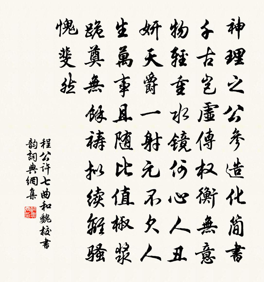 詩詞名句歷史字典書法欣賞書法字典國語詞典說文解字康熙字典古漢語字典標 題 作 者 詩 句 七曲和魏校書韻作者:程公許 朝代:宋代七曲和魏校書韻原文神理之公參造化,簡書千古豈虛傳。權衡無意物輕重,水鏡何心人醜妍。天爵一射元不欠,人生萬事且隨比值。椒漿跪奠無餘禱,擬續離騷愧斐然。詩詞問答問:七曲和魏校書韻的作者是誰?答:程公許問:七曲和魏校書韻寫於哪個朝代?答:宋代程公許七曲和魏校書韻書法欣賞七曲和魏校書韻書法作品詩詞推薦次韻信守李秬二首一晁補之〔宋代〕誰榜鈴齋作面山,晦明終日捲簾看。賦成夜燭才銷寸,衙退朝曦未半竿。柱渚孤吟愁旅雁,蘇門雙嘯駭朱鸞。平生遠遊十首韓元吉〔宋代〕呼吸為陰陽,動靜乃天地。猶然一身間,至理無弗備。蒼龍駕 * ,晝夜分六氣。坎離會精神,否泰本仁義。吾師禪宗無門關總頌釋慧開〔宋代〕大道無門,千羞有路。透得此關,乾坤獨步。燕林石澗〔宋代〕年年因社到,海闊翅飛低。故國傷新別,空梁憶舊棲。暮簾疏竹雨,春岸落花泥。紅線今何在,香愁滿繡閨。越問越茶孫因〔宋代〕日鑄山之英氣兮,既發越於鏌鎁。地靈洩而不盡兮,復熏蒸於草芽。雖名出之最晚兮,為江南之第一。視紫筍若奴廣倅蕭大夫借前韻見贈,復和答之,二首蘇軾〔宋代〕心閒詩自放,筆老語翻疏。贈我皆強韻,知君得異書。滔滔沮叟是,綽綽孟生余。一笑滄溟側,應無憤可攄。十年三月三十日別微之於灃上十四年…為他年會話張本也白居易〔唐代〕灃水店頭春盡日,送君上馬謫通川。夷陵峽口明月夜,此處逢君是偶然。一別五年方見面,相攜三宿未回船。坐從寄題武陵柳氏所居二首其一天真堂蘇轍〔宋代〕宦遊閱盡山川勝,歸老方知氣味真。歌哭不移身自穩,往還無間語尤親。永懷前輩無因見,猶喜諸郎有此人。千歲金谷園花發懷古侯冽〔唐代〕金谷千年後,春花發滿園。紅芳徒笑日,穠艷尚迎軒。雨濕輕光軟,風搖碎影翻。猶疑施錦帳,堪嘆罷朱紈。愁態雜興五首艾性夫〔宋代〕蟻國槐為穴,蜂衙蜜作房。採花與旋磨,辛苦知尊王。胡為梟獍生,思食父母腸。彼微有尊卑,此大相滅亡。物情九月丁亥秋祀畢勞農北郊蘇提乾以疾不往心詩魏了翁〔宋代〕秋嘗事畢與賓游,神惠如臨不敢留。騎吹一川松露曉,踏歌千里稻雲秋。豳公堂上兕觥薦,鄆使溪前經律諏。盡日初發嘉州蘇轍〔宋代〕放舟沫江濱,往意念荊楚。擊鼓樹兩旗,勢如遠征戍。紛紛上船人,櫓急不容語。餘生雖江陽,未省至嘉樹。巉巉次前人韻王柏〔宋代〕彈冠事業耳邊新,我夢何因到紫宸。自古為仁知不富,如今學道豈憂貧。與其鞭撲朘民髓,熟若簞瓢樂此身。志士省直書事姚合〔唐代〕默默滄江老,官分右掖榮。立朝班近殿,奏直上知名。曉霧和香氣,晴樓下樂聲。蜀箋金屑膩,月兔筆毫精。禁樹兄子高赴廷對魏了翁〔宋代〕九十花九峰矗天花起,家在花前峰夕陽花里。蠻徭虎豹斷行人,小市寒城淨如水。驩傳有客闖然來,{左扌右監}挽楊茂原二首趙蕃〔宋代〕玉美終懷璞,蘭香竟死林。名期百世後,恨獨九原深。夜雨長形夢,秋風遂絕音。扁舟載孤旐,行路亦沾襟。戲瞻相薛能〔唐代〕失意蹉跎到舊遊,見吹楊柳便遮羞。瞻相趙女休相拽,不及人前詐擺頭。贈從弟南平太守之遙二首李白〔唐代〕少年不得意,落魄無安居。願隨任公子,欲釣吞舟魚。常時飲酒逐風景,壯心遂與功名疏。蘭生谷底人不鋤,雲在次韓無咎途中寄陸務觀章甫〔宋代〕戎馬馳驅日,江湖邂逅間。笑談無逆旅,翰墨落名山。畫省春風入,漁舟夜月還。唱酬能見記,書札忍令慳。泗州南山監倉蕭淵東軒二首蘇軾〔宋代〕偶隨樵父采都梁,(南山名都梁山,山出都梁香故也。)竹屋松扉試乞漿。但見東軒堪隱几,不知公子是監倉。溪名句推薦儉節則昌,淫佚則亡。墨子《墨子·06章 辭過》 我歌君起舞,潦倒略相同。陳師道《除夜對酒贈少章》 雲邊雁斷胡天月,隴上羊歸塞草煙。溫庭筠《蘇武廟》 尊前只恐傷郎意,閣淚汪汪不敢垂。夏竦《鷓鴣天·鎮日無心掃黛眉》 力田不如逢年,善仕不如遇合。司馬遷《史記·佞幸列傳》 待浮花、浪蕊都盡,伴君幽獨。蘇軾《賀新郎·夏景》 恨蕭蕭、無情風雨,夜來揉損瓊肌。李清照《多麗·詠白菊》 君若清路塵,妾若濁水泥;曹植《明月上高樓》 此地朝來餞行者,翻向此中牧征馬。孟浩然《高陽池送朱二》 怕相思,已相思,輪到相思沒處辭,眉間露一絲。俞彥《長相思·折花枝》