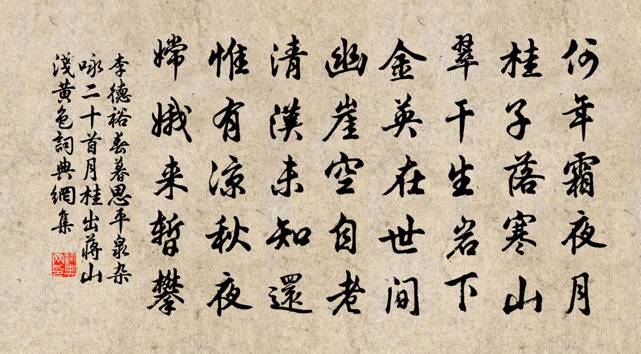 詩詞名句歷史字典書法欣賞書法字典國語詞典說文解字康熙字典古漢語字典標 題 作 者 詩 句 春暮思平泉雜詠二十首。月桂(出蔣山,淺黃色)作者:李德裕 朝代:唐代原文何年霜夜月,桂子落寒山。翠乾生岩下,金英在世間。幽崖空自老,清漢未知還。惟有涼秋夜,嫦娥來暫攀。詩詞問答問:《春暮思平泉雜詠二十首。月桂(出蔣山,淺黃色)》的作者是誰?答:李德裕問:該詩寫於哪個朝代?答:唐代書法欣賞春暮思平泉雜詠二十首。月桂(出蔣山,淺黃色)書法作品注釋全唐詩:卷475-83詩詞推薦詠史上審配金禕陳普〔宋代〕董承種輯騷為迂,耿紀金禕計逾疏。精衛有心安問海,螳螂方怒豈知車。次韻曾端伯早春即事五首郭印〔宋代〕九畹春回未放蘭,先饒堤柳變衰殘。陰陽代謝尋常爾,正好隨流著眼看。蕃侍舅翁衡州史君游吉陽山舅翁舉往年與南澗趙蕃〔宋代〕慘澹松圍障,蜿蜒石隱龍。背城無數里,獻狀有千峰。此地雖為寓,茲山特未逢。因公九日集,臨眺得從容。不遇詠王維〔唐代〕北闕獻書寢不報。南山種田時不登。百人會中身不預。五侯門前心不能。身投河朔飲君酒。家在茂陵平安否。且此游黃山謝鳳〔宋代〕歷覽岧嶢接鬥牛,岩排雲樹翠陰稠。風生藥臼清香遠,日照丹岩紫氣浮。仙樂有聲聞晝夜,靈泉無火沸春秋。猶多呈嬾翁六首白玉蟾〔宋代〕醉時枕上化蝶,睡起筆下生蛇。日長心下無事,飢來只是餐霞。偈三十五首釋祖珍〔宋代〕岩谷相從始晏然,又攜瓶錫應時緣。奉川此去無多遠,興發何妨訪戴船。城中赴范純甫酒有感陳著〔宋代〕杜鵑啼斷洛陽橋,心與萍流絮與飄。風雨故都同死夢,山林晚景十年饒。相逢得醉有今日,萬事忘言付落潮。見說定風波·次高左藏使君韻黃庭堅〔宋代〕萬里黔中一漏天,屋居終日似乘船。及至重陽天也霽,催醉,鬼門關外蜀江前。莫笑老翁猶氣岸,君看,幾人 * 正月五日與館伴耶律防夜讌永壽給束赴留別王珪〔唐代〕萬里來持聘玉通,今宵賓燕為誰同。羌歌自醉天山北,漢節先隨斗柄東。半夜騰裝吹朔雪,平明躍馬向春風。使車新年五首蘇軾〔宋代〕荔子幾時熟,花頭今已繁。探春先揀樹,買夏欲論園。居士常攜客,參軍許叩門。明年更有味,懷抱帶諸孫。二月晦文天祥〔宋代〕塞上明妃馬,江頭漁父船。新讎誰共雪,舊夢不堪圓。遺恨常千古,浮生又一年。何時暮春者,還我浴沂天。到西山懷趙景文陳著〔宋代〕曉日南窗一暖烘,採薇人去與誰同。人生畢竟皆如此,休怪浮圖只說空。偈十首釋道行〔宋代〕一不成,二不是。三不定,四不可。拗折弓箭,踏翻射垛。官柳張琰〔唐代〕不見橋東黃布簾,樹猶如此我何堪。裊裊亭亭忒無賴,又將春色誤江南。春日書懷朱淑真〔宋代〕從宦東西不自由,親幃千里淚長流。已無鴻雁傳家信,更被杜鵑追客愁。月落鳥歌空美景,花光柳影漫盈眸;高樓與弟清河雲詩十章陸機〔魏晉〕一章於穆予宗。稟精東嶽。誕育祖考。造我南國。南國克靖。實繇洪績。惟帝念功。載繁其錫。其錫惟何。玄冕袞故致政參政大資張公輓詞三首韓元吉〔宋代〕少納推耆德,朝端藹直聲。金輝余列火,玉價自連城。正色消群枉,高風聳後生。君王問黃髮,猶僅陟台衡。呂丞相生日吳芾〔宋代〕日躔析木當良月,辰象煌煌森羅列。勿驚昴宿下天來,果向明時作人傑。巍巍德望冠簪纓,魯國真儒獨擅名。五百山居雜詩九十首曹勛〔宋代〕不持月三長,不奉八關戒。久素則生疾,多肉亦思菜。齒決今莫遂,啜汗老所快。終當屏去葷,居山得自在。名句推薦想到他日是那樣下場,則可以發憤矣。王永彬《圍爐夜話·第三六則》 去日兒童皆長大,昔年親友半凋零。竇叔向《夏夜宿表兄話舊》 陽月南飛雁,傳聞至此回。宋之問《題大庾嶺北驛》 山中夜來月,到曉不曾看。元好問《倪莊中秋》 巧笑倩兮,美目盼兮。佚名《碩人》 無人調護,自去經心。沈復《浮生六記·閨房記樂》 山中何所有,嶺上多白雲。陶弘景《詔問山中何所有賦詩以答》 東邊日出西邊雨,道是無晴卻有晴。劉禹錫《竹枝詞二首·其一》 停船暫借問,或恐是同鄉。崔顥《長干行·君家何處住》 共說春來春去事,多時。一點愁心入翠眉。晏幾道《南鄉子·花落未須悲》