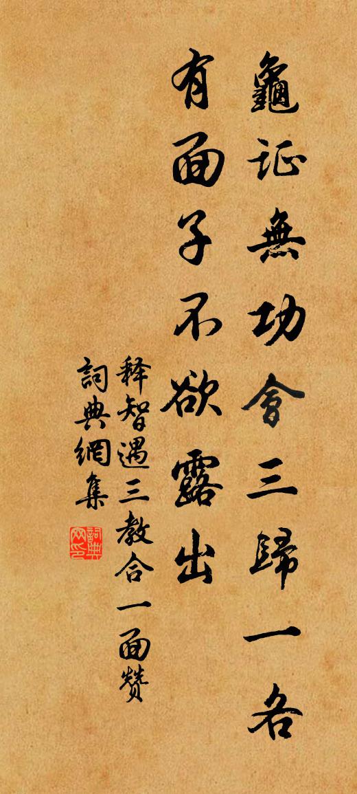 詩詞名句歷史字典書法欣賞書法字典國語詞典說文解字康熙字典古漢語字典標 題 作 者 詩 句 三教合一面贊作者:釋智遇 朝代:宋代三教合一面贊原文龜證無功,會三歸一。各有面子,不欲露出。詩詞問答問:三教合一面贊的作者是誰?答:釋智遇問:三教合一面贊寫於哪個朝代?答:宋代釋智遇三教合一面贊書法欣賞三教合一面贊書法作品詩詞推薦上元陸游〔宋代〕病起衰顏非昔紅,偷閒聊與少年同。一規寒玉掛樓角,千點華星來坐中。久戍遺民雖困弊,承平舊鎮尚繁雄。歸時十一月十九日瑞雪應時百寮入賀仆以病告翌日李洪〔宋代〕拂曉開閶闔,來朝萬玉妃。遙知花六出,爭瑞日重暉。入賀鵷鴻綴,迎鑾錦繡圍。鞏梅春最早,香透赭黃衣。次韻弟觀晚春風雨陳著〔宋代〕分得天機自動簧,與春相約不參商。無情有態眉如畫,是曲非腔口尚黃。公子舊呼歸夢境,友生新好出村莊。山窗感春方岳〔宋代〕春風來無邊,草木含華滋。道旁有枯荄,昨夜方葳蕤。陽和本根在,芽甲生光輝。造化亦何心,榮悴各有時。伯封同游霅上事畢遽索別次韻李洪〔宋代〕同來我復似鄒游,新詠君應勝杜秋。已飫蒸葫汝南饌,盍為粗糲浣花留。殘樽且醉菖蒲酒,去棹聊停杜若洲。不厭次韻劉南伯二首王之望〔宋代〕十年蹤跡困邅如,多謝韋郎肯寄書。千里漫尋苕水夢,一廛方對相山居。歸心不為蓴鱸切,交契應閒簡牘疏。近向送陳宗諭進叔晉接赴慶元添卒及乃弟泰來四首王邁〔宋代〕玉季吾心友,經行話舊遊。定知龍有種,又快鶚橫秋。對策空丹臆,為兄賽一籌。功名相迫遂只許片時留。用林侄韻賦雪蘇轍〔宋代〕密雪來何晚,窮冬候欲差。投空落細米,布地淨平沙。繚繞飛相著,重仍積暗加。雨微花破碎,風細腳傾斜。次第書南事梅堯臣〔宋代〕大梁國南門,馹騎方騰趨。波波一何急,蠻寇圍番禺。番禺本無備,前賴魏大夫。大夫築子城,今得守以須。兵雖讀改元詔口號戴復古〔宋代〕國以人為重,人惟德可招。九重方厲政,諸老盡歸朝。盛事追三代,清風動百僚。切聞天上語,歡喜到漁樵。贈尤檢正四首趙蕃〔宋代〕榜舟浙江潮,僦屋長安雪。寒濤幸少年,積凍還復結。雖逃蛟鱷虞,未免薪芻絕。噂{左口右沓}悵難登,囁嚅羞瀟湘二十韻齊己〔唐代〕二水遠難論,從離向坎奔。冷穿千嶂脈,清過幾州門。闊去都凝白,傍來盡帶渾。經游聞舜禹,表里見乾坤。浦靜挽徐吏部二首劉克莊〔宋代〕昔過高陽里,宮牆許一窺。有樓藏冊子,無院處歌姬。羅雀閉窮巷,殺雞留晚炊。欲攜船鯽往,道遠嘆吾衰。師伯渾用韻複次晁公溯〔宋代〕日翻蠹簡書齋里,往往編摹自漢朝。雞距束毫來武信,馬肝琢硯出高要。時因撫事歌成相,更復懷人作大招。知子吳娃曲陸游〔宋代〕臂上燒香拜佛前,願郎安穩過新年。多情已是長多病,莫要留心在妾邊。偈頌九十三首釋梵琮〔宋代〕山叢林與入叢林,一句當機絕古今。不涉流清到底,九江江水未為深。橫林望見惠山,寄懷尤延之三首楊萬里〔宋代〕惠山一別十年強,雪後精神老更蒼。白玉屏風三萬丈,半天遮斷大湖光。和尹懋秋夜遊灉湖張說〔唐代〕灉湖佳可游,既近復能幽。林里棲精舍,山間轉去舟。雁飛江月冷,猿嘯野風秋。不是迷鄉客,尋奇處處留。嶺南道中曹松〔唐代〕百花成實未成歸,未必歸心與志違。但有壺觴資逸詠,盡交風景入清機。半川陰霧藏高木,一道晴蜺雜落暉。遊子詠以人與天地萬物為一體刻印章詩徐元傑〔宋代〕三才中立囿形均,昧者拘拘利乃身。不道有身皆有血,豈應知我不知人。其間一物容虧性,是即四肢頑不仁。洞洞名句推薦天與三台座,人當萬里城。張九齡《奉和聖制送尚書燕國公赴朔方》 怒濤卷霜雪,天塹無涯。柳永《望海潮·東南形勝》 輦轂繁華事可傷,師師垂老過湖湘劉子翬《汴京紀事》 魚書經歲絕,燭淚流殘月。徐燦《菩薩蠻·秋閨》 為問山翁何事,坐看流年輕度,拚卻鬢雙華。葉夢得《水調歌頭·秋色漸將晚》 弓背霞明劍照霜,秋風走馬出鹹陽。令狐楚《少年行四首·其三》 青山橫北郭,白水繞東城李白《送友人》 別夢依稀咒逝川,故園三十二年前。 * 《七律·到韶山》 何事吟余忽惆悵,村橋原樹似吾鄉。王禹偁《村行·馬穿山徑菊初黃》 被酒莫驚春睡重,賭書消得潑茶香,當時只道是尋常。納蘭性德《浣溪沙·誰念西風獨自涼》