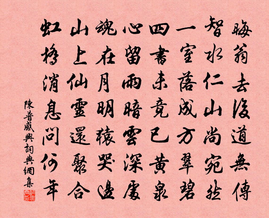 詩詞名句歷史字典書法欣賞書法字典國語詞典說文解字康熙字典古漢語字典標 題 作 者 詩 句 感興作者:陳普 朝代:宋代感興原文晦翁去後道無傳,智水仁山尚宛然。一室落成方翠碧,四書未竟已黃泉。心留雨暗雲深處,魂在月明猿哭邊。山上仙靈還聚合,虹橋訊息問何年。詩詞問答問:感興的作者是誰?答:陳普問:感興寫於哪個朝代?答:宋代陳普感興書法欣賞感興書法作品詩詞推薦金縷曲/賀新郎劉辰翁〔宋代〕吾鬢如霜蕊。自江南、西風塵起,倒騎禿尾。舊日汾陽中書令,何限門生兒子。到今也、陸沈草昧。醉里不行西州浣溪沙·憶舊蘇軾〔宋代〕長記鳴琴子賤堂。朱顏綠髮映垂楊。如今秋鬢數莖霜。聚散交遊如夢寐,升沈閒事莫思量。仲卿終不避桐鄉。挽參與蔡公三首劉克莊〔宋代〕蔡公遂委篤,朝野共噓欷。子不稅冕去,王將以袞歸。風濤如此急,人物眇然稀。自古難全傳,今無一可譏。春詞毛滂〔宋代〕玉甃蘭封麝,瑤池柳養金。宸章先造化,摛藻自春林。浪淘沙裴湘〔宋代〕雁塞說並門。郡枕西汾。山形高下遠相吞。古寺樓台依碧嶂,煙景遙分。晉廟鎖溪雲。簫鼓仍存。牛羊斜日自歸村寶陀三句釋普濟〔宋代〕寶陀一玄,制臂揎拳。打失鼻孔,蒼天蒼天。故端明尚書汪公輓詞二首韓元吉〔宋代〕獻納高門地,君王識履聲。閩山歌惠政,蜀道憺威名。逝矣嗟天命,誰歟總國成。弟兄無六十,殄瘁亦堪驚。富景園時周端臣〔宋代〕地比諸園小,池從前代開。猶餘喬木在,曾見上皇來。幽徑埋黃葉,空庭來綠苔。荒寒吟思怯,落日獨徘徊。賦佳人嗅梅圖李行中〔宋代〕蠶眉鴉鬢縷金衣,折得梅花第幾枝。嗅盡余香不回面,思量何事立多時。侍從徐國公殿下軍行詩庾信〔南北朝〕八風占陣氣。六甲候兵韜。置府仍張幕。麾軍即秉旄。長旗臨廣武。烽火照成皐。巡寒重挾纊。酌水勝單醪。陣後筍脯一平馳寄因和雲歲詩為一笑春筍未盛尚續張栻〔宋代〕權門極珍羞,未辦食龍肉。我家湘楚山,籜龍飫奴僕。淮南戶戶有黃虀,公今徑歸亦不痴。更包筍脯贈行李,定應論語絕句一百首張九成〔宋代〕豈是區區務相師,尋常一事不容欺。及階及席方皆坐,猶告之曰某在斯。示子虡陸游〔宋代〕好學承家夙所奇,蠹編殘簡共娛嬉。一婚倘畢吾無累,三釜雖微汝有期。聿弟元知是難弟,德兒稍長豈常兒。要令類試院放榜眾論以得士為慶作古詩一章呈詳定鄭剛中〔宋代〕書生業辭藝,不為覓科舉。胸中負器識,筆下有今古。君看阿房賦,豈是布衣語。獨其在糊名,貴賤惟所主。得之登金山寺齊己〔唐代〕四面白波聲,中流翠嶠橫。望來堪目斷,上徹始心平。鳥向天涯去,雲連水國生。重來與誰約,題罷自吟行。食鱠王洋〔宋代〕生長江湖中,厭食水中珍。從得脫死來,頗見級味親。每食無不飽,敢歡蔬茹貧。老妻生過計,為我鱠鮮鱗。飣餖頃在金陵郡齋與黃觀復夜坐漏箭下一二十刻率蘇泂〔宋代〕映雪工夫久已無,引錐自刺一何愚。青燈一盞書狼藉,畫作金陵瞌睡圖。元日感事方回〔宋代〕羞將白髮見青春,世事何關蟻虱臣。去就時難千里夢,是非論定百年身。偶然不死由天地,尚可無慚對鬼神。敢問南鄉子朱敦儒〔宋代〕宮樣細腰身。玉帶羅衫穩試新。小底走來宣對御,催頻。曲殿西廂小苑門。歌舞斗輕盈。不許楊花上錦茵。勸得君昭君詞李端〔唐代〕李陵初送子卿回,漢月明時惆悵來。憶著長安舊遊處,千門萬戶玉樓台。名句推薦雙星良夜,耕慵織懶,應被群仙相妒。范成大《鵲橋仙·七夕》 孤煙村際起,歸雁天邊去。孟浩然《南歸阻雪》 拼將一死酬知己,致令千秋仰義名。羅貫中《三國演義·第五十回》 自從明宰投巫後,直至如今鬼不神汪遵《西河》 人皆可以為堯舜。孟子《孟子·告子章句下·第二節》 澤國江山入戰圖,生民何計樂樵蘇。曹松《己亥歲二首·僖宗廣明元年》 想當年,金戈鐵馬,氣吞萬里如虎。辛棄疾《永遇樂·京口北固亭懷古》 養備而動時,則天不能病;修道而不貳,則天不能禍。荀子《荀子·天論》 中夜四五嘆,常為大國憂。李白《經亂離後天恩流夜郎憶舊遊書懷贈江夏韋太守良宰》 江涵秋影雁初飛,與客攜壺上翠微。杜牧《九日齊山登高》