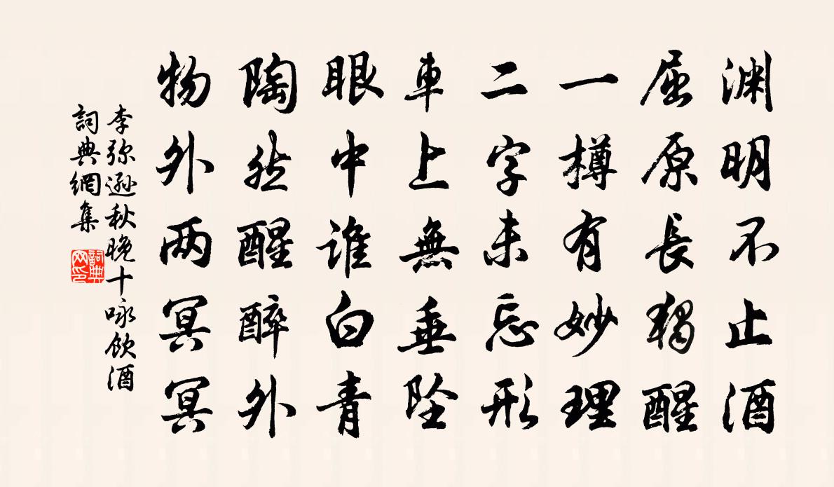 詩詞名句歷史字典書法欣賞書法字典國語詞典說文解字康熙字典古漢語字典標 題 作 者 詩 句 秋晚十詠飲酒作者:李彌遜 朝代:宋代秋晚十詠飲酒原文淵明不止酒,屈原長獨醒。一樽有妙理,二字未忘形。車上無垂墜,眼中誰白青,陶然醒醉外,物外兩冥冥。詩詞問答問:秋晚十詠飲酒的作者是誰?答:李彌遜問:秋晚十詠飲酒寫於哪個朝代?答:宋代李彌遜秋晚十詠飲酒書法欣賞秋晚十詠飲酒書法作品詩詞推薦八風從律蔣防〔唐代〕制律窺元化,因聲感八風。還從萬籟起,更與五音同。習習蘆灰上,泠泠玉管中。氣隨時物好,響徹霽天空。自得暮村趙釴夫〔宋代〕陰村煙樹暝黃昏,一簇人家半掩門。看盡棲鴉啼噪後,牧童歸去雨聲繁。踏莎行·雪似梅花呂本中〔宋代〕雪似梅花,梅花似雪。似和不似都奇絕。惱人風味阿誰知?請君問取南樓月。記得去年,探梅時節。老來舊事無人贈山友琴友釋文珦〔宋代〕雲影晝沉沉,雲邊草徑深。樹為幽鳥宅,山是隱人心。靜室無他物,清風寄一琴。調高唯自識,不問有知音。涉淮泝清迫於冰涸舟次下邳先寄彭門趙侍御二宋庠〔宋代〕病骨憂南土,孤懷念北遷。欣承紫泥詔,且向汶陽田。夜雪淮冰合,朝暾海氣鮮。風波雖繚繞,自有故交憐。詩約范直夫游萬葉寺觀瀑泉洪邁〔宋代〕范侯隱下吏,夙尚本丘園。身投攫金市,聚書以自藩。炯然如孤月,不愛黃流渾。要知句律工,競病何足論。我生東華觀偃松徐仲雅〔唐代〕半已化為石,有靈通碧湘。生逢堯雨露,老直漢風霜。月滴蟾心水,龍遺腦骨香。始於毫末後,曾見幾興亡。送李大著赴闕項安世〔宋代〕玉觀金橋無限時,楚臣漢女不勝悲。如今蕩蕩平平矣,卻合融融洩洩之。八陛加恩須大冊,三朝修史待宏規。回頭頌古塔祖勝二首李石〔宋代〕蘆花岸下蓼灘頭,上得鉤時便上鉤。一曲漁歌川掉撥,五湖煙水月輪秋。清平樂袁去華〔宋代〕嫩涼新霽。明月光如洗。長笛一聲煙際起。人在危樓獨倚。夜深風露娟娟。抱琴誰和流泉。只有乘鸞仙子,見人愁謁和靖先生虎丘祠堂李道傳〔宋代〕涵養當用敬,進學在致知。如車去只輪,跬步不可之。夫子受師說,惟敬實所持。升堂逮易簀,參倚日在斯。遺言新亭三首馬之純〔宋代〕新亭見說在山頭,看見江河袞袞流。何事後人輕變改,不教遺址且存留。憐他一代稱賢相,說此諸人似楚囚。若使一叢花袁去華〔宋代〕東風吹恨著眉心。金約瘦難任。西窗翦燭渾如夢,最愁處、南陌分襟。香歇繡囊,塵生羅幌,憔悴到如今。小花幽小市暮歸陸游〔宋代〕愛酒行行訪市酤,醉中亦有稚孫扶。林梢殘葉吹都盡,煙際孤舟遠欲無。野餉每思羹苜蓿,旅炊猶得飯雕胡。青山仙壇寺西林林景熙〔宋代〕古壇仙鶴杳,野鹿自成群。鬆氣浮清曉,經聲出白雲。石穿僧屋過,水到寺門分。人世無窮事,山中了不聞。山居雜詩九十首曹勛〔宋代〕蓋屋不在華,所欲庇風雨。種花品無繁,四時看開處。指喻多非約,日涉乃成趣。吾年能幾日,景物亦漫與。送沈沅陵趙蕃〔宋代〕世官花古所譏,花世祿今不花。要之苟有人,二者非苦背。君祖我曾祖,紹聖同廷對。素風我莫嗣,清德君可輩。送梁藤州廣譽解組還朝兼簡葛子章盧伯真曾豐〔宋代〕乾道淳熙間,隨牒公之邑。我閒時曳裾,公喜當折屐。過從未多時,情好已相得。功名打門催,馬首遽湖北。一為答問詩十二篇寄呈滿子權其四鎛問耒王令〔宋代〕天下方漫蕪,顧我適有庸。使其已除滌,我將何以功。我豈大無效,自是用我慵。幽居雜題陸游〔宋代〕開歲頻風雨,清明氣始和。游山書半廢,耽酒睡常多。客去孫登嘯,牛疲甯戚歌。餘生猶有幾?盡底付漁蓑。名句推薦舉善從諫,在上之明規; 進賢謁言,為臣之令范。姚思廉《陳書·本紀·卷五》 郎到斷橋須有路,儂住處,柳如金。張惠言《江城子·填張春溪西湖竹枝詞》 放逐肯消亡國恨?歲時猶動楚人哀!查慎行《三閭祠》 魯女東窗下,海榴世所稀。李白《詠鄰女東窗海石榴》 友者、所以相有也。道不同,何以相有也?荀子《荀子·大略》 肥水東流無盡期。當初不合種相思。姜夔《鷓鴣天·元夕有所夢》 戍鼓斷人行,邊秋一雁聲。杜甫《月夜憶舍弟》 姑蘇台上烏棲時,吳王宮裡醉西施。李白《烏棲曲》 去時梅萼初凝粉。不覺小桃風力損。歐陽修《玉樓春·去時梅萼初凝粉》 凡失其所欲之路而妄行者之謂迷韓非及後人《韓非子·解老》