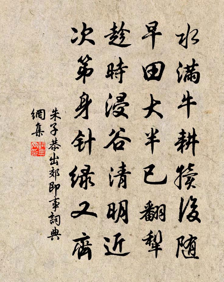 詩詞名句歷史字典書法欣賞書法字典國語詞典說文解字康熙字典古漢語字典標 題 作 者 詩 句 出郊即事作者:朱子恭 朝代:宋代出郊即事原文水滿牛耕犢後隨,早田大半已翻犁。趁時浸谷清明近,次第身針綠又齊。詩詞問答問:出郊即事的作者是誰?答:朱子恭問:出郊即事寫於哪個朝代?答:宋代朱子恭出郊即事書法欣賞出郊即事書法作品詩詞推薦今日何夕曾豐〔宋代〕今夕何夕,綿雨其零。於昨之日,維蜩始鳴。句徐鉉〔唐代〕一夜黃星照官渡,本初何面見田豐。奉和襲美太湖詩二十首包山祠陸龜蒙〔唐代〕靜境林麓好,古祠煙靄濃。自非通靈才,敢陟群仙峰。百里波浪沓,中坐簫鼓重。真君具瓊輿,仿佛來相從。清露閒居對食書媿陸游〔宋代〕老病家居幸歲穰,味兼南北飫枯腸。滿脾蜜熟餭餭美,下棧羊肥餺飥香。鱍剌河魴初出水,迷離穴兔正迎霜。山僧醉中歌陸游〔宋代〕文章日益近衰陋,風節久己嗟陵夷。元佑大蘇逝不返,慶曆小范今誰知!閉門學古人共笑,低頭就俗我卻疑。脫衣送倪敦復朝奉宋祁〔宋代〕倪侯喜清曠,遇物乃虛舟。富貴知輕視,胸懷肯誤投。青雲非近器,滄海納群流。道在從顕,功名晚可收。即事張嵲〔宋代〕落日邊書急,秋風戰鼓多。私憂真過計,長算合如何。盡欲清淮戍,仍收瀚海波。棲遲一尊酒,幽恨滿關河。玉泉瀑蔡必勝〔宋代〕珠箔飛空澗布流,卷舒曾不用銀鉤。懸崖灑灑清涵雪,越壑溶溶冷澀秋。勢動羽鱗應若是,韻諧宮徵亦相侔。水晶生查子曾覿〔宋代〕溫柔鄉內人,翠微閣中女。顏笑洛陽花,肌瑩荊山玉。東君深有情,解與花為主。移傍楚峰居,容易為雲雨。游秀峰寺胡珵〔宋代〕攝身下蓬萊,放浪雲水跡。非無簡書畏,心賞寄泉石。亭亭雲間塔,勝地聞自昔。梯空上青冥,如鳥著兩翼。化城頌古一百二十一首釋宗杲〔宋代〕好一殿功德,總是過去佛。百福相嚴身,不使栴檀刻,日日香菸夜夜燈,看來當甚乾蘿葡。寄管叔儀通判並同官樓鑰〔宋代〕執別僧房日未斜,別離愁緒滿天涯。清宵已落柔桑葉,小雨頓開蕎麥花。醉里不知身是客,酒闌無奈客思家。憑誰長田舖二首趙蕃〔宋代〕野驛人稀到,空庭草自生。霜清殊未覺,雨細更含晴。贈魏衍三首陳師道〔宋代〕敏捷為文筆不休,何妨縮手小遲留。名駒已自思千里,老子終當讓一頭。旅館秋夕李鹹用〔唐代〕牢落生涯在水鄉,只思歸去泛滄浪。秋風螢影隨高柳,夜雨蛩聲上短牆。百歲易為成荏苒,丹霄誰肯借梯航?若教寄董無益仇遠〔宋代〕郵鈴帶箭發紛紛,何日山深耳不聞。遷客無鄉難避禍,饑民失業半充軍。馬蹄亂踏湖西雪,雁陣平拖塞北雲。我亦句孔延之〔宋代〕天目遠隨雙鳳落,海門遙蹙兩潮趨。游山陽十首陳造〔宋代〕故人不復倒奚囊,但有荒阡蔭白楊。魂定可招吾得已,試吟楚些命巫陽。都堂試貢士日慶春雪李景〔唐代〕密雪分天路,群才坐粉廊。靄空迷晝景,臨宇借寒光。似暖花消地,無聲玉滿堂。灑池偏誤曲,留硯忽因方。幾處儗過錢塘約諸客同賦羅公升〔宋代〕去者勿戚戚,來者勿赫赫。天地猶乘除,萬古晨有夕。詎知今時今,不作異時異。吳山越山青,舊日錢王宅。名句推薦秋空明月懸,光彩露沾濕。孟浩然《秋宵月下有懷》 青天有月來幾時?我今停杯一問之。李白《把酒問月·故人賈淳令予問之》 若得山花插滿頭,莫問奴歸處。嚴蕊《卜運算元·不是愛風塵》 偶應非熊兆,尊為帝者師。劉基《題太公釣渭圖》 橫看成嶺側成峰,遠近高低各不同。蘇軾《題西林壁》 知音如不賞,歸臥故山秋。賈島《題詩後》 凡音者,產乎人心者也。呂不韋《呂氏春秋·紀·季夏紀》 弗知而言為不智,知而不言為不忠。劉向《戰國策·秦一·張儀說秦王》 秀色掩今古,荷花羞玉顏。李白《西施 / 詠薴蘿山》 興,百姓苦;亡,百姓苦!張養浩《山坡羊·潼關懷古》