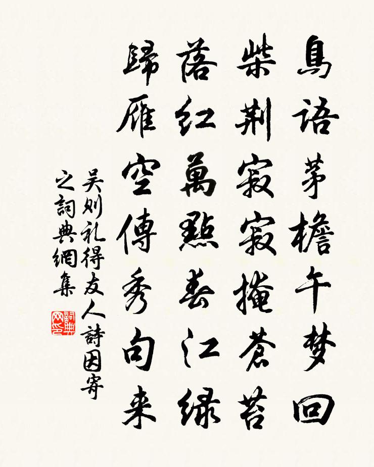 詩詞名句歷史字典書法欣賞書法字典國語詞典說文解字康熙字典古漢語字典標 題 作 者 詩 句 得友人詩因寄之作者:吳則禮 朝代:宋代得友人詩因寄之原文鳥語茅檐午夢回,柴荊寂寂掩蒼苔。落紅萬點春江綠,歸雁空傳秀句來。詩詞問答問:得友人詩因寄之的作者是誰?答:吳則禮問:得友人詩因寄之寫於哪個朝代?答:宋代吳則禮得友人詩因寄之書法欣賞得友人詩因寄之書法作品詩詞推薦秋日書懷張舜民〔宋代〕涼風起天末,何物動人愁。一室關河暮,三年草木秋。高文誰吊屈,晚節漫依劉。獨怪瀼西叟,巴江得久留。夏日四絕潘良貴〔宋代〕掃地焚香避濕蒸,睡余茶熟碾聲清。風來桐竹僛舞,雨過階除虢虢鳴。別洪山預和尚釋正覺〔宋代〕般游念未穩,又別住山人。雁影水中字,雲心江上賓。同條如是住,千里亦成鄰。深翠一枝璽,腐紅五合陳。回途瓠子歌劉徹〔兩漢〕河湯湯兮激潺湲。北渡回兮迅流難。搴長筊兮湛美玉。河公許兮薪不屬。薪不屬兮衛人罪。燒蕭條兮噫乎何以御水感懷二首趙蕃〔宋代〕佳客與涼風,俱來破蘊隆。風流自江左,材秀又湘中。未暇嗟渠屈,端知慰我窮。囊錢嘆元叔,斗酒羨無功。詠梅五十首呈史尚書釋紹嵩〔宋代〕一樹寒梅白玉條,傍岩隈石韻蕭蕭。詩孱無奈陳橋月,月照清香太易消。失調名張良臣〔宋代〕昨日豆花籬下過,忽然迎面好風吹。獨自立多時。悼濟陽夫人陳傅良〔宋代〕久接江山境,曾論子姓文。於焉觀內則,可以繼前聞。榛栗嚴賓豆,苹蘩潔祀芬。有人言不朽,片石合摩雲。題蘇端明書乳泉賦後王學可〔宋代〕蘇公時聞道,文章乃其戲。乳泉出重海,作賦聊記異。玉池咽中夜,挈瓶非小智。氣者水之生,此語可深味。酬盧十一過宿皇甫冉〔唐代〕乞還方未遂,日夕望雲林。況復逢春草,何勞問此心。閉門公務散,枉策故情深。遙夜他鄉酒,同君梁甫吟。送楊彥極提刑二首劉克莊〔宋代〕繡斧翩翩向福唐,百城斂衽避風霜。夢回桑下初何戀,手植棠陰故未忘。判筆有神皆可錄,抄書無數即行裝。從今送商總郎三首洪咨夔〔宋代〕百尋浮玉三更月,萬里長江一色秋。照映此心須此水,不妨小泊讀書舟。小憩栟楮楊萬里〔宋代〕箏輿放下倦騰騰,睡倚胡床撼不應。櫸柳細花吹面落,誤揮團扇撲飛蠅。壬辰十二月車駕東狩後即事元好問〔金代〕慘澹龍蛇日鬥爭,干戈直欲盡生靈。高原出水山河改,戰地風來草木腥。精衛有冤填瀚海,包胥無淚哭秦庭。并州贈葛氏小娘子潘雍〔唐代〕曾聞仙子住天台,欲結靈姻愧短才。若許隨君洞中住,不同劉阮卻歸來。琵琶行白玉蟾〔宋代〕長江浩浩送千古,江流不斷魚龍舞。蘆花荻花愁暮雲,天風吹我客湓浦。移舟回首思故人,悽然一登琵琶亭。琵琶奉酬李相公見示絕句(時初聞國喪)白居易〔唐代〕碧油幢下捧新詩,榮賤雖殊共一悲。涕淚滿襟君莫怪,甘泉侍從最多時。雪晴楊凝式〔唐代〕春來冰未泮,冬至雪初晴。為報方袍客,豐年瑞已成。紹興祀九宮貴神十首佚名〔宋代〕於昭毖祀,周旋有容。歷階將事,趙進鞠躬。改步如初,沒階彌恭。左城右平,陟必雍雍。閨人贈遠五首王涯〔唐代〕花明綺陌春,柳拂御溝新。為報遼陽客,流芳不待人。遠戍功名薄,幽閨年貌傷。妝成對春樹,不語淚千行。形影名句推薦古者聖人為猛禽狡獸暴人害民,於是教民以兵行。墨子《墨子·21章 節用(中)》 志,氣之帥也。孟子《孟子·公孫丑章句上·第二節》 四海皆兄弟,誰為行路人。佚名《舊題蘇武詩 / 別詩四首·其一》 習讀書之業,便當知讀書之樂王永彬《圍爐夜話·第五五則》 魏都接燕趙,美女夸芙蓉。李白《魏郡別蘇明府因北游》 漸老念鄉國,先歸獨羨君。簡長《送僧南歸》 百二禁兵辭象闕,三千宮女下龍舟。許渾《汴河亭》 候館梅殘,溪橋柳細。歐陽修《踏莎行·候館梅殘》 禁里疏鍾官舍晚,省中啼鳥吏人稀。王維《酬郭給事 / 贈郭給事》 木蘭舟上,何處吳娃越艷:藕花紅照臉。孫光憲《河傳·風颭》