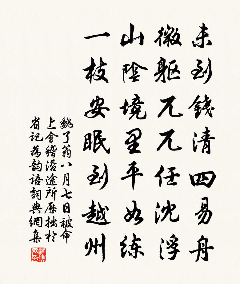 詩詞名句歷史字典書法欣賞書法字典國語詞典說文解字康熙字典古漢語字典標 題 作 者 詩 句 八月七日被命上會稽沿途所歷拙於省記為韻語作者:魏了翁 朝代:宋代原文未到錢清四易舟,微軀兀兀任沈浮。山陰境裡平如練,一枝安眠到越州。詩詞問答問:《八月七日被命上會稽沿途所歷拙於省記為韻語》的作者是誰?答:魏了翁問:該詩寫於哪個朝代?答:宋代書法欣賞八月七日被命上會稽沿途所歷拙於省記為韻語書法作品詩文賞析【原題】:八月七日被命上會稽沿途所歷拙於省記為韻語以記之舟中馬上隨得書不復敘次詩詞推薦楝花張蘊〔宋代〕綠樹菲菲紫白香,猶堪纏黍吊沉湘。江南四月無風訊,青草前頭蝶思狂。赴闕次留獻荊南成相公三十韻吳融〔唐代〕分閫兼文德,持衡有武功。荊南知獨去,海內更誰同。拔地孤峰秀,當天一鶚雄。雲生五色筆,月吐六鈞弓。骨格木蘭花慢 西湖送春 詞品卷六梁曾〔元代〕問花花不語,為誰落,為誰開。算春色三分,半隨流水,半入塵埃。人生能幾歡笑,但相逢、尊酒莫相催。千古幕寄懷二十首趙蕃〔宋代〕早起陰晴殊未分,杜鵑何許叫深雲。眼中忽爾生新句,何異風行水面紋。贈成都六祖沙彌文信頌黃庭堅〔宋代〕塵是文信,界是沙彌。積塵成世界,析界作微塵。界喻人天果,塵為有漏因。塵因因不實,界果果非真。因果皆如探春令趙長卿〔宋代〕而今風韻,舊時標緻,總皆奇絕。再相逢還是,春前臘後,粉面凝香雪。芳心自與群花別。盡孤高清潔。那情懷最興化縣劉克莊〔宋代〕繞縣百千峰,初疑路不通。居民猶太古,令尹似春風。箏遠呼難至,杯寒吸易空。卻從歸路望,飛榭半天中。送張仲山守唐安二首李流謙〔宋代〕六十專城發未斑,更於何地覓三山。不妨談笑催科里,正賴清涼熱惱間。到日紅梅留臘在,公餘翠榴酌春慳。胡床題馬和之畫四小景楊娃〔宋代〕石楠葉落小池清,獨下平橋弄扇行。倚日綠雲無覓處,不知歸去兩三聲。楚狂接輿歌先秦無名〔先秦〕鳳兮鳳兮何德之衰也。來也不可待。往事不可追也。天下有道。聖人成焉。天下無道。聖人生焉。方今之時。僅免清平樂(登第)李彌遜〔宋代〕燭花催曉。醉玉頹春酒。一騎東風訊息到。占得鱉頭龍首。長安去路駸駸。明朝躍馬芳陰。應是花繁鶯巧,東君著無夢令 四十一首 贈景公馬鈺〔元代〕物外先生姓景。酒色氣財常警。稍稍覺偏頗,不待他人自儆。自儆。自儆。得步長生內境。古鑒釋智圓〔宋代〕土蝕菱花有微竅,懸向秋堂光照耀。寫出人人妍醜姿,西施始免嫫母笑。山詰石室清坐鄧深〔宋代〕時登大石樓,雅愛小石室。欠伸欲打頭,星臥可舒膝。明潔意自寬,深沉境逾寂。藏春絕嚴風,生秋無畏日。天設與謬栓法同行口占分水嶺詩駱羅憲〔宋代〕驛路新發掌面平,揚塵從此去朝京。清風只欠蒼松立,留待他時我種成。雜曲歌辭。茱萸女萬楚〔唐代〕山陰柳家女,九日采茱萸。復得東鄰伴,雙為陌上姝。插花向高髻,結子置長裾。作性恆遲緩,非關詫丈夫。平明賈島墓李洞〔唐代〕一第人皆得,先生豈不銷。位卑終蜀士,詩絕占唐朝。旅葬新墳小,魂歸故國遙。我來因奠灑,立石用為標。秋園見蝶宋祁〔宋代〕撲粉曾過宋玉牆,一身生計托流芳。不須長結東風怨,秋菊春蘭各有香。和叔崇清明後四絕王柏〔宋代〕把酒留春尚肯留,幾多生意聚詩眸。可憐桃李無涵養,只有桑麻自進修。西鹿田寺聽雨方鳳〔宋代〕禪棲投倦客,山雨起更闌。窗葉散幽響,石林生峭寒。洞深猶暗瀑,江遠忽飛湍。想像雲蘿外,應宜曉色看。名句推薦紛披乍依迥,掣曳或隨風。李世民《詠興國寺佛殿前幡》 客行野田間,比屋皆閉戶。姚合《莊居野行》 兵可千日而不用,不可 一日而不備。李大師、李延壽《南史·列傳·卷六十一》 山中無甲子,寒盡不知年。吳承恩《西遊記·第一回》 處事最當熟思緩處。熟思則得其情,緩處則得其當。陳繼儒《小窗幽記·集醒篇》 正西望長安,下見江水流。李白《秋浦歌十七首》 道人庭宇靜,苔色連深竹。柳宗元《晨詣超師院讀禪經》 陌上花開蝴蝶飛,江山猶是昔人非。蘇軾《陌上花三首》 淺情終似,行雲無定,猶到夢魂中。晏幾道《少年游·離多最是》 秋曉上蓮峰,高躡倚天青壁陸游《好事近·秋曉上蓮峰》