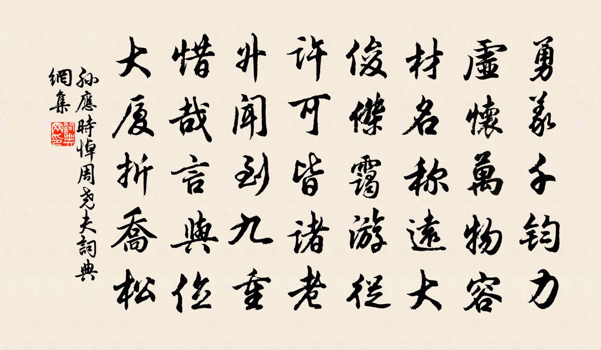 詩詞名句歷史字典書法欣賞書法字典國語詞典說文解字康熙字典古漢語字典標 題 作 者 詩 句 悼周堯夫作者:孫應時 朝代:宋代悼周堯夫原文勇義千鈞力,虛懷萬物容。材名稱遠大,俊傑靄游從。許可皆諸老,升聞到九重。惜哉言與位,大廈折喬松。詩詞問答問:悼周堯夫的作者是誰?答:孫應時問:悼周堯夫寫於哪個朝代?答:宋代孫應時悼周堯夫書法欣賞悼周堯夫書法作品詩詞推薦無夢令馬鈺〔元代〕一避無涯火院。二避利名縈絆。三避敬欽頻,自是田分三段。堪看。堪看。金玉結成光燦。題單令雙清閣胡寅〔宋代〕中扃有天游,一室四海見。倘無空虛地,六鑿互爭戰。琴堂故蕭爽。向也正牆面。棘茨莽蒙蔽,鼷鼠紛旋轉。劃除賜緋魚梅堯臣〔宋代〕蹉跎四十七,腰間始懸魚。茜袍雖可貴,發短齒已疏。兒女眼未識,競來牽人裾。不知外朝眾,君恩慚有餘。戊早年七夕五絕張秉〔宋代〕北斗城高禁漏多,漢家宮殿奏笙歌。漫教青鳥傳訊息,金簡長生得也么。鷓鴣徐夤〔唐代〕繡仆梅兼羽翼全,楚雞非瑞莫爭先。啼歸明月落邊樹,飛入百花深處煙。避燒幾曾遺遠岫,引雛時見飲晴川。荔枝絕句鄭文寶〔宋代〕江雲薄薄日斜暉,江館蕭條獨掩扉。梁燕不知人事改,雨中猶作一雙飛。滿江紅蘇軾〔宋代〕憂喜相尋,風雨過、一江春綠。巫峽夢、至今空有,亂山屏簇。何似伯鸞攜德耀,簞瓢未足清歡足。漸粲然、光彩書事十首劉克莊〔宋代〕不似堯夫快活身。罪已綸言遍九州,桑榆雖晚尚堪收。下山東詔爭扶聽,讀奉天書有淚流。加霍嫖姚冠軍號,拜車句張釜〔宋代〕五峰遙拱千岩秀。再賦葺居三絕蘇轍〔宋代〕南北高堂本富家,百年樑柱半欹斜。略教扶起猶堪住,西望吾廬已自奢。清平樂·淒淒切切納蘭性德〔清代〕淒淒切切,慘澹黃花節。夢裡砧聲渾未歇,那更亂蛩悲咽。塵生燕子空樓,拋殘弦索床頭。一樣曉風殘月,而今觸寄周宗聖釋永頤〔宋代〕我心如有失,曾未識南園。幾見間花落,頻將好夢原。時賢我厚祿,君子尚衡門。詩卷逢僧寄,長吟落照村。郊祀慶成詩蘇軾〔宋代〕帝出乘昌運,天心予太平。文章三代繼,製作七年成。大祀乾坤合,剛辰日月明。泰壇朝埽地,魄寶夜垂精。仰御游郭駙馬大安山池羊士諤〔唐代〕馬嘶芳草自淹留,別館何人屬細侯。仙杏破顏逢醉客,彩鴛飛去避行舟。洞簫日暖移賓榻,垂柳風多掩妓樓。坐閱魯墟礎陸游〔宋代〕魯墟無復壞垣存,偶榜舟來入亂雲。杜曲桑麻猶鬱郁,桃源雞犬亦欣欣。青圍舊墅千峰立,綠引官河一脈分。我卜春間小詩書趙壁追錄之朱槔〔宋代〕小語不知夕,幽香無盡時。影寒人慾醉,明月照酴醾。寄南康徐大夫孔武仲〔宋代〕山南泉石有餘清,幾日籃輿天上行。亦欲西園伴飛蓋,龐公不慣入州城。望月有所思駱賓王〔唐代〕九秋涼風肅,千里月華開。圓光隨露湛,碎影逐波來。似霜明玉砌,如鏡寫珠胎。晚色依關近,邊聲雜吹哀。離居送彭子復臨海令滿秩孫應時〔宋代〕相逢幾何時,相與何如話。書來警吾過,切切父兄語。人生會合難,念別成悽楚。北望山千里,秋容渺煙渚。詩一首毛維瞻〔宋代〕峭拔神仙宅,來尋煙水重。深應盤九地,高不讓群峰。瞻對奇勝畫,捫緣直豈容。幾時蓮葉下,終古鮮紋對。往事名句推薦正而過則迂,直而過則拙,故迂拙之人,猶不失為正直。王永彬《圍爐夜話·第一一O則》 萬里橋西一草堂,百花潭水即滄浪。杜甫《狂夫》 千磨萬擊還堅勁,任爾東西南北風。鄭燮《竹石》 相識滿天下,知心能幾人?佚名《增廣賢文·上集》 輕輕飛動,把賣花人搧過橋東王和卿《醉中天·詠大蝴蝶》 子規啼徹四更時,起視蠶稠怕葉稀。謝枋得《蠶婦吟》 獨有宦遊人,偏驚物候新。杜審言《和晉陵陸丞早春遊望》 數人世相逢,百年歡笑,能得幾回又。何夢桂《摸魚兒·記年時人人何處》 盡做舊愁都忘卻,新愁何處著王庭筠《謁金門·雙喜鵲》 疾風知勁草,板蕩識誠臣。李世民《賜蕭瑀》