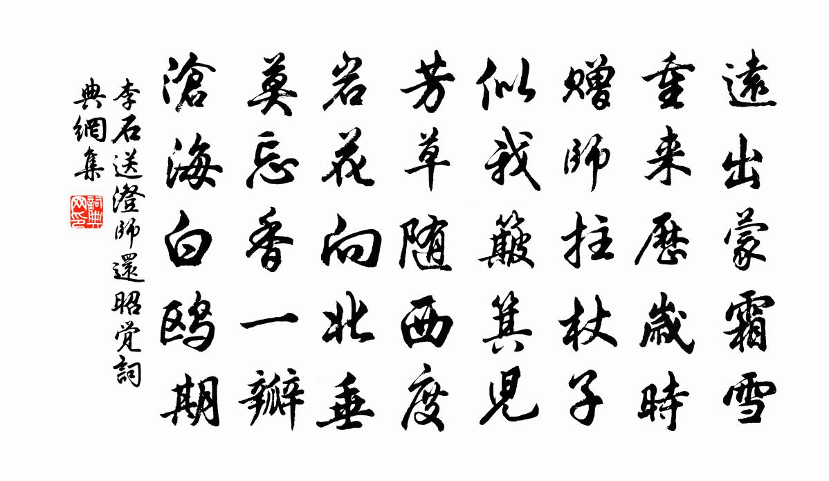 詩詞名句歷史字典書法欣賞書法字典國語詞典說文解字康熙字典古漢語字典標 題 作 者 詩 句 送澄師還昭覺作者:李石 朝代:宋代送澄師還昭覺原文遠出蒙霜雪,重來歷歲時。贈師拄杖子,似我簸箕兒。芳草隨西度,岩花向北垂。莫忘香一瓣,滄海白鷗期。詩詞問答問:送澄師還昭覺的作者是誰?答:李石問:送澄師還昭覺寫於哪個朝代?答:宋代李石送澄師還昭覺書法欣賞送澄師還昭覺書法作品詩詞推薦早發剡山(一作趙嘏詩)薛逢〔唐代〕正懷何謝俯長流,更覽餘封識嵊州。樹色老依官舍晚,溪聲涼傍客衣秋。南岩氣爽橫郛郭,天姥雲晴拂寺樓。日暮過雪溪周南〔宋代〕晴溪帆卷艣聲柔,兩岸青紅濕未收。欲問三吳清絕處,碧瀾堂下採蓮舟。冬至前月赴季父梅花之集與韓蒲向憲唐乾諸人胡寅〔宋代〕不管霜威日夜侵,肯教飛蝶到深深。六花漫爾呈三白,一萼居然映萬林。軟玉香冰空自惱,芳心愁思遣誰禁。市橋送陳先生之洪井寄蕭少卿徐鉉〔唐代〕聞君仙袂指洪厓,我憶情人別路賒。知有歡娛游楚澤,更無書札到京華。雲開驛閣連江靜,春滿西山倚漢斜。此處次韻子瞻書黃庭內景卷後贈蹇道士拱辰蘇轍〔宋代〕君誦《黃庭》內外篇,本欲洗心不求仙。夜視片月墮我前,黑氛剝警日妍。一暑一寒久自堅,體中風行上通天。亭句郭贄〔宋代〕高低草木芽爭發,多少龍蛇眼未開。送王子文宰昭武真德秀〔宋代〕百諫或繞指,粹白俄成緇。有初諒非難,其難在終之。道心眇絲粟,易為群物移。不有精一功,誰能勝惟危。子今洞庭入澧江寄巴丘故人李群玉〔唐代〕四月桑半枝,吳蠶初弄絲。江行好風日,燕舞輕波時。去事旋成夢,來歡難預期。唯憑東流水,日夜寄相思。任道源轉示玉艷亭探梅詩卷未暇屬和閏月十一張鎡〔宋代〕因花不作等閒來,屐印苔紋酒便回。明日窗前追昨夢,似逢姑射不逢梅。驪姬墓下作(夷吾、重耳墓,隔河相去十三里)岑參〔唐代〕驪姬北原上,閉骨已千秋。澮水日東注,惡名終不流。獻公恣耽惑,視子如仇讎。此事成蔓草,我來逢古丘。蛾眉送長兄赴調上都次田俊卿韻二首廖行之〔宋代〕從今日日聽新除,去馬加鞭不用徐。最是好為三釜計,不妨頻寄萬金書。君行霄漢無留軔,我得江湖欲縱魚。更念環珠洞呂願中〔宋代〕朝野樂昇平,園林窮勝討。快雨洗塵埃,秋山淨如埽。游魚聚江灣,飢烏集木杪。群芳郁崢嶸,一水翠繚繞。雲頭孫賁知衢州去疑冢以其所得雙石作堂乞詩張舜民〔宋代〕芝蘭雖好忌當門,何況庭前惡土墩。畚鍤才興雙劍出,狐狸盡去老松蹲。百年守冢真堪笑,一日開軒亦可尊。安得鴛鴦夢(臨江仙)賀鑄〔宋代〕午醉厭厭醒自晚,鴛鴦春夢初驚。閒花深院聽啼鶯。斜陽如有意,偏傍小窗明。莫倚雕闌懷往事,吳山楚水縱橫。和徐季功舒蘄道中二十首王之道〔宋代〕春雲漠漠雨纖纖,花柳叢邊見酒帘。心為惜春無處著,可堪啼鳥更般添。景福東廂詩怪石司馬光〔宋代〕昔去江湖鄉,來與松桂接。圭角老龍脊,鋒棱秋劍鋏。歷亂枯苔點,交橫敗莎葉。會使成都人,更取神蓍揲。和陳義卿秋香吳芾〔宋代〕小園無處著清香,誰剖頭栗玉黃。可恨楚人元未識,只知蘭芷是孤芳。孤雁陸龜蒙〔唐代〕我生天地間,獨作南賓雁。哀鳴慕前侶,不免飲啄晏。雖蒙小雅詠,未脫魚網患。況是婚禮須,憂為弋者篡。晴鳶再用儒字韻二首辛棄疾〔宋代〕人才長與世相疏,若謂無才即厚誣。方朔長身無飯吃,人間飽死幾侏儒。絕句二首周文璞〔宋代〕入春便與僧為友,紫萼黃英見坐禪。昨日鄰翁催入社,謝他只是說無錢。名句推薦君子有三樂,而王天下不與存焉。孟子《孟子·盡心章句上·第二十節》 重幃深下莫愁堂,臥後清宵細細長。李商隱《無題·重幃深下莫愁堂》 露清枕簟藕花香,恨悠揚。顧敻《虞美人·觸簾風送景陽鍾》 奇文共欣賞,疑義相與析。陶淵明《移居二首》 倚杖柴門外,臨風聽暮蟬。王維《輞川閒居贈裴秀才迪》 老來多健忘,唯不忘相思。白居易《偶作寄朗之》 白馬繞旌旗,悲鳴相追攀。李白《豫章行》 翠貼蓮蓬小,金銷藕葉稀。李清照《南歌子·天上星河轉》 日暮秋煙起,蕭蕭楓樹林。戴叔倫《過三閭廟》 聽其言,跡其行,察其所能而慎予官。墨子《墨子·09章 尚賢(中)》