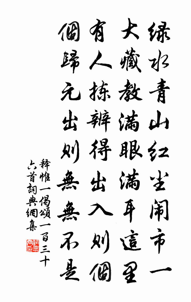 詩詞名句歷史字典書法欣賞書法字典國語詞典說文解字康熙字典古漢語字典標 題 作 者 詩 句 偈頌一百三十六首作者:釋惟一 朝代:宋代偈頌一百三十六首原文綠水青山,紅塵鬧市。一大藏教,滿眼滿耳。這裡有人揀辨得出,入則個個歸元,出則無無不是。詩詞問答問:偈頌一百三十六首的作者是誰?答:釋惟一問:偈頌一百三十六首寫於哪個朝代?答:宋代釋惟一偈頌一百三十六首書法欣賞偈頌一百三十六首書法作品詩詞推薦春羈詩鮑照〔南北朝〕征人嘆道遐。去鄉愒路邇。佳期每無從。淮陽非尺咫。春日都游心。勞情出徙倚。岫遠雲煙綿。谷屈泉靡迤。風起久不作討呈王適蘇轍〔宋代〕憐君多病仍經暑,笑我微官長坐曹。落日東軒談不足,秋風北棹意空勞。懶將詞賦占鴞臆,頻夢江湖把蟹螯。筆硯滿江紅(再和)李曾伯〔宋代〕小小池亭,仿佛似、洛川岩壑。天付與、老身遊戲,餘生吃著。剩喜酒能消思慮,翻疑書解妨人樂。聽雨翁、白雪醉垂鞭(贈琵琶娘,年十二)張先〔宋代〕朱粉不須施,花枝小。春偏好。嬌妙近勝衣。輕羅紅霧垂。琵琶金畫鳳。雙條重。倦眉低。啄木細聲遲。黃蜂花上冬華一夜霜陳普〔宋代〕天地生萬物,節度各有常。毫髮不可亂,奉時以行藏。不惟寡悔吝,尤可免折傷。倘不如所受,一一皆自伐。今年惜牡丹花二首白居易〔唐代〕翰林院北廳花下作惆悵階前紅牡丹,晚來唯有兩枝殘。明朝風起應吹盡,夜惜衰紅把火看。採薇圖蔡必薦〔宋代〕西山有薇,美人不移。西山無薇,美人不歸。採薇採薇,山是人非。薇滿西山,不生夷齊。金丹詩四十八首張繼先〔宋代〕勞生擾擾疾如風,急殺三彭及五蟲。不使狐狸侵藥灶,須教龍虎守真空。鼎中寶物時添火,腹內嬰貌轉豐。善女善漁家傲(和晏虞卿詠侍兒彈箜篌)危稹〔宋代〕老去諸餘情味淺。詩詞不上閒釵釧。寶幌有人紅兩靨。簾間見。紫雲元在梨花院。十四條弦音調遠。柳絲不隔芙蓉與觀禪者釋正覺〔宋代〕豁淨虛通入覺場,體前一段本來光。孤禪恰恰如擔板,默照明明似面牆。秋光蘆華兩岸雪,夜寒桂月一船霜。迢迢詠石蘇味道〔唐代〕濟北甄神貺,河西濯錦文。聲應天池雨,影觸岱宗雲。燕歸猶可候,羊起自成群。何當握靈髓,高枕絕囂氛。首尾吟邵雍〔宋代〕堯夫非是愛吟詩,詩是堯夫語事時。舉動苟能循義理,辯明安用致言辭。艱難圖處費心力,容易來時省指揮。欲蓋瑞鷓鴣王哲〔元代〕修行孰是練金丹。練就方知兩事全。七返不容開四戶,九還應是轉三田。氣神交結為珍寶,靈性分明作大仙。今日客歸二首汪炎昶〔宋代〕繞牆煙樹色籠蔥,燕人鶯過路不通。客子歸來誤驚喜,移家別住綠陰中。冷泉解後友人留飲陳起〔宋代〕倦叟尋芳藉短筇,故人解後一尊同。明霞浸水疑鋪錦,彩閣橫溪儼臥虹。猿去復歸啼曉嶂,僧來相伴立春風。雪濤夏夜陸游〔宋代〕乞骸安晚節,養疾臥空村。月暗梟鳴樹,船歸犬吠門。藜羹加糝美,黍酒帶醅渾。稚子能勤學,燈前與細論。贈術士邵易庵何夢桂〔宋代〕易道面皆萬變,面萬彙寄一面易。大道面降九流,至理散方術。譬猶八面窗,八方可從入。譬猶九達衢,九軌所由偈頌一百三十六首釋惟一〔宋代〕瞿曇未解這一著,雪嶺六年空卜度。不知眼病見空花,認作明星一何錯。自累猶可,更累兒孫。珊瑚枕上兩行淚,湯嶺溫泉柳德驥〔宋代〕化工何事起炎涼,偏使山中泉作湯。地氣燭燭燒石乳,水香鬱郁噴硫磺。暄波常涌無冬夏,勢溜長澌歷雪霜。聞道楊秘校秋懷宋祁〔宋代〕治畹當樹蘭,治林當植桂。蘭生可香國,桂茂絕聚薈。邈哉志士節,所趣與人異。意經千古上,心包九垠際。道勝名句推薦壯志飢餐胡虜肉,笑談渴飲匈奴血。岳飛《滿江紅·寫懷》 卷盡愁雲,素娥臨夜新梳洗。吳文英《點絳唇·試燈夜初晴》 居安思危。思則有備,有備無患左丘明《左傳·襄公·襄公十一年》 煙籠寒水月籠沙,夜泊秦淮近酒家。杜牧《泊秦淮》 利人乎即為,不利人乎即止。墨子《墨子·32章 非樂(上)》 採蓮南塘秋,蓮花過人頭。佚名《西洲曲》 彩舟雲淡,星河鷺起,畫圖難足。王安石《桂枝香·登臨送目》 人生有情淚沾臆,江水江花豈終極!杜甫《哀江頭》 鼎湖流水清且閒,軒轅去時有弓劍,古人傳道留其間李白《飛龍引二首·其二》 南風知我意,吹夢到西洲。佚名《西洲曲》