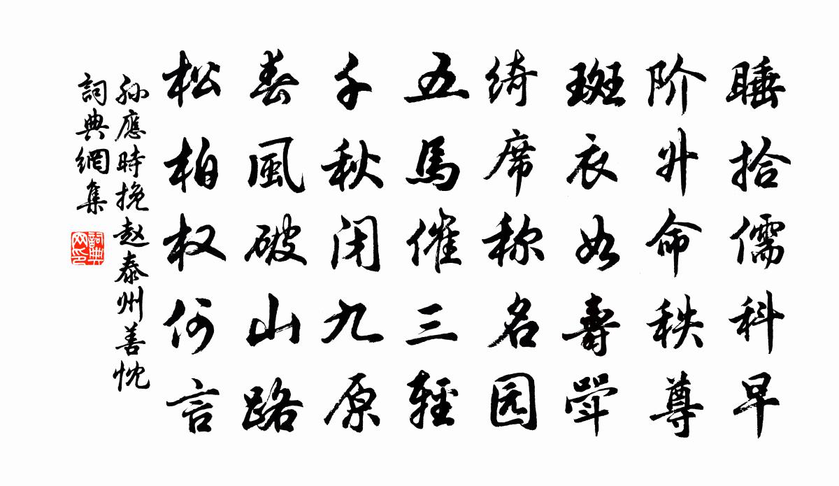 詩詞名句歷史字典書法欣賞書法字典國語詞典說文解字康熙字典古漢語字典標 題 作 者 詩 句 挽趙泰州善忱作者:孫應時 朝代:宋代挽趙泰州善忱原文睡拾儒科早,階升命秩尊。斑衣如壽斝,綺席稱名園。五馬催三輕,千秋閉九原。春風破山路,松柏權何言。詩詞問答問:挽趙泰州善忱的作者是誰?答:孫應時問:挽趙泰州善忱寫於哪個朝代?答:宋代孫應時挽趙泰州善忱書法欣賞挽趙泰州善忱書法作品詩詞推薦文峰講行昏禮和起潛韻錢時〔宋代〕自是無人別是非,何曾此外更精微。一門濟濟今成俗,政要回頭悟指歸。賦新繁周表權如詔亭閻灝〔宋代〕承家愛以義,能誨仕之忠。故里推全德,先生有古風。中郎銀組白,刺史錦衣紅。浩矣無窮樂,春熙醉笑中。琴曲歌辭湘妃怨孟郊〔唐代〕南巡竟不返,帝子怨逾積。萬里喪蛾眉,瀟湘水空碧。冥冥荒山下,古廟收貞魄。喬木深青春,清光滿瑤席。搴芳喜晴李流謙〔宋代〕一秋今日是新晴,晚稻懸知有幾分。抱濕庭蕪猶靡靡,傍暄溪卉俗欣欣。顛風料理丹楓樹,返照留連白鷺群。搖落挽伯父二首洪咨夔〔宋代〕憶作行邊別,相期到鶴州。秋風驚過眼,落日懶回頭。華屋空遺憾,佳城足遠謀。無從扶柩哭,揮淚寄江流。故蘄州玉刑部閣老輓歌五首楊億〔宋代〕雞省曾三入,鰲峰近十旬。命書批鳳尾,諫疏逆龍鱗。按部朱轓遠,悲秋素髮新。茂陵終不起,遺札滿埃塵。奉和聖制南郊禮畢詩李德裕〔唐代〕磬筦歌大呂,冕裘旅天神。燒蕭辟閶闔,祈谷為蒸人。羽旗灑輕雪,麥隴含陽春。昌運歲今會,王猷從此新。三臣詠史上武帝陳普〔宋代〕幾多愛子出蕭關,山積胡沙骨未還。正好望思台上淚,隨風北去灑陰山。長干行·家臨九江水崔顥〔唐代〕家臨九江水,來去九江側。同是長乾人,生小不相識。去者日以疏佚名〔兩漢〕去者日以疏,來者日以親。出郭門直視,但見丘與墳。古墓犁為田,松柏摧為薪。白楊多悲風,蕭蕭愁 * 。思還夜權德輿〔唐代〕猿聲到枕上,愁夢紛難理。寂寞深夜寒,青霜落秋水。壽定叟弟張栻〔宋代〕聞說嚴人愛貳車,呻吟赴愬賴攜扶。從今充擴應無倦,千里疲民待子蘇。再次習池詩韻寄程帥二首陳造〔宋代〕南園勝絕真堪畫,邊上誰為李伯時。山納嫩嵐侵密坐,花駢紅影闖清池。吟箋傳遍鴛鴻友,舞袖輕於翡翠兒。東府酒泉子 武水幽瀾(在縣東三十六里武水)吳鎮〔元代〕一*幽瀾,景德廊西苔蘚合,茶經第七品其泉。清冽有靈源。亭間梁棟書題滿。翠竹蕭森映池館。門前一水接華亭三月望日微雨汎舟西湖四首張鎡〔宋代〕倭纈簾垂柳外樓,睹妝微露玉搔頭。承平氣象應如此,憶殺金明水殿游。題翁道人竹軒胡寅〔宋代〕寄語東陽翁道人,開軒種竹意何親。經年又看龍孫上,晚歲寧憂鳳食貧。風月肯來聊競爽,塵囂不到獨相親。何時寄棲白上人齊己〔唐代〕萬國爭名地,吾師獨此閒。題詩招上相,看雪下南山。內殿承恩久,中條進表還。常因秋貢客,少得掩禪關。送蔣子立赴河南試蔡戡〔宋代〕槐花拂拂弄輕黃,白紵雲趨翰墨場。魯國儒冠能有幾,長沙舞袖頗相妨。英材自是千人敵,小試猶爭一日長。來歲語兒見新月徐凝〔唐代〕幾處天邊見新月,經過草市憶西施。娟娟水宿初三夜,曾伴愁蛾到語兒。宿蔣庵胡圭〔宋代〕松色聳寒青,雲庵夜未扃。行吟滿林葉,坐聽一僧經。江獺鳴如鬼,山燈遠似星。自能消冷漠,不用酒盈瓶。名句推薦籬落疏疏一徑深,樹頭花落未成陰。楊萬里《宿新市徐公店》 宿草春風又,新阡去歲無。楊萬里《寒食上冢》 空山梵唄靜,水月影俱沉。納蘭性德《水調歌頭·題西山秋爽圖》 朱顏那有年年好,逞艷游、贏取如今韓疁《高陽台·除夜》 亭上秋風,記去年裊裊,曾到吾廬。辛棄疾《漢宮春·會稽秋風亭觀雨》 天入平湖晴不風,夕帆和雁正浮空。陳與義《登岳陽樓》 漆燕黃鸝夸舌健,柳花榆莢斗身輕。王禹偁《清明日獨酌》 看朱成碧思紛紛,憔悴支離為憶君。武則天《如意娘》 行人無限秋風思,隔水青山似故鄉。戴叔倫《題稚川山水》 一張一弛,文武之道戴聖《禮記·雜記下》