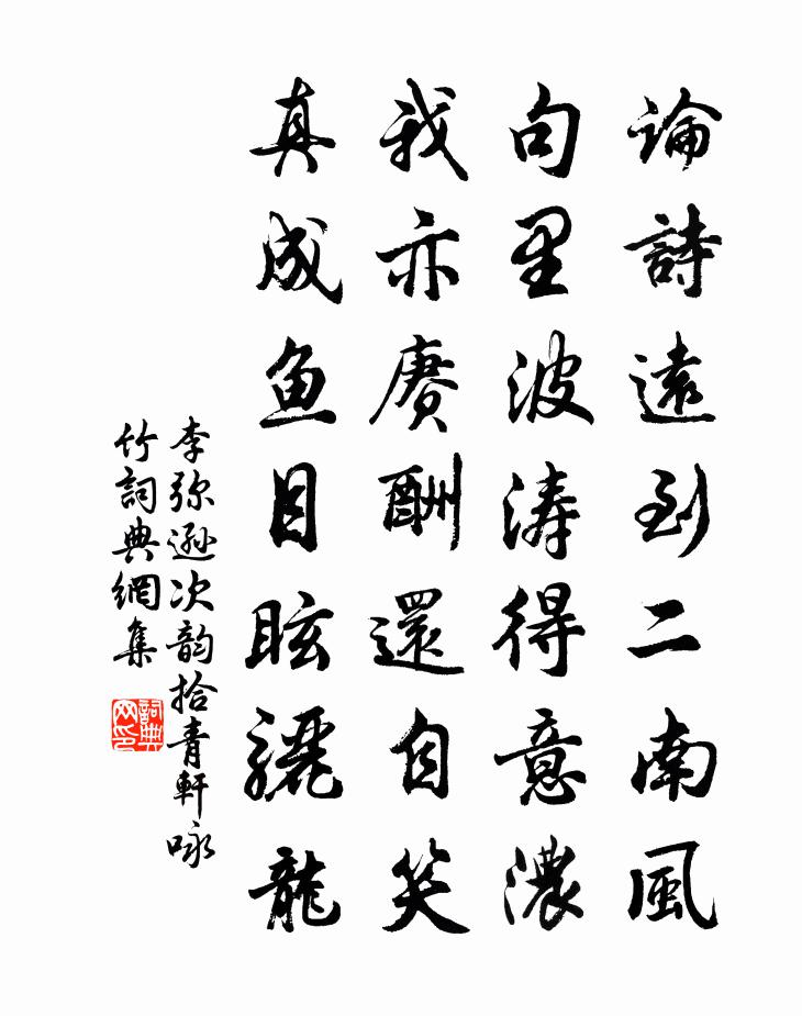 詩詞名句歷史字典書法欣賞書法字典國語詞典說文解字康熙字典古漢語字典標 題 作 者 詩 句 次韻拾青軒詠竹作者:李彌遜 朝代:宋代次韻拾青軒詠竹原文論詩遠到二南風,句里波濤得意濃。我亦賡酬還自笑,真成魚目眩驪龍。詩詞問答問:次韻拾青軒詠竹的作者是誰?答:李彌遜問:次韻拾青軒詠竹寫於哪個朝代?答:宋代李彌遜次韻拾青軒詠竹書法欣賞次韻拾青軒詠竹書法作品詩詞推薦次韻曾仲錫承議食蜜漬生荔支蘇軾〔宋代〕代北寒薺搗韭萍,奇苞零落似晨星。逢鹽久已成枯臘,得蜜猶疑是薄刑。欲就左慈求拄杖,使隨李白跨滄溟。攀條式微晁說之〔宋代〕暮雲朝翼與心飛,白首何堪客子衣。潮去潮來無遠邇,江南江北有從違。廟堂慎用太平策,畎畝先知禍亂機。一唱寄臨海姚中丞杜荀鶴〔唐代〕夏辭旌旆已秋深,永夕思量淚滿襟。風月易斑搜句鬢,星霜難改感恩心。尋花洞裡連春醉,望海樓中徹曉吟。雖有游雲門詹騤〔宋代〕輕裘肥馬春三月,到此經游花正紅。欲覓上方幽隱處,老僧笑指白雲中。登舟梅堯臣〔宋代〕向起風沙地,暫假烏榜還。浩然起遠思,欲與魚鳥閒。景目洗已清,詠句稱且慳。時自秋空雲,雨意濃淡間。宿滎陽甯氏園蘇轍〔宋代〕喧卑背城市,曠盪臨溪水。車流溯絕壁,河潤及桃李。居人有佳思,過客得新喜。中橋一回顧,欲入迷所自。泛前陂王維〔唐代〕秋空自明迥,況復遠人間。暢以沙際鶴,兼之雲外山。澄波澹將夕,清月皓方閒。此夜任孤棹,夷猶殊未還。醉醒一首劉克莊〔宋代〕醉夢發於真性,醒狂或者矯情。左相飲如川吸,龍圖笑比河清。聞秀實歸自臨安有新作戲以小詩寄之四首王洋〔宋代〕永豐西角綠絲垂,盡日無人可得知,聞道梨園采新曲,長安十樣畫宮眉。便風經雁汊宿荻港是日舟行四百里三首岳珂〔宋代〕近岸千帆閱,雄襟一昔舒。雲程排沸浪,風御翼澄虛。塊歷過都馬,波翻縱壑魚。經旬嘆淹滯,此理盍乘除。玉樓春元好問〔金代〕流光不受長繩系。樂事且須論早計。丹成雞犬亦登仙,運去英雄空掩涕。花留酒笑寧無意。酒藉花香尤有味。由來洛陽試院樓上新晴五絕蘇轍〔宋代〕天壇王屋北侵河,高比嵩丘一倍多。小有清靈今尚在,俗緣深重奈成魔。秋夜與劉碭山泛宴喜亭池李白〔唐代〕明宰試舟楫,張燈宴華池。文招梁苑客,歌動郢中兒。月色望不盡,空天交相宜。令人慾泛海,只待長風吹。奉寄魯直學士薛紹彭〔宋代〕瘴地經行促棹謳,周南太史幾年留。後來遙識猶青眼,別久懸知半白頭。宋玉又經巫峽去,謫仙初罷夜郎游。長江塗田釋如淨〔宋代〕劄斷潮頭大海枯,十方公界佃官租。寥寥萬古平如掌,不許傍人揚契書。和共父游青羊宮二首孫應時〔宋代〕訪古未雲已,會心良獨多。猶應趁風月,從此偏岷峨。萬里澹秋色,一江明暮波。他年問魚鳥,能復記相過。冬日宴於庶子宅各賦一字得鮮劉孝孫〔唐代〕解襟游勝地,披雲促宴筵。清文振筆妙,高論寫言泉。凍柳含風落,寒梅照日鮮。驪歌雖欲奏,歸駕且留連。次韻宋履中近謁大慶退食館中秦觀〔宋代〕翠華初到殿中間,三館諸儒共一班。迎謁曉廷清蹕近,退穿春仗彩旓閒。病來怕飲東西玉,老去慚陪大小山。知續趙萬宗入道因寄釋智圓〔宋代〕羔雁已聞徵不起,卻求披戴守貞居。月堂欹枕三清夢,秋榻生塵萬卷書。壇匝冷痕春蘚碧,鶴翹寒影雪杉疏。年來金陵雜興二百首蘇泂〔宋代〕青漆樓高製作奇,當時純不用琉璃。東昏幸自嗤梁武,不道東昏更可嗤。名句推薦日日深杯酒滿,朝朝小圃花開。朱敦儒《西江月·日日深杯酒滿》 黃塵清水三山下,更變千年如走馬。李賀《夢天》 弱齡寄事外,委懷在琴書。陶淵明《始作鎮軍參軍經曲阿作》 樹木何蕭瑟,北風聲正悲。曹操《苦寒行》 責人之心責己,恕己之心恕人。佚名《增廣賢文·上集》 春風不相識,何事入羅幃。李白《春思》 三過平山堂下,半生彈指聲中。蘇軾《西江月·平山堂》 握手西風淚不乾,年來多在別離間。納蘭性德《於中好·送梁汾南還為題小影》 林臥愁春盡,開軒覽物華。孟浩然《清明日宴梅道士房 / 宴梅道士山房》 泛樓船兮濟汾河,橫中流兮揚素波。劉徹《秋風辭》