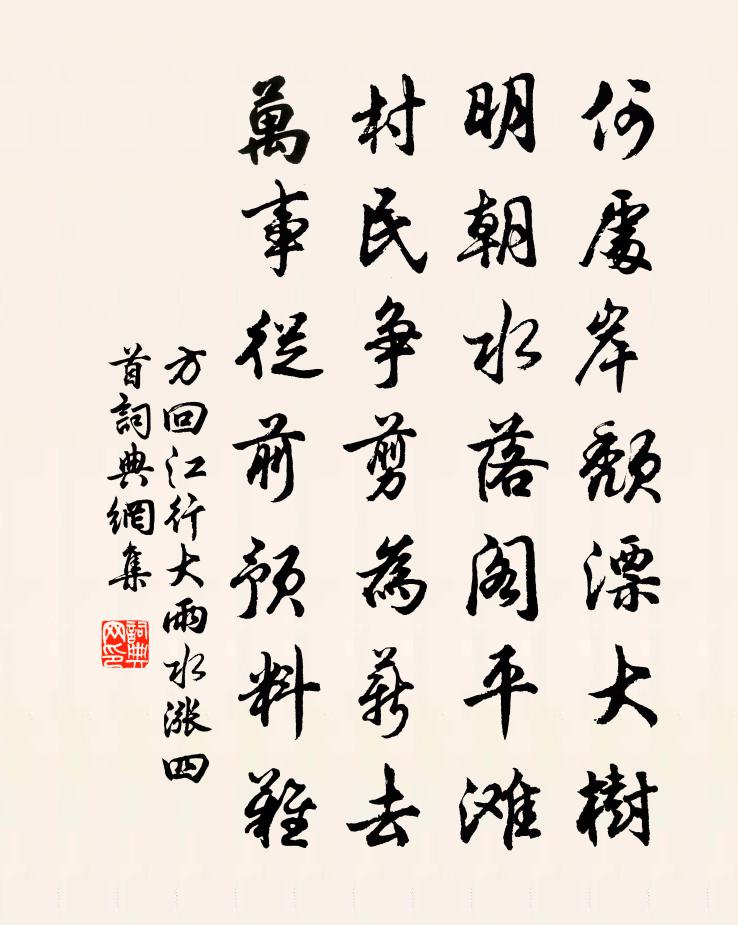 詩詞名句歷史字典書法欣賞書法字典國語詞典說文解字康熙字典古漢語字典標 題 作 者 詩 句 江行大雨水漲四首作者:方回 朝代:宋代江行大雨水漲四首原文何處岸頹漂大樹,明朝水落閣平灘。村民爭剪為薪去,萬事從前預料難。詩詞問答問:江行大雨水漲四首的作者是誰?答:方回問:江行大雨水漲四首寫於哪個朝代?答:宋代方回江行大雨水漲四首書法欣賞江行大雨水漲四首書法作品詩詞推薦梅花絕句陸游〔宋代〕山月縞中庭,幽人酒初醒。不是怯清寒,愁蹋梅花影。溪上月皎然〔唐代〕秋水月娟娟,初生 * 天。蟾光散浦漵,素影動淪漣。何事無心見,虧盈向夜禪。獨樂園七題弄不軒司馬光〔宋代〕吾愛杜牧之,氣調本高逸。結亭侵水際,揮弄消永日。洗硯可抄詩,泛觴宜促膝。莫取濯冠纓,區塵污清質。龍洞何炳然〔宋代〕鬍髯抱嵌岩,白雲擁萬里。若弄華陽珠,我欲割左耳。古宮詞十首劉克莊〔宋代〕何必關山遠,涼風在殿西。簫聲猶裊裊,舞袖忽淒淒。秋日步至湖桑埭西陸游〔宋代〕伏枕衰方劇,搘筇氣忽增。細泉鳴暗竇,疏樹映孤燈。斷雁寒依渚,強魚健脫罾。行纏已無用,卻作在家僧。題項羽廟三首之二賀鑄〔宋代〕楚都陳跡久灰埃,一曲虞兮尚寄哀。不作偷生渡江計,可須千里更西來。漁家傲(中秋月)黃裳〔宋代〕三月為光今夜半。一年人愛今回滿。莫放笙歌容易散。須同玩。姮娥解笑人無伴。抱盡金精來碧漢。醉吟莫作尋常圩田二首楊萬里〔宋代〕古來圩岸護堤防,岸岸行行種綠楊。歲久樹根無寸土,綠楊走入水中央。題任氏傳德集賀鑄〔宋代〕釣魚公子學屠龍,潦倒西班八品中。鼠目獐頭登要地,雞鳴狗盜策奇功。儀刑拔士無光祿,經術傳家有聖童。慨想送崔員外黔中監選綦毋潛〔唐代〕持衡出帝畿,星指夜郎飛。神女雲迎馬,荊門雨濕衣。聽猿收淚罷,系雁待書稀。蠻貊雖殊俗,知君肝膽微。代內答梅堯臣〔宋代〕結髮事君子,衣袂未嘗分。今朝別君思,歷亂如絲棼。征仆尚顧侶,嘶馬猶索群。相送不出壺,倚楹羨飛雲。日暮數日趙崇鉘〔宋代〕數日東風欺病骨,侵凌曉色作輕寒。客來坐久無談柄,共看遊絲上井欄。遣興周文璞〔宋代〕山中雨更愁,不是棄吾州。懷母未能去,訴鄰誰肯留。茶人窮似虱,藥戶狹於舟。一磵多深碧,嘲吟尚自由。病起次韻和稚川進叔倡酬之什黃庭堅〔宋代〕池塘夜雨聽鳴蛙,老境侵尋每憶家。白髮生來驚客鬢,黃粱炊熟又春華。百年不負膠投漆,萬事相依葛與瓜。勝日送朱十翁宋祁〔宋代〕手把臨渦酒,人歸如夢城。何言一歡笑,便作兩離情。園樹丹蕤老,家山鈿髻明。不妨還軫促,芝崦趁春耕。行住坐臥三十二頌釋印肅〔宋代〕雲凍風彌鳥絕蹤,洞山只道沒西東。等閒目擊誰相委,賴遇丹霞作炭紅。莫萬安要平題知津閣趙蕃〔宋代〕勢並江磯起,檐因佛屋高。青羅一縈帶,石黛四周遭。謂我其留句,誰知老不豪。蹔來還亟去,豈亦病滔滔。答趙章泉陳起〔宋代〕新詩將遠意,千里附文鱗。清響蟬噓露,高閒鶴臥雲。但知耕野水,不暇問朝紳。賸欲陪顏笑,淒涼吳楚分。昭君村沈繼祖〔宋代〕黃沙漫空天一色,漠北陰山斷行跡。明妃辭漢適單于,委骨胡沙無來日。心事欲向瑟琶傳,天荒地老何人識。胡雁名句推薦勝法之務莫急於去奸,去奸之本莫深於嚴刑。商鞅《商君書·開塞》 學而時習之,不亦說乎?佚名《論語十則》 萬事莫貴於義。墨子《墨子·47章 貴義》 浮生長恨歡娛少。宋祁《玉樓春·春景》 自聞穎師彈,起坐在一旁。韓愈《聽穎師彈琴》 春草明年綠,王孫歸不歸?王維《送別 / 山中送別 / 送友》 重九開秋節,得一動宸儀。韋安石《奉和九日幸臨渭亭登高應制得枝字》 意輕千金贈,顧向平原笑。李白《古風·齊有倜儻生》 青山一道同雲雨,明月何曾是兩鄉。王昌齡《送柴侍御》 軍歌應唱大刀環,誓滅胡奴出玉關。徐錫麟《出塞》