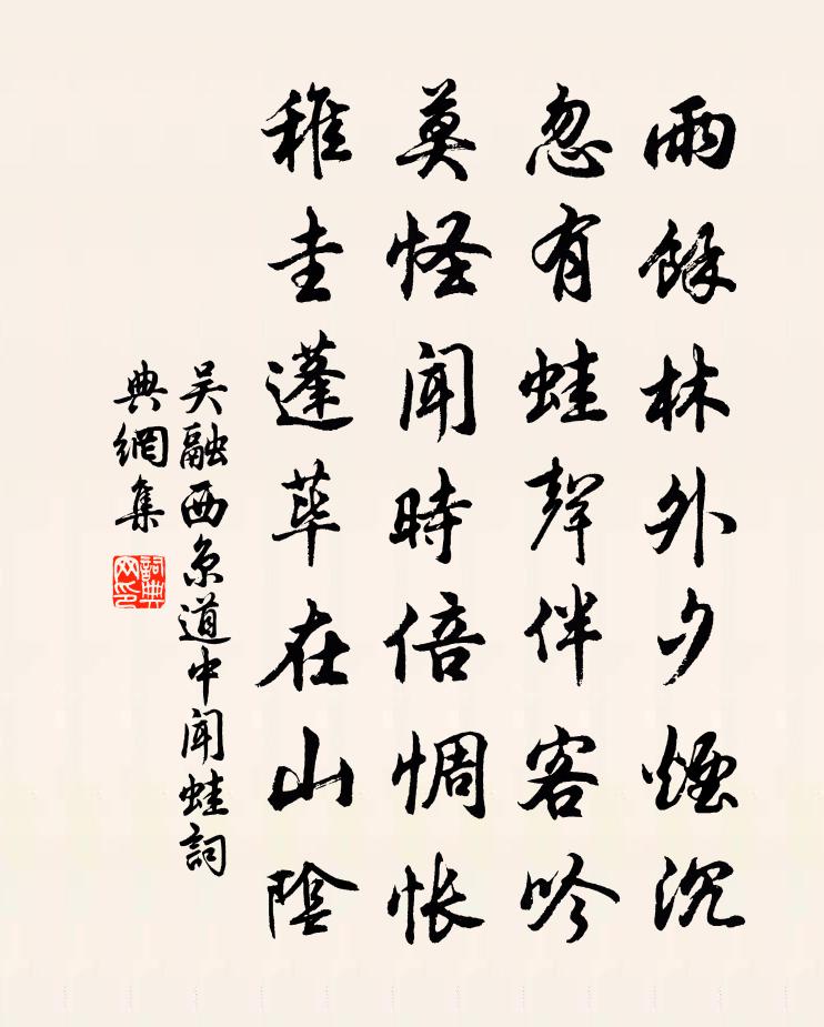 詩詞名句歷史字典書法欣賞書法字典國語詞典說文解字康熙字典古漢語字典標 題 作 者 詩 句 西京道中聞蛙作者:吳融 朝代:唐代西京道中聞蛙原文雨餘林外夕煙沉,忽有蛙聲伴客吟。莫怪聞時倍惆悵,稚圭蓬蓽在山陰。詩詞問答問:西京道中聞蛙的作者是誰?答:吳融問:西京道中聞蛙寫於哪個朝代?答:唐代吳融西京道中聞蛙書法欣賞西京道中聞蛙書法作品詩詞推薦貽傅逸人張詠〔宋代〕少年名節動人群,避俗深居積水濆。幾為典衣留遠客,半來欹枕看閒雲。門連酒舍青苔滑,路近沙汀白鳥分。誰道次韻三首曾幾〔宋代〕白日無偏照,玄冥不作難。有爐如許大,無地可言寒。書腹夤緣曬,禪心邂逅看。呼兒來共此,形影未孤單。水調歌頭 戊申季秋月十有九日,賞芙蓉於汝王寂〔元代〕蓋暮年遊宦之情不能已也岸柳飄疏翠,籬菊減幽香。蝶愁蜂懶無賴,冷落過重陽。應為百花開盡,天公著意留與,錫杖泉張士遜〔宋代〕靈蹤遺幾載,卓錫在高岑。妙法歸何地,清泉流至今。苔花生細細,雲葉映沈沈。桂魄皎清夜,分明六祖心。陽山昱上人訪予吳門寓舍,求為湘竹詩,予辭黃溍〔元代〕道人來自陽山麓,手攜舊種千竿竹。小裁方斛不盈尺,中有瀟湘江一曲。未信天工能爾奇,不知地脈從誰縮?晴窗登幽州台歌陳子昂〔唐代〕前不見古人,後不見來者。念天地之悠悠,獨愴然而涕下。將赴上庠偶成張耒〔宋代〕卷中課最詩成後,枕上功名睡美余。弟子解疑常隱几,輪人能笑久觀書。山林沉痼時搔首,松菊耽淫自荷鋤。乾世虜中紀事蘇頌〔宋代〕夷俗華風事事違,矯情隨物動非宜。腥膻餚膳嘗皆遍,繁促聲音聽自悲。沙昧目看朱似碧,火熏衣染素成緇。退之木蘭花慢 常熟徐氏山園張可久〔元代〕看紅釣魚梅未了,搴杜若,結幽蘭。喜樹遮雲鬢,地開月釣魚,竹*風鬟。投竿。 * 下,似畫舫、和雨閣前灘減字木蘭花沈瀛〔宋代〕雨難禁止。惱得衰翁渾沒喜。一夜南風。北望苕溪震澤通。只雞斗酒。且為晚禾生日壽。不奈之何。今歲田疇晚底次韻翁士秀病起曾協〔宋代〕一間何闊昔未有,擬遣蒼頭問安否。果然示疾毗耶城,靜看醫方出吾肘。平生豪氣乾青雲,客疾來侵豈能久。已知和韋尚書答梓州兄南亭宴集張九齡〔唐代〕棠棣聞餘興,烏衣有舊遊。門前杜城陌,池上曲江流。暇日嘗繁會,清風詠阻修。始知西峙岳,同氣此相求。秋水歌鄭樵〔宋代〕年年秋水崩江石,秋水年年連天碧。山中草木盡號呼,江外魚龍輕虛擲。既憐茅屋化飛蓬,又嘆蝦蟆共枕席。人生中秋望月呈諸友胡仲弓〔宋代〕長空萬里琉璃滑,冰輪碾上黃金闕,清光爍盡滿天星,桂枝搖落蟾蜍活。故雷鋒此盡翹首,望殺 * 眼瀝血。烏鵲送任三舅赴調項安世〔宋代〕火雲燒浪峽中歸,朔雪橫江又語離。一世由來迎送里,多才好去盛明時。人知與我為兄弟,或欲從君間鬢髭。為說清平樂(己卯長至作)毛滂〔宋代〕流光電急。又過書雲日。舊是天津花下客。老對山青水碧。而今轉惜年華。遲陽為緩西斜。試問東君音信,曉寒猶送高三之桂林王昌齡〔唐代〕留君夜飲對瀟湘,從此歸舟客夢長。嶺上梅花侵雪暗,歸時還拂桂花香。浣溪沙歐陽修〔宋代〕燈燼垂花月似霜。薄簾映月兩交光。酒醺紅粉自生香。雙手舞余拖翠袖,一聲歌已釂金觴。休回嬌眼斷人腸。生查子向子諲〔宋代〕相思懶下床,春夢迷蝴蝶。入柳又穿花,去去輕如葉。可堪歧路長,不道關山隔。無賴是黃鸝,喚起空愁絕。題雪竇禪師壁(一作贈雪竇峰禪師)方乾〔唐代〕飛泉濺禪石,瓶注亦生苔。海上山不淺,天邊人自來。長年隨檜柏,獨夜任風雷。獵者聞疏磬,知師入定回。名句推薦一春夢雨常飄瓦,盡日靈風不滿旗。李商隱《重過聖女祠》 坐到三更盡,歸仍萬里賒。戎昱《桂州臘夜》 文章憎命達,魑魅喜人過。杜甫《天末懷李白》 好時節,願得年年,常見中秋月。徐有貞《中秋月·中秋月》 春透水波明,寒峭花枝瘦。秦湛《卜運算元·春情》 白日何短短,百年苦易滿。李白《短歌行》 雲淡風輕近午天,傍花隨柳過前川。程顥《春日偶成·雲淡風輕近午天》 天地無全功,聖人無全能,萬物無全用。列子及其弟子《列子·天瑞》 黃雞白酒,君去村社一番秋。辛棄疾《水調歌頭·送楊民瞻》 美成在久,惡成不及改莊子《莊子·內篇·人間世》