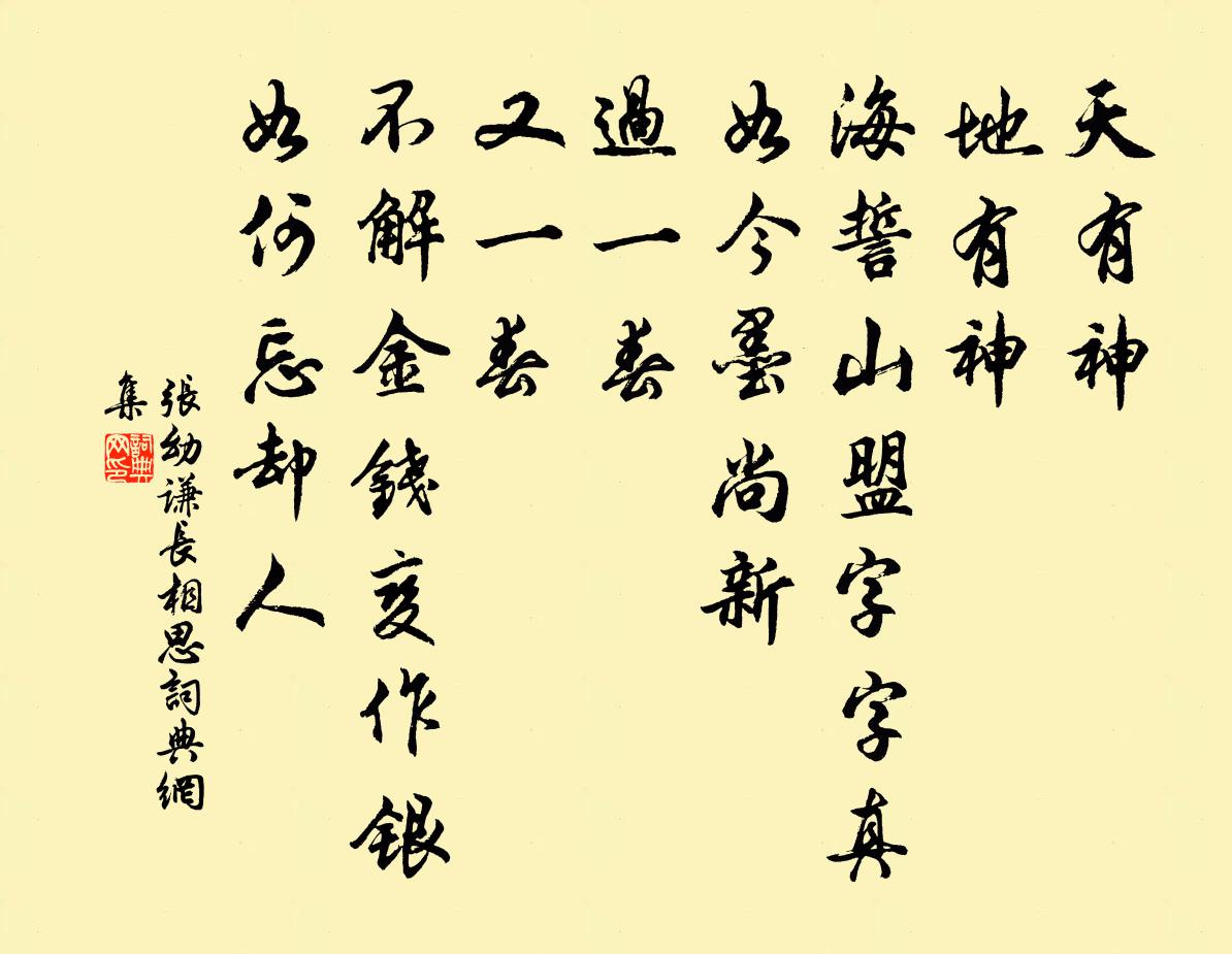 詩詞名句歷史字典書法欣賞書法字典國語詞典說文解字康熙字典古漢語字典標 題 作 者 詩 句 長相思作者:張幼謙 朝代:宋代長相思原文天有神。地有神。海誓山盟字字真。如今墨尚新。過一春。又一春。不解金錢變作銀。如何忘卻人。詩詞問答問:長相思的作者是誰?答:張幼謙問:長相思寫於哪個朝代?答:宋代問:長相思是什麼體裁?答:詞張幼謙長相思書法欣賞長相思書法作品詩詞推薦沁園春林正大〔宋代〕廬阜諸峰,爐峰絕勝,草堂介焉。敞明窗淨室,素屏虛榻,要仰觀山色。俯聽流泉。中有池台,旁多竹卉,夾澗杉再見王進之於潭王即有岳鄂之行贈之四首趙蕃〔宋代〕既見雖雲喜,語離仍復悲。未知今日別,還是幾年期。風雨方頻日,波濤絕壯時。長途久已迫,苦語遂成詩。水龍吟佚名〔宋代〕□□含嬌眼。雲陽寺石竹花司空曙〔唐代〕一自幽山別,相逢此寺中。高低俱出葉,深淺不分叢。野蝶難爭白,庭榴暗讓紅。誰憐芳最久,春露到秋風。榕溪隱者劉克莊〔宋代〕榕溪有隱者,幽事在溪曲。治地可十畝,方整如弈局。始行入荊扉,漸進至茅屋。樹之百盆蘭,繚以萬竿竹。解衣題虎掊泉修睦〔唐代〕一自虎掊得,清聲四遠流。眾人憐爾處,長夜洗心頭。出谷花隨去,背岩猿下偷。林邊落江徼,風起雨翛翛。久留黃池待弟侄不至九日獨酌陽枋〔宋代〕將道花黃醉彭澤,又還茱紫酌平湖。詩因得間時為賦,酒為無賓淺淺沽。藍天色殘千岩柳,霜花催滿萬汀蘆。間行題惠山李郢〔唐代〕乳洞陰陰碧澗連,杉松六月冷無蟬。黃昏飛盡白蝙蝠,茶火數星山寂然。過懷王墓張說〔唐代〕咿嚘不可信,以此敗懷王。客死嶢關路,返葬岐江陽。啼狖抱山月,飢狐獵野霜。一聞懷沙事,千載盡悲涼。聽唱鷓鴣佚名〔唐代〕金谷歌傳第一流,鷓鴣清怨碧雲愁。夜來省得曾聞處,萬里月明湘水流。補和王深甫潁川西湖四篇明月舫蘇頌〔宋代〕明月照寒宵,湖水白如晝。縱覽泊中流,清光應可就。書事何贊〔唐代〕果決生涯向路中,西投知己話從容。雲遮劍閣三千里,水隔瞿塘十二峰。闊步文翁坊里月,閒尋杜老宅邊松。到頭中秋夜半後無雲而月色微淡尤為絕景陸游〔宋代〕輕煙薄靄九霄寒,素月渾如隔縠看。此夕洞庭應更好,誰能從我跨青鸞?題唐三學士圖錢選〔宋代〕唐三學士粲三英,挺挺人才藝術精。無事圍棋春晝永,至今畫筆尚傳名。逍遙詠宋太宗〔宋代〕道妙懷真紀異常,人間天上若存亡。潛機物類多中覷,納取虛無定久長。碧落遨遊歸洞府,黃金不買自馨香。參同秀實監丞復寄二篇譏商彥不至亦微見及因次韻王洋〔宋代〕折除官職是聲稱,利達文章不易並,聯句每容分短韻,五言今始見長城。將軍莊畔傷沉甲,處士廬邊笑盜名。我欲讀張文潛詩二首楊萬里〔宋代〕山谷前頭敢說詩,絕稱漱井掃花詞。後來全集教渠見,別有天珍渠得知。佛手花楊巽齋〔宋代〕丹葩點漆細馨浮,蒼葉輕排指樣柔。香案淨瓶安頓了,還能摩頂濟人不。清商怨惠洪〔宋代〕一段文章種性。更謫仙風韻。畫戟叢中,清香凝宴寢。落日清寒勒花信。愁似海、洗光詞錦。後夜歸舟,雲濤喧醉懷金陵三首張耒〔宋代〕此君堂後青蒼玉,別後何曾寄一聲。想見秦淮月堂下,西風吹浪拍堤平。名句推薦雖有高世之名,無咫尺之功者不賞。劉向《戰國策·秦五·四國為一將以攻秦》 嘆息此人去,蕭條徐泗空李白《經下邳圯橋懷張子房》 斜風細雨不須歸。蘇軾《浣溪沙·漁父》 牝雞無晨;牝雞之晨,惟家之索。佚名《尚書·周書·牧誓》 東風楊柳欲青青。煙淡雨初晴。晏殊《訴衷情·東風楊柳欲青青》 荷葉羅裙一色裁,芙蓉向臉兩邊開。王昌齡《採蓮曲》 思來江山外,望盡煙雲生。張九齡《秋晚登樓望南江入始興郡路》 玉手佳人,笑把琵琶理。顧德輝《蝶戀花·春江暖漲桃花水》 堂上遠於百里,堂下遠於千里,門庭遠於萬里。管仲《管子·法法》 積土成山,風雨興焉;積水成淵,蛟龍生焉;荀子《勸學》