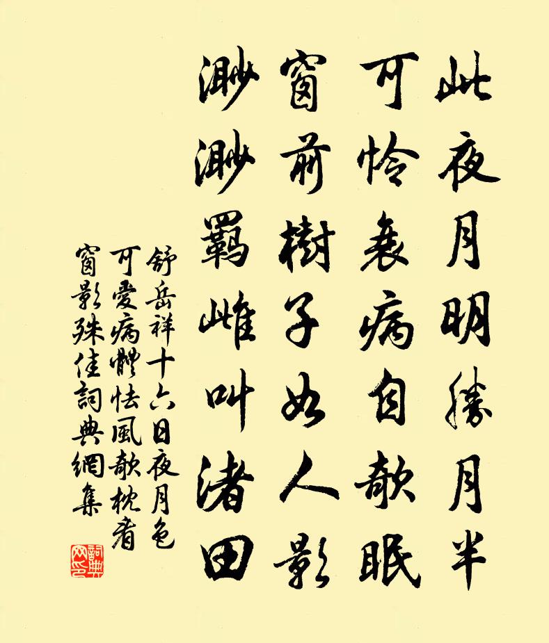 詩詞名句歷史字典書法欣賞書法字典國語詞典說文解字康熙字典古漢語字典標 題 作 者 詩 句 十六日夜月色可愛病體怯風欹枕看窗影殊佳作者:舒岳祥 朝代:宋代原文此夜月明勝月半,可憐衰病自欹眠。窗前樹子如人影,渺渺羈雌叫渚田。詩詞問答問:《十六日夜月色可愛病體怯風欹枕看窗影殊佳》的作者是誰?答:舒岳祥問:該詩寫於哪個朝代?答:宋代書法欣賞十六日夜月色可愛病體怯風欹枕看窗影殊佳書法作品詩詞推薦寄友人陳觀〔宋代〕廢書開復卷,寧與世浮沉。萬事自有分,一生閒用心。天寒快征馬,日暮急歸禽。多少隆中客,空為抱膝吟。良佐留別詩頗悽惋次韻敘閒居之樂以釋之二首陶夢桂〔宋代〕騰騰曉日夕還沉,淺淺秋江春又深。訊息既知由造化,憂愁那得到山林。已吟有興猶重和,未醉開樽任滿斟。浮利五月水益小園陳宓〔宋代〕巋然俯溪亭,偃若與舟接。日涉有初心,風雨或闊躡。閱宗鏡錄釋智愚〔宋代〕百卷非文字,精探海藏深。老胡三寸舌,鏡主幾生心。力破塵勞綱,能銷曠劫金。歸原何所似,花底囀靈禽。次韻魏饒州用蕃唱酬詩卷最後一篇韻見贈之作趙蕃〔宋代〕世紛往往競趨奇,半額真同慕廣眉。我已自知成忤俗,公今豈亦故違時。解鞍屢辱留連飲,出袖仍蒙惠好詩。異縣晚日晁說之〔宋代〕晚日勸我行,我欲留晚日。長途行不近,仆馬有倦色。人生為客多,誰解老一室。果有桃源人,應遭渠笑叱。林節推輓詞戴栩〔宋代〕屋角皇天眼最明,君今吉報在掛城。獨僉綠水花邊字,不並黃金砌上行。權量無私堪宰物,詩書有澤合銷兵。峨峨如夢令(題漁樂圖)張炎〔宋代〕不是瀟湘風雨。不是洞庭煙樹。醉倒古乾坤,人在孤篷來處。休去。休去。見說桃源無路。石頤寺毛滂〔宋代〕碧瓦朱甍紫嶺東,昂雲松桂響寒風。靈泉清映銀床在,無復當年大小空。蓬萊閣 和重陽韻馬鈺〔元代〕清清漠。漂漂運轉蓬萊閣。蓬萊閣。盈盈個內,即非凡廓。炎炎火煉超升藥。時時虎嘯龍吟惡。龍吟惡。真真驚起太令人田氏輓辭二首楊萬里〔宋代〕家食初偕隱,君善晚得嘗。金花千軸告,玉樹五枝香。咫尺相山室,匆朧瓦廟岡。真令淮水絕,依舊慶源長。明遠樓程準〔宋代〕帆帶暮雲歸別浦,崖拖秋色落澄波。天連尺五銀河挽,月倍尋常玉鏡磨。三月二十日詔宴樂遊園賦得風字張說〔唐代〕樂游形勝地,表里望郊宮。北闕連天頂,南山對掌中。皇恩貸芳月,旬宴美成功。魚戲芙蓉水,鶯啼楊柳風。春光呈吳居甫待制張鎡〔宋代〕挺挺風規軼輩流,肯因官譽揜清修。南宮妙畫多時見,北固新篇去歲收。每念小人同話此,曾知閒客到門不。平生句劉滄〔唐代〕海曙雲浮日,江遙水合天。嘲李瑒題名韋蟾〔唐代〕渭水秦山照眼明,希仁何事寡詩情。只因學得虞姬婿,書字才能記姓名。楊秘校秋懷宋祁〔宋代〕治畹當樹蘭,治林當植桂。蘭生可香國,桂茂絕聚薈。邈哉志士節,所趣與人異。意經千古上,心包九垠際。道勝和陳器之謝王澠池牡丹張耒〔宋代〕十首新詩換牡丹,故邀春色入深山。御袍黃粉天然薄,醉臉胭脂分外殷。開晚東君留意厚,落遲晴晝伴春閒。狂來賀新郎(用趙用父左司韻送鄭宗丞)吳潛〔宋代〕又是春殘去。倚東風、寒雲淡日,墮紅飄絮。燕社鴻秋人不問,儘管吳笙越鼓。但短髮、星星無數。萬事惟有彭澤句晃逈〔宋代〕昭然不昧處,靈照在胸中。名句推薦撥雪尋春,燒燈續晝。毛滂《踏莎行·元夕》 天將暮,雪亂舞,半梅花半飄柳絮。馬致遠《壽陽曲·江天暮雪》 事非宜,勿輕諾。苟輕諾,進退錯。李毓秀《弟子規·信》 老母與子別,呼天野草間。李白《豫章行》 錢財如糞土,仁義值千金。馮夢龍《醒世恆言·卷十七》 君子立身,雖雲百行,唯誠與孝最為其首。魏徵《隋書·帝紀·卷二》 一叫一迴腸一斷,三春三月憶三巴。李白《宣城見杜鵑花 / 子規》 寒蟬鳴處,回首斜陽暮。趙彥端《點絳唇·途中逢管倅》 至言忤於耳而倒於心,非賢聖莫能聽韓非及後人《韓非子·難言》 兩情若是久長時,又豈在朝朝暮暮。秦觀《鵲橋仙·纖雲弄巧》