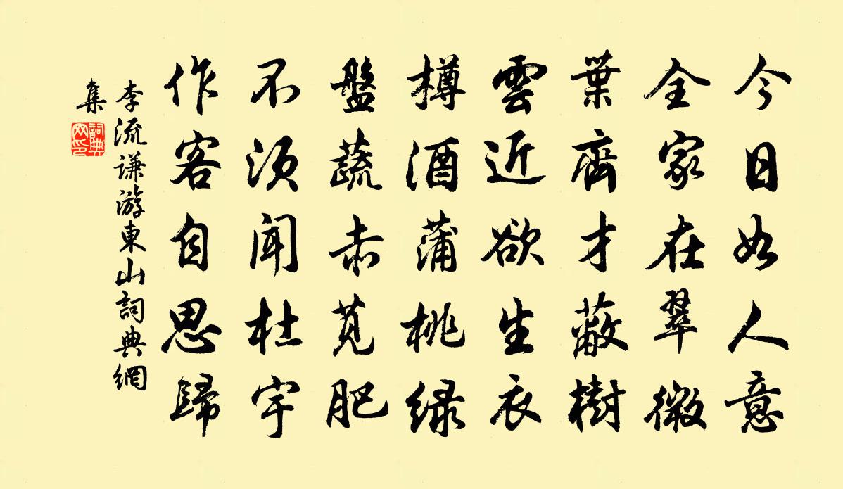 詩詞名句歷史字典書法欣賞書法字典國語詞典說文解字康熙字典古漢語字典標 題 作 者 詩 句 游東山作者:李流謙 朝代:宋代游東山原文今日如人意,全家在翠微。葉齊才蔽樹,雲近欲生衣。樽酒蒲桃綠,盤蔬赤莧肥。不須聞杜宇,作客自思歸。詩詞問答問:游東山的作者是誰?答:李流謙問:游東山寫於哪個朝代?答:宋代李流謙游東山書法欣賞游東山書法作品詩詞推薦哀通泉李僉判度正〔宋代〕豐基根也厚,枝葉固其龐。地域雲夢九,天街石筍雙。圭璋沉下國,桃李爛他邦。寂寞涪江上,聞風意已降。趣成父寄酒趙蕃〔宋代〕如聞已熟遂初泉,日日江頭數過船。梅嶺望來能止渴,麴車逢處解流涎。故人海內忘形少,風味杯中到手賢。遙想秦鏡張佐〔唐代〕樓上秦時鏡,千秋獨有名。菱花寒不落,冰質夏長清。龍在形難掩,人來膽易呈。升台宜遠照,開匣乍藏明。皎色七愛詩白太傅(居易)皮日休〔唐代〕吾愛白樂天,逸才生自然。誰謂辭翰器,乃是經綸賢。欻從浮艷詩,作得典誥篇。立身百行足,為文六藝全。清望和東玉少卿見遺陳襄〔宋代〕束芻彌月館行人,白首無殊一面新。朔漠持麾慚未達,東方連騎喜相親。卮言坐遣壺中月,物色頻驚塞下春。使者十六觀經頌中品中生釋遵式〔宋代〕若人至心一日夜,持戒持齋無破缺。以此功德回願生,七日華敷成記莂。漢陽春晚李群玉〔唐代〕漢陽抱青山,飛樓映湘渚。白雲蔽黃鶴,綠樹藏鸚鵡。憑高送春目,流恨傷千古。遐思禰衡才,令人怨黃祖。送岳州司馬弟之任李嘉祐〔唐代〕岳陽天水外,念爾一帆過。野墅人煙迥,山城雁影多。有時巫峽色,終日洞庭波。丞相今為郡,應無勞者歌。沁園春 牧王玠〔元代〕赤腳蓬頭,蓑衣*箬笠,隨處安然。守無角牛兒,不離左右。同行同住,同坐同眠。常在家山,勻調水草,拗性之春帖子詞二十首皇帝合六首歐陽修〔宋代〕陽進升君子,陰消退小人。聖君南面治,布政法新春。九月一日晨起風物悽然不勝懷遠之思作五首寄趙蕃〔宋代〕節佳重九近,風急授衣初。茱菊年齡邁,楓檉日夜疏。欲題懷遠句,頻展寄來書。憨子能思我,申兒更憶渠。小舟晚歸陸游〔宋代〕扶病尋溪友,忘憂泛釣槎。渚寒無宿鷺,月白有啼鴉。敗壁青燈暗,幽窗稚子嘩。無生未暇說,且複議桑麻。書窗強至〔宋代〕一室微吟地,開窗更欲虛。入雲驚紙破,照月愛欞疏。野色連朝夕,秋光滿屋廬。何如謝太守,遠岫獨相於。如夢令吳潛〔宋代〕江上綠楊芳草,想見故園春好。一樹海棠花,昨夜夢魂飛繞。驚曉。驚曉。窗外一聲啼鳥。梅花十詠蓓蕾張至龍〔宋代〕歷歷銜冰霜,綴作珠的皪。香色俱渾然,花中之太極。久雨宋伯仁〔宋代〕暗數春來雨,曾無兩日晴。樹連山莫辨,橋與水俱平。閉戶惟便懶,逢人且問耕。海棠花落盡,憔悴幾流鶯。苦寒得酒二首王洋〔宋代〕鯤鵬蜩鷃子知不,小大形殊各有儔。取醉盡情師李白,放言極力問莊周。出城李復〔宋代〕今日何日我心傷,出門下馬走東岡。東岡路高人跡斷,獨立矯首望八荒。長空澹澹地莽莽,停雲黯淡山淒蒼。回薄水調歌頭汪莘〔宋代〕聽說古時月,皎潔勝今時。今人但見今月,也道似琉璃。君看少年眸子,那比嬰兒神彩,投老又堪悲。明月不在盛謹和老人賦牛尾貍二首洪咨夔〔宋代〕踏白霜明夜,牽黃木葉秋。斕斑文未豹,觳觫炙先牛。奈玉開三面,蒸酥讓一頭。酒邊縴手削,醉倒老浮丘。名句推薦角聲吹徹小梅花。夜長人憶家。趙長卿《阮郎歸·客中見梅》 耐寒唯有東籬菊,金粟初開曉更清。白居易《詠菊》 千萬恨,恨極在天涯。溫庭筠《夢江南·千萬恨》 差若毫釐,謬以千里。魏收《魏書·列傳·卷六十六》 積於不涸之倉者,務五穀也管仲《管子·牧民》 四面歌殘終破楚,八年風味徒思浙。秋瑾《滿江紅·小住京華》 一事真,百事真。馮夢龍《醒世恆言·卷十六》 草木搖殺氣,星辰無光彩。李白《經亂離後天恩流夜郎憶舊遊書懷贈江夏韋太守良宰》 近水知魚性,近山識鳥音。佚名《增廣賢文·上集》 朝為越溪女,暮作吳宮妃。王維《西施詠》