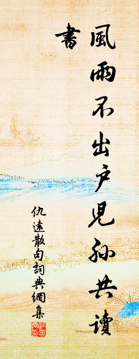 詩詞名句歷史字典書法欣賞書法字典國語詞典說文解字康熙字典古漢語字典標 題 作 者 詩 句 句作者:仇遠 朝代:宋代句原文風雨不出戶,兒孫共讀書。詩詞問答問:句的作者是誰?答:仇遠問:句寫於哪個朝代?答:宋代仇遠句書法欣賞句書法作品詩詞推薦訪友野外趙汝鐩〔宋代〕雨意方濃改作晴,杖藜野外訪柴荊。爭尋桑葉占蠶熟,退立田塍避犢行。風過沙平收鳥跡,煙濃寺沒但鐘聲。小童蝶戀花王安中〔宋代〕穠艷夭桃春信漏。弄粉飄香,楓葉飛丹後。酒入冰肌紅欲透。無言不許群芳斗。樓外何人揎翠袖。剪落金刀,插處偈頌四十一首釋普寧〔宋代〕我有一句子,不封亦不樹。不在舌頭噗,亦非思憶處。題春江漁父圖楊維楨〔元代〕一片青天白鷺前,桃花水泛住家船。呼兒去換城中酒,新得槎頭縮項鯿。臨高台三首吳沆〔宋代〕高高軒楹日照東,扶桑柱植西崑侖。上有明真紫霞客,廝征伯僑役羨門。月馭叱前驅,風駟殿後奔。靈衣披披溘晻漁人王炎〔宋代〕西南月未墮,白霧吞青山。渡口無人行,老漁一舟還。呵手系短纜。襏襫犯夜寒。捕魚養妻子,誰謂斯人閒。吳傳朋書簡帖贊岳珂〔宋代〕小書楷則本晉人,降而唐世體益真。妙趨要識筆有神,行行清妍雜奇偉。蟠梅衛宗武〔宋代〕妙製成春春未知,園工自出一家機。折旋夭矯龍蛇勢,繚繞繽紛蛾蝶圍。煙篆不生騰賸馥,月痕相倚衒清輝。西城太常引許有壬〔元代〕四堤楊柳接松筠。香破水芝新。羅襪不生塵。笑畫裡、凌波未真。紅雲飄緲,清風蕭颯,半醉岸鳥巾。不是葛天民春夜虞世南〔唐代〕春苑月裴回,竹堂侵夜開。驚鳥排林度,風花隔水來。宮詞 / 宮中詞朱慶餘〔唐代〕寂寂花時閉院門,美人相併立瓊軒。含 * 說宮中事,鸚鵡前頭不敢言。菩薩蠻(秋)劉燾〔宋代〕綠窗斜動搖風竹。竹風搖動斜窗綠。虛恍夕涼初。初涼夕恍虛。曲眉愁翠蹙。蹙翠愁眉曲。無雁寄書來。來書寄雁錢司理李季牖曾豐〔宋代〕天下萬谿山,天上萬星宿。摸索君胸中,往往無不有。中原染腥膻,歲月亦云久。匪伊丁未年,乃我舊陽九。天運依韻答吳安勖太祝梅堯臣〔宋代〕我於文字無一精,少學五言希李陵。當時巨公特推許,便將格力追西京。卞和無足定抱寶,乘驥走行天下老。玉已和文與可洋州園亭三十詠其二十七此君庵蘇轍〔宋代〕風梢繞檐匝,霜幹當窗淨。遙知素壁上,醉墨森相映。念彩雲(夜遊宮)賀鑄〔宋代〕流水蒼山帶廓。尋塵跡、宛然如昨。猶記黃花攜手約。誤重來,小庭花,空自落。不怨蘭情薄。可憐許、彩雲漂泊和孫端叟寺丞農具十五首其十二水車梅堯臣〔宋代〕既如車輪轉,又若川虹飲。能移霖雨功,自致禾苗稔。上傾成下流,損少以益甚。漢陰抱瓮人,此理未可諗。秋夕寄友人羅鄴〔唐代〕秋夕蒼茫一雁過,西風白露滿宮莎。昨來京洛逢歸客,猶說軒車未渡河。莫把少年空倚賴,須知孤立易蹉跎。想君卜運算元(集句)趙彥端〔宋代〕脈脈萬重心,相望何時見。強半春寒去卻來,野水差新燕。遠負白頭吟,坐惜紅顏變。欲問平安無使來,日落庭花梧桐樹 嗚鶴餘音卷七,以上八首,嗚鶴餘音佚名〔宋代〕五更里,朦朧定。心養浩月一輪鏡。照破貪嗔病。這回須要鬼神驚。只要真清為真靜。功滿朝上聖。名句推薦我亦飄零久!顧貞觀《金縷曲二首》 讀書法,有三到。心眼口,信皆要。李毓秀《弟子規·餘力學文》 口而誦,心而惟。朝於斯,夕於斯。王應麟《三字經·全文》 道存則國存,道亡則國亡。荀子《荀子·君道》 四海無閒田,農夫猶餓死。李紳《古風二首 / 憫農二首》 北風捲地白草折,胡天八月即飛雪。岑參《白雪歌送武判官歸京》 永豐西角荒園裡,盡日無人屬阿誰。白居易《楊柳枝二首》 朝屯雪山下,暮宿青海旁。韋元甫《木蘭歌》 巧笑東鄰女伴,採桑徑里逢迎。晏殊《破陣子·春景》 毀譽從來不可聽,是非終久自分明。馮夢龍《警世通言·卷四》
