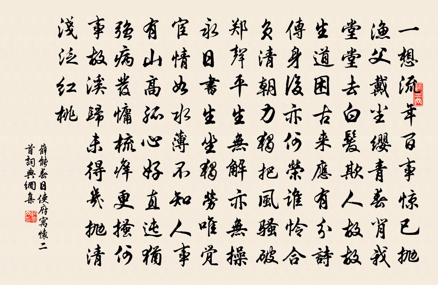 詩詞名句歷史字典書法欣賞書法字典國語詞典說文解字康熙字典古漢語字典標 題 作 者 詩 句 春日使府寓懷二首作者:薛能 朝代:唐代春日使府寓懷二首原文一想流年百事驚,已拋漁父戴塵纓。青春背我堂堂去,白髮欺人故故生。道困古來應有分,詩傳身後亦何榮。誰憐合負清朝力,獨把風騷破鄭聲。平生無解亦無操,永日書生坐獨勞。唯覺宦情如水薄,不知人事有山高。孤心好直迍猶強,病發慵梳癢更搔。何事故溪歸未得,幾拋清淺泛紅桃。詩詞問答問:春日使府寓懷二首的作者是誰?答:薛能問:春日使府寓懷二首寫於哪個朝代?答:唐代問:春日使府寓懷二首是什麼體裁?答:七律薛能春日使府寓懷二首書法欣賞春日使府寓懷二首書法作品注釋全唐詩:卷559-11詩詞推薦西省齋宿陪侍左史曹舍人話舊以除當字賦詩下程公許〔宋代〕一行奎畫寵新除,左陛濡毫要直書。何幸鵷班連省闥,誤令鼠璞雜瓊琚。雲窗樓閣非官府,璧月珠星近帝居。二十題九歌圖章甫〔宋代〕大夫放逐沅湘濱,嘗作九歌祠鬼神。鬼神幽遠不可見,餚酒芬芳猶福人。餐菊佩蘭君不識,從彼讒人為鬼蜮。楚江偈頌七十二首釋祖欽〔宋代〕層層落落影團團,切忌當陽著眼看。直下有無俱不立,白漫漫又黑漫漫。晨雨杜甫〔唐代〕小雨晨光內,初來葉上聞。霧交才灑地,風逆旋隨雲。暫起柴荊色,輕沾鳥獸群。麝香山一半,亭午未全分。再和晁說之〔宋代〕人生行樂留連耳,何用千鍾貯寶璣。主簿休官如習早,使君下榻似陳稀。已看燕寢玉如意,更聽雕梁金縷衣。莫道皇太妃閣五首蘇軾〔宋代〕孝心日奉東朝養,儉德應師大練風。太史新年瞻瑞氣,四星明潤紫宮中。臨川道中悵然有感因作遣情釋紹嵩〔宋代〕路傍官河一帶長,風帆沙鳥認微茫。人生行樂知能幾,世事多虞只自傷。破衲捲雲秋漠漠,淡煙斜日晚荒荒。不堪和蘇子瞻通判在告中聞余出郊以詩見寄陳襄〔宋代〕郊原綠意動遊人,湖上晴波見躍鱗。間逐牙旗千騎遠,暗驚梅萼萬枝新。尋僧每拂題詩壁,邀客仍將滬酒巾。寄語郊廟歌辭。周宗廟樂舞辭。觀成舞佚名〔唐代〕穆穆王國,奕奕神功。毖祀載展,明德有融。彝樽斯滿,簠簋斯豐。紛絺旄羽,鏘洋磬鐘。或升或降,克和克同。孤猿叫月王鎡〔宋代〕天色如冰萬籟沉,攀藤無伴自驚心。啼時只有空山應,影掛寒松夜正深。戲聯平字型白玉蟾〔宋代〕西風來無邊,松聲填虛空。晴雲飛瀰漫,涼蟾光玲瓏。揮觥奔長鯨,憑欄窮冥鴻。詩成摛霜毫,吹噓呈天公。鄂渚悟道歌呂岩〔唐代〕縱橫天際為閒客,時遇季秋重陽節。陰雲一布遍長空,膏澤連綿滋萬物。因雨泥滑門不出,忽聞鄰舍語丹術。試問越人歌先秦無名〔先秦〕今夕何夕兮,搴舟中流。今日何日兮,得與王子同舟。蒙羞被好兮,不訾詬恥。心幾煩而不絕兮,得知王子。山有和施德遠雙蓮韻二首袁說友〔宋代〕老向塵埃度歲華,不堪才拙負州家。天公著意成豐歲,地產無心出異葩。亂翠綃中雙暈臉,抹青山外兩凝霞。何人臘日驪山渡逢故人徐璣〔宋代〕天寒多木葉,愁思滿溪濱。惆悵往來渡,經行多少人。時情獨重臘,歲事每占春。與爾他鄉旅,誰當懷抱新。寄題佛智忠禪師實庵方回〔宋代〕實翁大笑笑虛翁,自辟新庵地幾弓。萬事我俱捐墮甑,百年公已辦幽宮。恢張遠算遺身後,跳脫 * 出夢中。智了元道宗弟兄東遊楊億〔宋代〕王謝江東推世胄,機雲洛下振才名。忽思油幕從知去,便挈縢囊冒暑行。高第自須求甲乙,嘉招未用赴弓旌。待看挽王學正葉大年〔宋代〕書劍當年游上都,賢關蟲篆校諸儒。文華燦燦九苞鳳,俊氣駸駸千里駒。妙質競誰揮堊漫,白頭空此死樵蘇。遺編客路晚春王鎡〔宋代〕年年吟帽客他鄉,柳絮飛時日漸長。遠樹雲生殘照沒,近梅風重早晨涼。桑條帶露歸蠶室,花片隨泥上燕梁。曆日經函谷關韋應物〔唐代〕洪河絕山根,單軌出其側。萬古為要樞,往來何時息。秦皇既恃險,海內被吞食。及嗣同覆顛,咽喉莫能塞。炎靈名句推薦余亦赴京國,何當獻凱還。孟浩然《送陳七赴西軍》 暗凝佇。近重陽、滿城風雨。周密《掃花游·九日懷歸》 一叫一迴腸一斷,三春三月憶三巴。李白《宣城見杜鵑花 / 子規》 鳥之將死,其鳴也哀;人之將死,其言也善。孔子弟子《論語·泰伯篇》 寂寂柴門村落里,也教插柳記年華。趙鼎《寒食》 松江上,念故人老矣,甘臥閒雲。吳文英《沁園春·送翁賓暘游鄂渚》 別日南鴻才北去,今朝北雁又南飛。魚玄機《閨怨》 英雄者,胸懷大志,腹有良謀,有包藏宇宙之機,吞吐天地之志者也。羅貫中《三國演義·第二十一回》 天山雪雲常不開,千峰萬嶺雪崔嵬。岑參《天山雪歌送蕭治歸京》 沖天香陣透長安,滿城盡帶黃金甲。黃巢《不第後賦菊》