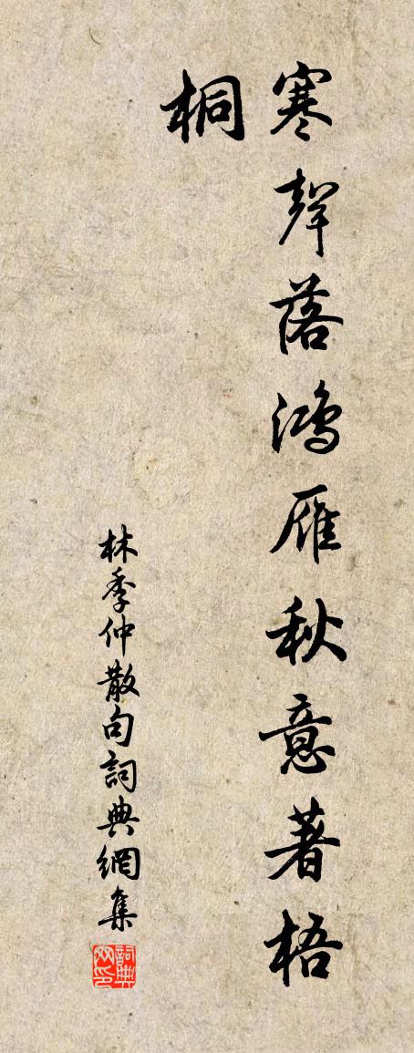 詩詞名句歷史字典書法欣賞書法字典國語詞典說文解字康熙字典古漢語字典標 題 作 者 詩 句 句作者:林季仲 朝代:宋代句原文寒聲落鴻雁,秋意著梧桐。詩詞問答問:句的作者是誰?答:林季仲問:句寫於哪個朝代?答:宋代林季仲句書法欣賞句書法作品詩詞推薦宿直宋祁〔宋代〕三重仙閣道家山,寓直由來恧素餐。漏近章溝先報暝,樹連溫省未知寒。蘭釭靜對朱花結,芒帙閒披白蠹乾。前膝已亥雜詩 71龔自珍〔清代〕剔彼高山大川字,薄我玉篋金扃中。從此九州不光怪,羽陵夜色春熊熊。次韻韓子師游三洞過赤松韓元吉〔宋代〕山城一雨足,水滿高下塘。好風從西來,蕭然終夕涼。孌彼池間蓮,當軒洗紅妝。官事無時休,涉筆雁鶩行。豈知題洪道士山院秦系〔唐代〕霞外主人門不扃,數株桃樹藥囊青。閒行池畔隨孤鶴,若問多應道姓丁。見野草中有曰白頭翁者李白〔唐代〕醉入田家去,行歌荒野中。如何青草里,亦有白頭翁。折取對明鏡,宛將衰鬢同。微芳似相誚,留恨向東風。虎跡韋莊〔唐代〕白額頻頻夜到門,水邊蹤跡漸成群。我今避世棲岩穴,岩穴如何又見君。次韻謝平心胡祠監見惠生日五首方回〔宋代〕風追電逐角材賢,我獨從公息擔肩。野曠杖藜臨絕景,山寒采梠度層巔。淡湯煮飯身無病,小秤收租歲有年。臭橐鳳棲梧/蝶戀花佚名〔宋代〕姑射仙人游汗漫。白鳳翩翩,銀海光凌亂。龜手兒童貪戲玩。風檐更折梅梢看。漠漠銀沙平晚岸。笑擁寒蓑,聊作柳李商隱〔唐代〕柳映江潭底有情,望中頻遣客心驚。巴雷隱隱千山外,更作章台走馬聲。臨潁縣李廌〔宋代〕日永行人漸困,路長飢馬頻嘶。驚起一雙白鷺,背人飛向前溪。奉題胡宗偉推官攬秀堂范成大〔宋代〕城外屏峰雲百疊,城裡看雲笏拄頰。山靈自與人爭秀,明滅煙霏難應接。南鄰范叔骨相寒,不如騎曹知愛山。晨霞自王園歸約諸友山行衛宗武〔宋代〕天不憐我老且貧,荒逕不可酬華春。遂令東里互邀致,借之雙圃娛芳辰。痴雲釀雨雨旋止,霽日含輝更清美。花間仲秉再用前韻為梅解嘲復和之張栻〔宋代〕東君豈是結新知,誰共群芳較疾遲。不但一花高一世,更看嘉實滿青枝。和友人秋日韻二首袁說友〔宋代〕樓外西山日腳低,萸觴新唱縷金衣。十年為客秋風裡,空負黃花幾賦歸。三月三日上忠襄墳,因之行散,得十絕句楊萬里〔宋代〕除卻鍾山與石城,六朝遺蹟問難真。里名只道新名好,不道新名誤後人。偈頌二十五首釋普岩〔宋代〕此香堪笑又堪悲,剛把愁腸說向誰。冶父山前曾落節,午鈞之重一毫釐。晚夏郡中臥疾羊士諤〔唐代〕事外心如寄,虛齋臥更幽。微風生白羽,畏日隔青油。用拙懷歸去,沉痾畏借留。東山自有計,蓬鬢莫先秋。迎春樂方千里〔宋代〕參差鳳鐸鳴高屋。漸驚覺、清眠熟。看夕陽倒影花陰速。雙燕子、歸來宿。幾曲危腸愁易束。問雪鬢、何時重綠。征人楊衡〔唐代〕西風屢鳴雁,東郊未升日。繁煙幕幕昏,暗騎蕭蕭出。望雲愁玉塞,眠月想蕙質。借問露沾衣,何如香滿室。懷友陳柏〔宋代〕攜書入空山,幾若幾世絕。俯仰一室間,頗見古人別。良朋令人思,思君意彌切。食芹差自甘,那得共君啜。名句推薦不積跬步,無以致千里;不積小流,無以成江海。李昉、李穆、徐鉉《太平御覽·學部·卷一》 宦情羈思共淒淒,春半如秋意轉迷柳宗元《柳州二月榕葉落盡偶題》 善游者溺,善騎者墮,各以所好反自為禍。文子《文子·卷四·符言》 舉賢任能,不時日而事利。尉繚《尉繚子·戰威》 燕塞雪,片片大如拳。華清淑《望江南·燕塞雪》 欲持一瓢酒,遠慰風雨夕。韋應物《寄全椒山中道士》 深院鎖黃昏,陣陣芭蕉雨。歐陽修《生查子·含羞整翠鬟》 捫蘿正意我,折桂方思君。范雲《送沈記室夜別》 在天願作比翼鳥,在地願為連理枝。白居易《長恨歌》 晴雲輕漾,薰風無浪,開樽避暑爭相向。薛昂夫《西湖雜詠·夏》