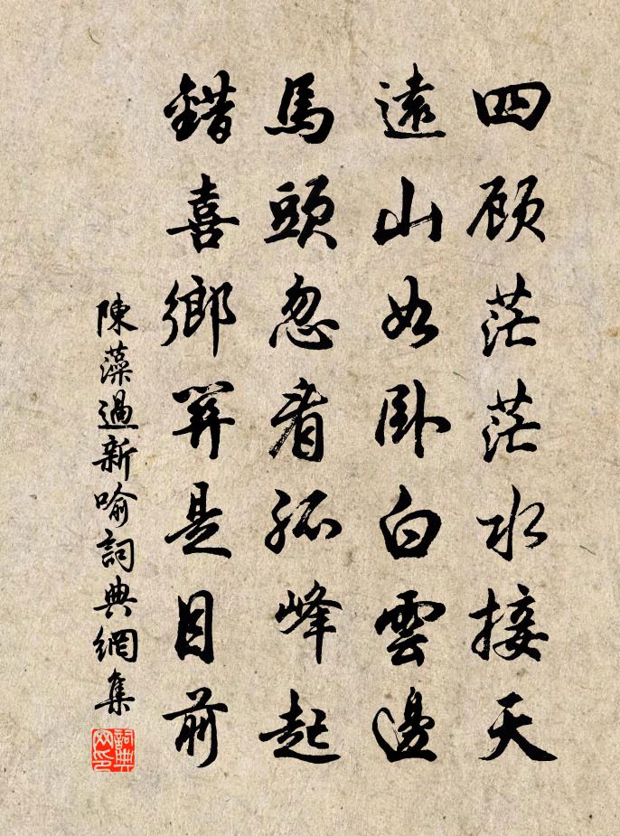 詩詞名句歷史字典書法欣賞書法字典國語詞典說文解字康熙字典古漢語字典標 題 作 者 詩 句 過新喻作者:陳藻 朝代:宋代過新喻原文四顧茫茫水接天,遠山如臥白雲邊。馬頭忽看孤峰起,錯喜鄉關是目前。詩詞問答問:過新喻的作者是誰?答:陳藻問:過新喻寫於哪個朝代?答:宋代陳藻過新喻書法欣賞過新喻書法作品詩詞推薦鷓鴣天晁公武〔宋代〕笑擘黃柑酒半醒。玉壺金斗夜生冰。開窗盡見千山雪,雪未消時月正明。蘭燼短,麝煤輕。畫樓鐘鼓已三更。倚欄立夏日南風大作二首項安世〔宋代〕堤邊樹子最無情,恰則春歸第一程。舞向南風渾不住,葉間羞損舊啼鶯。醉歸陸游〔宋代〕夜分飲散酒家壚,歸路迢迢月滿湖。小豎竊言翁未醉,入門猶記露菖蒲。蝶戀花莊棫〔清代〕城上斜陽依碧樹。門外斑騅,見了還相顧。玉勒珠鞭何處住?回頭不覺天將暮。 風裡餘花都散去。不省分開,何謝李兼善書庫寄近作袁說友〔宋代〕筆下陳無己,香分一瓣奇。有孫今見嫡,得髓政忘皮。懷舊書來日,驚人語妙時。猶思頻咀嚼,咽子百篇詩。次韻開府太師留別諸公蘇頌〔宋代〕經濟才謨沛有餘,幡然高謝意何如。 * 盡尋歸鞅,綠野堂成憶舊廬。漢苑宴遊聯魏丙,鄴都賓客記應徐。他時應龍吟邵雍〔宋代〕龍者陽類,與時相須。首出庶物,同游六虛。能潛能見,能吸能呼。能大能小,能有能無。明自己頌釋本先〔宋代〕曠大劫來只如是,如是同天亦同地。同地同天作么形,作么形兮無不是。題姑蘇邵氏園居梅堯臣〔宋代〕積水夫差國,閒居魯叟心。石科雲起潤,城角竹連陰。燕入池塘晚,花開島嶼深。應當效疏傅,不惜橐中金。宮詞一百首岳珂〔宋代〕雒壇爟火夜升煙,鹵簿如雲繡色鮮。萬姓歡呼感泣,此生重遇太平年。過太平州拜李端叔遺像折彥質〔宋代〕東來已數月,弛擔已渺茫。猶喜災患身,獲登先生堂。肅衣拜遺像,依然雙頰光。宛若侍坐側,妙語發天藏。厄窮放龜池楊維楨〔元代〕我聞玄緒靈,無逃豫且厄。毛公贖金錢,放汝黿鼉宅。何期報復義,背負將軍溺。至今山中池,洞玄露純白。我歸浣溪沙(題美人畫卷)韓淲〔宋代〕一曲霓裳舞未終。玉釵垂額鬢雲松。夢回金殿月華東。燕子鶯兒情脈脈,柳枝桃葉恨匆匆。羅襟空惹御香濃。次韻寄興祖廣德洪皓〔宋代〕南歸不獲卻東遷,險阻艱難遍大千。母老三年難見止,途窮一慟忽潸然。愁同暴虎馮可悔,災甚求魚用木緣。行府補史十忠詩淮東制置使知楊州李公庭芝劉壎〔宋代〕淮海接風塵,胡乃似鐵壁。臥護有天人,十載藉福力。重來人未老,愁絕事如昔。苦戰孤城危,痛哭天柱拆。夢遊翫庭柳詩沈約〔南北朝〕輕陰拂建章。夾道連未央。因風結復解。沾露柔且長。楚妃思欲絕。班女淚成行。遊人未應去。為此還故鄉。秋居幽興王禹偁〔宋代〕謫居人事慵,幽興與誰同。僧到烹秋菌,兒啼索草蟲。掃苔留嫩綠,寫葉惜殘紅。歲晏琴罇好,籬邊有菊叢。時樂鳥篇張說〔唐代〕舊傳南海出靈禽,時樂名聞不可尋。形貌乍同鸚鵡類,精神別稟鳳凰心。千年待聖方輕舉,萬里呈才無伴侶。紅茸和汴州令狐相公新於郡內栽竹百竿拆壁開軒…七言五韻白居易〔唐代〕梁園修竹舊傳名,園廢年深竹不生。千畝荒涼尋未得,百竿青翠種新成。牆開乍見重添興,窗靜時聞別有情。菸葉詠史下高歡陳普〔宋代〕段韶谷剎千金鑄,彭樂丁公七寶裝。虎子得來成底事,何如抱犢臥雲崗。名句推薦惡無定議,莫以惡為惡者顯;善無定評,勿以善為善者安。來俊臣《羅織經·保身卷第七》 飛流直下三千尺,疑是銀河落九天。李白《望廬山瀑布》 蓄恩不倦,以一取萬。黃石公《三略·上略》 雲淡風高葉亂飛,小庭寒雨綠苔微,深閨人靜掩屏帷。顧敻《浣溪沙·雲淡風高葉亂飛》 為君憔悴盡,百花時。溫庭筠《南歌子·倭墮低梳髻》 文章已滿行人耳,一度思卿一愴然。李忱《吊白居易》 金玉其外,敗絮其中劉基《賣柑者言》 入我相思門,知我相思苦,李白《三五七言 / 秋風詞》 殘日東風,不放歲華去。吳文英《祝英台近·除夜立春》 寬柔以教,不報無道,南方之強也。君子居之。子思《中庸·第十章》