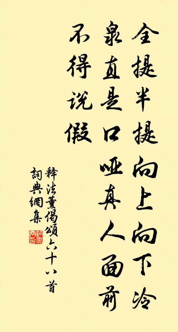 詩詞名句歷史字典書法欣賞書法字典國語詞典說文解字康熙字典古漢語字典標 題 作 者 詩 句 偈頌六十八首作者:釋法薰 朝代:宋代偈頌六十八首原文全提半提,向上向下,冷泉直是口啞。真人面前,不得說假。詩詞問答問:偈頌六十八首的作者是誰?答:釋法薰問:偈頌六十八首寫於哪個朝代?答:宋代釋法薰偈頌六十八首書法欣賞偈頌六十八首書法作品詩詞推薦贈盧沙彌小師姚合〔唐代〕怕見世間事,削頭披佛衣。年小未受戒,會解如老師。天與出家腸,一食齋不飢。麻履踏雪路,與馬不肯騎。嫌我明發陳公徑過摩舍那灘石峰下十首楊萬里〔宋代〕山轉江亦轉,江行山亦行。風鬟照玉鏡,素練縈青屏。我本山水客,澹無軒冕情。塵中悔一來,事外懷孤征。忽乘湘中送人余靖〔宋代〕離謳方揭耳,別緒已悽然。草蔚湘纍浦,花殘蜀魄天。嶷山晴拂漢,啼竹冷澄煙。後夜思君意,空歌皓月篇。句李鼎〔宋代〕南流底處所,絳帳居尊嚴。錢塘渡口施肩吾〔唐代〕天塹茫茫連沃焦,秦皇何事不安橋。錢塘渡口無錢納,已失西興兩信潮。別崔潩因寄薛據、孟雲卿(內弟潩赴湖南幕職)杜甫〔唐代〕志士惜妄動,知深難固辭。如何久磨礪,但取不磷緇。夙夜聽憂主,飛騰急濟時。荊州過薛孟,為報欲論詩。和陳子公井齋韻蔡沈〔宋代〕生來井井義誰窮,陽自初來位五中。若信此間方寸地,能安而慮即成功。寓興十首張至龍〔宋代〕庭前無繁植,疎竹附梅坡。雖然無巨蔭,明月飛來多。枕上陸游〔宋代〕冥冥梅雨暗江天,汗浹衣裳失夜眠。商略明朝當少霽,南檐風佩已鏘然。頌古五十三首釋文禮〔宋代〕因我得禮你,事從叮囑起。誰知白苹風,不在秋江里。書感陸游〔宋代〕奪璧元知價不讎,屠龍誰信本無求。喔詩聲里歲時速,憂國淚邊天地秋。已欠謝安俱泛海,況無王粲與登樓。此身食粥歌朱申〔宋代〕龍平江水清洋洋,尉山高兮秋葉黃。釣翁落落兮棲山房,偕室人兮甘糟糠。丈夫壯圖兮在四方,道豈終窮兮業不彰卓牌子近袁去華〔宋代〕曲沼朱闌,繚牆翠竹晴晝。金萬縷、搖搖風柳。還是燕子歸時,花信來後。看淡淨洗妝態,梅樣瘦。春初透。盡日九日李群玉〔唐代〕年年羞見菊花開,十度悲秋上楚台。半嶺殘陽銜樹落,一行斜雁向人來。行雲永絕襄王夢,野水偏傷宋玉懷。絲管鹿端山楊蟠〔宋代〕千年白鹿地,今有佛樓台。昨日到山下,銜花猶出來。橘二首趙與□〔宋代〕野色煙波外,西風橘柚香。湖光杳無際,山色忽深藏。塔古燈猶照,壇余灶已荒。何當蛻塵鞅,從此訪漁郎。句釋惠崇〔宋代〕梵容分古像,唐語入新經。出城途中小憩楊萬里〔宋代〕未到江城已日斜,山煙白處是人家。秋風畢竟無多巧,只把燕支滴蓼花。鵲橋仙趙善括〔宋代〕東風喚我,西園閒坐,大醉高歌竟日。行 * 依畫欄乾,便忘了、征衫淚濕。亭高煙遠,天低雲近,相對逃名隱客海棠一夜為風吹盡三首姚勉〔宋代〕海棠自是百花仙,霞袂霓裳下九天。昨夜詔歸紅玉闕,但留翠幄鎖晴煙。名句推薦雲來山更佳,雲去山如畫。張養浩《雁兒落兼得勝令》 因其材以取之,審其能以任之,用其所長,掩其所短吳兢《貞觀政要·卷三·論擇官》 暗塵隨馬去,明月逐人來。蘇味道《正月十五夜》 東風兮東風,為我吹行雲使西來。李白《久別離》 明朝游上苑,火速報春知。武則天《臘日宣詔幸上苑 / 催花詩》 盛而不驕,勞而不矜其功。左丘明《國語·越語·范蠡進諫勾踐持盈定傾節事》 有過則改之,未萌則戒之馮夢龍《警世通言·卷三十八》 自昔佳人多薄命,對古來、一片傷心月。辛棄疾《賀新郎·用前韻送杜叔高》 舞殿冷袖,風雨淒淒。杜牧《阿房宮賦》 千里馬常有,而伯樂不常有。韓愈《馬說》
