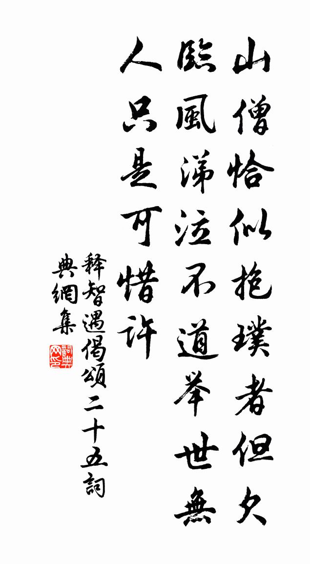 詩詞名句歷史字典書法欣賞書法字典國語詞典說文解字康熙字典古漢語字典標 題 作 者 詩 句 偈頌二十五作者:釋智遇 朝代:宋代偈頌二十五原文山僧恰似抱璞者,但欠臨風涕泣。不道舉世無人,只是可惜許。詩詞問答問:偈頌二十五的作者是誰?答:釋智遇問:偈頌二十五寫於哪個朝代?答:宋代釋智遇偈頌二十五書法欣賞偈頌二十五書法作品詩詞推薦後宮詞白居易〔唐代〕淚濕羅巾夢不成,夜深前殿按歌聲。 紅顏未老恩先斷,斜倚薰籠坐到明。夔州元宵和曾端伯韻四首郭印〔宋代〕綺陌家家不下簾,花光世界總成蓮。村歌社舞歡乎處,都道今年勝去年。台灣竹枝詞梁啓超〔清代〕郎搥大鼓妾打鑼,稽首天西媽祖婆。今生夠受相思苦,乞取他生無折磨。柳梢青(惜花)郭應祥〔宋代〕春事匆匆。花慵柳困,雨橫風狂。寄語詩人,須燒銀燭,與照紅妝。休言桃李河陽。但過眼、難尋色香。只有今宵寒食清明十首劉克莊〔宋代〕原沉向九泉,推死已千年。有水皆爭渡,無村不禁菸。論語絕句一百首張九成〔宋代〕體不勤勞谷不分,毅然植杖俯而耘。從前一向空擔板,大道元來亦未聞。依韻和并州鄭宣徽見寄二首范仲淹〔宋代〕西湖載客恣游從,湖上參差半佛宮。回顧隙駒曾不息,沉思樽酒可教空。層台累榭皆清曠,萬戶千門盡郁蔥。向此次韻王統制喜雨陳造〔宋代〕公餘競病揮詩筆,誰似風流老伏波。對雨肯來同把酒,當令阿素為君歌。次韻趙雲中飲呈孟君復二首方回〔宋代〕舊業田荒百頃萊,眉頭長與醉懷開。春愁忍共金釵訣,夜禁偏嫌玉漏催。聚散有情都是夢,古今無物不成灰。何時行役有嘆二首楊萬里〔宋代〕百年幾暄涼,再歲三征行。卻羨路旁叟,白首不到城。人生如風花,去來能與爭。且隨風吹起,會當風自停。句蘇籍〔宋代〕夢蝶豈知真是蝶,騎牛何必更尋牛。卜運算元郭應祥〔宋代〕綠燭間紅花,絕艷交相照。不分花時雨又風,折取供吟笑。擬把插烏巾,卻恨非年少。點筆舒箋領略渠,座客詞俱端午胡仲弓〔宋代〕畫舸縱橫湖水濱,彩絲角黍鬥時新。年年此日人皆醉,能吊醒魂有幾人。寄新安梁殿丞趙湘〔唐代〕郡孤詩句許秋供,見說多閒卻似慵。移樹好禽來獨院,上樓高雪在諸峰。泉當月際搖吟影,蘚自雲邊得屣蹤。此興水調歌頭張嗣初〔宋代〕名節本來重,軒冕亦何輕。人間兒戲,剛自指點客星明。黃屋龍旗九仞,蒼石漁絲千尺,誰辱又誰榮。會得儻來意年家生張主薄經過相尋率爾贈別徐璣〔宋代〕上世喜同登,論交建水清。故人逢客裹,明日又離情。佳闋東南少,卑官遠近行。秋風分手地,霜葉滿江城。洞戶二十二韻溫庭筠〔唐代〕洞戶連珠網,方疏隱碧潯。燭盤煙墜燼,簾壓月通陰。粉白仙郎署,霜清玉女砧。醉鄉高窈窈,棋陣靜愔愔。素手次韻李袁州絕句七首趙蕃〔宋代〕傳聞起柂只數日,引領白雲猶在天。試問今誰滿台閣,顧令是老落林泉。好事近(湯詞)黃庭堅〔宋代〕歌罷酒闌時,瀟灑座中風色。主禮到君須盡,奈賓朋南北。暫時分散總尋常,難堪久離拆。不似建溪春草,解留連癸丑正月二日陸游〔宋代〕菊叢抽綠滿枯荄,繞舍梅花已遍開。須信今春春事早,江鄉開歲有奔雷。名句推薦凡兵戰之場,立屍之地,必死則生,幸生則死。吳起《吳子·治兵》 寄言儔侶,莫負廣寒沈醉。文徵明《念奴嬌·中秋對月》 參差煙樹灞陵橋,風物盡前朝柳永《少年游·參差煙樹灞陵橋》 漁父天寒網罟凍,莫徭射雁鳴桑弓。杜甫《歲晏行》 北斗酌美酒,勸龍各一觴。李白《短歌行》 禪心朗照千江月,真性情涵萬里天。吳承恩《西遊記·第八回》 河橋送人處,涼夜何其。周邦彥《夜飛鵲·河橋送人處》 高齋今夜雨,獨臥武昌城。徐禎卿《在武昌作》 心者修裔之根,未有根不植而枝葉榮茂者。洪應明《菜根譚·概論》 交朋友增體面,不如交朋友益身心王永彬《圍爐夜話·第四五則》