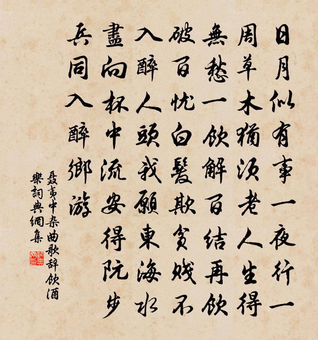 詩詞名句歷史字典書法欣賞書法字典國語詞典說文解字康熙字典古漢語字典標 題 作 者 詩 句 雜曲歌辭。飲酒樂作者:聶夷中 朝代:唐代雜曲歌辭。飲酒樂原文日月似有事,一夜行一周。草木猶須老,人生得無愁。一飲解百結,再飲破百憂。白髮欺貧賤,不入醉人頭。我願東海水,盡向杯中流。安得阮步兵,同入醉鄉游。詩詞問答問:雜曲歌辭。飲酒樂的作者是誰?答:聶夷中問:雜曲歌辭。飲酒樂寫於哪個朝代?答:唐代問:雜曲歌辭。飲酒樂是什麼體裁?答:樂府聶夷中雜曲歌辭。飲酒樂書法欣賞雜曲歌辭。飲酒樂書法作品注釋全唐詩:卷26_52詩詞推薦郊廟歌辭。武后崇先廟樂章(載《本集》)武則天〔唐代〕先德謙撝冠昔,嚴規節素超今。奉國忠誠每竭,承家至孝純深。追崇懼乖尊意,顯號恐玷徽音。既迫王公屢請,方次韻林初心先輩吳則禮〔宋代〕倦客無人問,逢人只自嗟。孤舟在江漢,老夢繞京華。聽雨閒扉掩,看雲短幘斜。固窮吾已定,莫向五侯家。水龍吟(鶯詞)趙長卿〔宋代〕天教占得如簧,巧聲乍囀千嬌媚。金衣襯著,風流模樣,於中可是。紅杏香中,綠楊陰處,多應饒你。向黃昏、苦送孫仲舉徽猷罷郡造朝謝伋〔宋代〕四月維夏天未暑,天台居民逃室處。城中屢貴巷陌喧,城外號奴去村墅。老癃扶杖少者趨,夫棄禾麻婦投杼。肩隨挽平山菊澗陳普〔宋代〕卑卑梯接俗,望重若蒿蓬。作俑系何代,彌天以送終。鬧居常憤切,易簧愈昭融。一二人家化,駸駸似洛中。寄憐陳師道〔宋代〕借子翩翩困下駒,春原隨處小踟躕。可能炙背春風裡,臥把青銅摘頷須。詠史下謝安陳普〔宋代〕軍中如意揮諸將,依約東山嘯詠兄。不遣君王湛酒色,市朝猶足肆王甥。禪人寫真求贊釋正覺〔宋代〕家風貧自慚,面孔惡人嫌。點漆之眼有角,截筒之鼻無尖。顛毛寒覆雪,項癭暗消鹽。說妙談玄兮遲鈍口觜,呵佛早上過溪報謁林子長承約客回途作虞儔〔宋代〕畫諾何如瑨,歌呼敢效曹。一飢才免死,千慮亦忘勞。酒里愁先醉,吟邊句未豪。北窗陶靖節,千載只渠高。紹興以後祀感生帝十六首佚名〔宋代〕術牙鏘鳴,肅容聲精。交神之閏,罔敢弗誠。設洗於阼,疊水惟清。興以致潔,感通神明。新春即事二首胡寅〔宋代〕竹爆臘寒盡,桃符春事來。和風已披拂,暖日便徘徊。曳杖閒挑菜,攀枝齼摘梅。太牢雖有味,豈必勝登台。五馬渡曾極〔宋代〕仲達欺孤與操同,豈能長世撫提封。瑤圖章間換君知否,班特浮江自化龍。望海潮沈唐〔宋代〕山光凝翠,川容如畫,名都自古并州。簫鼓沸天,弓刀似水,連營十萬貔貅。金騎走長楸。少年人一一,錦帶吳鉤武夷山黃遹〔宋代〕閒將綠綺弄清音,招得青山作故人。煙靄謾呈千樣巧,松篁長貢四時新。孟浩然歸南山圖葉茵〔宋代〕笑指南山躍馬歸,明知舉似棄才詩。亭前千古標芳姓,未可窮通論一時。淳熙二的春帖子詞光堯壽聖憲天體道太上皇崔敦詩〔宋代〕景龍門上華燈動,黃鵠池邊翠浪通。一一春光須作主,從今二十四番風。風雨中望峽口諸山奇甚戲作短歌陸游〔宋代〕白鹽赤甲鹽天下雄,鹽拔地突兀鹽摩蒼穹,鹽凜然猛士撫長劍,空有豪健無雍容,不令氣象少渟滀,常恨天地無全別宇文丈陽枋〔宋代〕滿耳聲稱驀浣沙,萍根雲葉際天涯。襟扃噴撲芝蘭氣,韻味清修詩禮家。勝把香編消歲月,點無浮葉靚春華。西歸解職婦題主簿軒壁陳淳〔宋代〕偶然寓興五山陰,可嘆頹波日轉深。鼓瑟齊門莫同調,舞韶鄭側鮮知音。歸尋舊徑掃新榻,從整遺編理素琴。惟有以詩送宣賜進奉紅綃封龍字茶與璉禪師丁謂〔宋代〕密緘龍焙火前春,翠字紅綃熨眼新。品味至高誰合得,雙林樹下上乘人。名句推薦慘慘柴門風雪夜,此時有子不如無。黃景仁《別老母》 曉看天色暮看雲,行也思君,坐也思君。唐寅《一剪梅·雨打梨花深閉門》 為人不做虧心事,半夜敲門心不驚。佚名《增廣賢文·上集》 送君不相見,日暮獨愁緒。孟浩然《送辛大之鄂渚不及》 雨余溪水掠堤平,閒看村童謝晚晴。陸游《觀村童戲溪上》 梅似雪,柳如絲。試聽別語慰相思。辛棄疾《鷓鴣天·送歐陽國瑞入吳中》 不可以一時之得意,而自誇其能;亦不可以一時之失意,而自墜其志。馮夢龍《警世通言·卷十七》 恭敬不如從命。曹雪芹《紅樓夢·第六十二回》 無限枝頭好顏色,可憐開不為重陽。丘浚《詠菊》 共眠一舸聽秋雨,小簟輕衾各自寒。朱彝尊《桂殿秋·思往事》