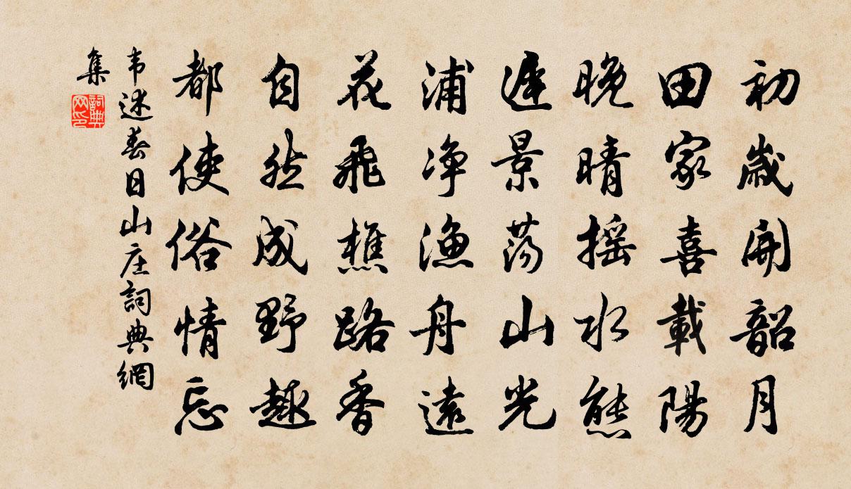 詩詞名句歷史字典書法欣賞書法字典國語詞典說文解字康熙字典古漢語字典標 題 作 者 詩 句 春日山莊作者:韋述 朝代:唐代春日山莊原文初歲開韶月,田家喜載陽。晚晴搖水態,遲景盪山光。浦淨漁舟遠,花飛樵路香。自然成野趣,都使俗情忘。詩詞問答問:春日山莊的作者是誰?答:韋述問:春日山莊寫於哪個朝代?答:唐代問:春日山莊是什麼體裁?答:五律韋述春日山莊書法欣賞春日山莊書法作品注釋全唐詩:卷108_15詩詞推薦國香高荷〔宋代〕南溪太史還朝晚,息駕江陵頗從款。彩毫曾詠水仙花,可惜國香天不管。將花托意為羅敷,十七未有十五餘。宋玉又那霸泉陶弼〔宋代〕路下洋河水石閒,三分才過二分山。年光欲盡家猶遠,嵐氣雖疏鬢已斑。賓從談知機獨進,兒曹音信喜生還。南風解蹀躞陳允平〔宋代〕岸柳飄殘黃葉,尚學纖腰舞。謝他終日,亭前伴羈旅。無奈歷歷寒蟬,為誰喚老西風,伴人吟苦。悶無緒。記得芙玉照堂觀梅二十首張鎡〔宋代〕群芳非是乏新寄,或在繁時或嫩時。唯有南枝香共色,從初到底絕瑕疵。金陵懷古柴隨亨〔宋代〕夢覺鐘山夜半鍾,自憐寒月照山翁。曲從玉樹歌聲斷。數逐金陵王氣終。故老更思王化北,南人惟唱大江東。憑闌宿開照寺光澤上人院張蠙〔唐代〕靜室譚玄旨,清宵獨細聽。真身非有像,至理本無經。鍾定遙聞水,樓高別見星。不教人觸穢,偏說此山靈。讀蘇子瞻韓乾馬圖詩張耒〔宋代〕我雖不見韓乾馬,一讀公詩如見者。韓生畫馬常苦肥,肉中藏骨以為奇。開元有臣善司牧,四十萬匹屯山谷。養之和翁子秀夜過溪橋韻李處權〔宋代〕千里無雲湛九霄,月明花露滴春橋。何時心緒如楊柳,笑倚春風萬丈條。炙背釋文珦〔宋代〕老身不能寒,心唯愛冬日。炙背蓬門下,暖氣浹肌骨。自謂人間世,世樂居第一。雖曰狐貉溫,功莫與之匹。山居懶性釋文珦〔宋代〕懶性難趨世,深本自養蒙。得閒真可樂,未死已知空。陰壑長留雪,喬林易有風。見聞今又絕,眼暗耳全聾。山齋觀物舒岳祥〔宋代〕自古詩人皆格物,山齋觀物意如何。額塗金粉蜂歸穴,腹吐銀絲蟢布羅。雞母載雛行啄黍,雀群欺燕坐爭窠。紛紛送謝著和之濠梁徐鉉〔唐代〕謝客乘軺去,清和景物初。淮流宜映月,濠上好觀魚。吏事應微撓,吟情自有餘。偏州莫留滯,東觀待繙書。慰嚴溪張君貢士何夢桂〔宋代〕朝日景曈曈,湛露溘已晞。日暮風淒淒,啼鳥失其雛。時邁感物化,撫事成傷悲。嚴溪子張子,有兒讀父書。年少同餘汝霖游西湖觀天竺觀音永懷林和靖三絕胡寅〔宋代〕劫火不燒大士,寒泉誰薦先生。跋馬與君弔古,西風落日淒清。月夜與兄公度納涼閒行至御橋梅堯臣〔宋代〕夕月吐澄明,陰雲淨如掃。空庭引天翠,爽氣生懷抱。家近御橋頭,因為橋畔游。倚欄波上影,不共水東流。思歸和鞏宰送牡丹三首姜特立〔宋代〕品格高低各自春,大如玉斗滿如輪。前賢曾譜花王說,唯有姚黃始是真。羊角埂晚行宋伯仁〔宋代〕葛裙蒲履帽烏紗,迤邐乘涼到水崖。數寺晚鐘聲未歇,滿身明月看荷花。己卯十月一日至燕越五日罹狴犴有感而賦文天祥〔宋代〕兩月縹囚里,一年憂患餘。疏因隨事直,忠故有時愚。道在身何拙,心安體自舒。近來都勘破,人世只蘧廬。接泥渡頭再遇雪董嗣杲〔宋代〕幾涉沙汀與水村,幾看雲物幻乾坤。渡頭沖雪喔詩老,船尾乘風破酒昏。未晚櫓聲先傍岸,乍晴江色遠侵門。白鷗頌古二十九首釋師體〔宋代〕投子下繩床,張非孟八郎。不搖三寸舌,未免鬼分贓。眼底欲條直,臨機爭探囊。裂破古今無面目,縱橫何處有關名句推薦奸巧語,穢污詞。市井氣,切戒之。李毓秀《弟子規·信》 鳳凋碧柳愁眉淡,露染黃花笑靨深。晏幾道《鷓鴣天·九日悲秋不到心》 一家之計在於和,一生之計在於勤。佚名《增廣賢文·上集》 虎踞龍蟠何處是,只有興亡滿目。辛棄疾《念奴嬌·登建康賞心亭呈史致道留守》 仲夏苦夜短,開軒納微涼。杜甫《夏夜嘆》 而浮生若夢,為歡幾何?李白《春夜宴桃李園序 / 春夜宴從弟桃花園序》 出於其類,拔乎其萃。孟子《孟子·公孫丑章句上·第二節》 枝上流鶯和淚聞,新啼痕間舊啼痕。秦觀《鷓鴣天·枝上流鶯和淚聞》 遊人日暮相將去,醒醉喧譁。歐陽修《採桑子·清明上巳西湖好》 飛鳥沒何處,青山空向人。劉長卿《餞別王十一南遊》