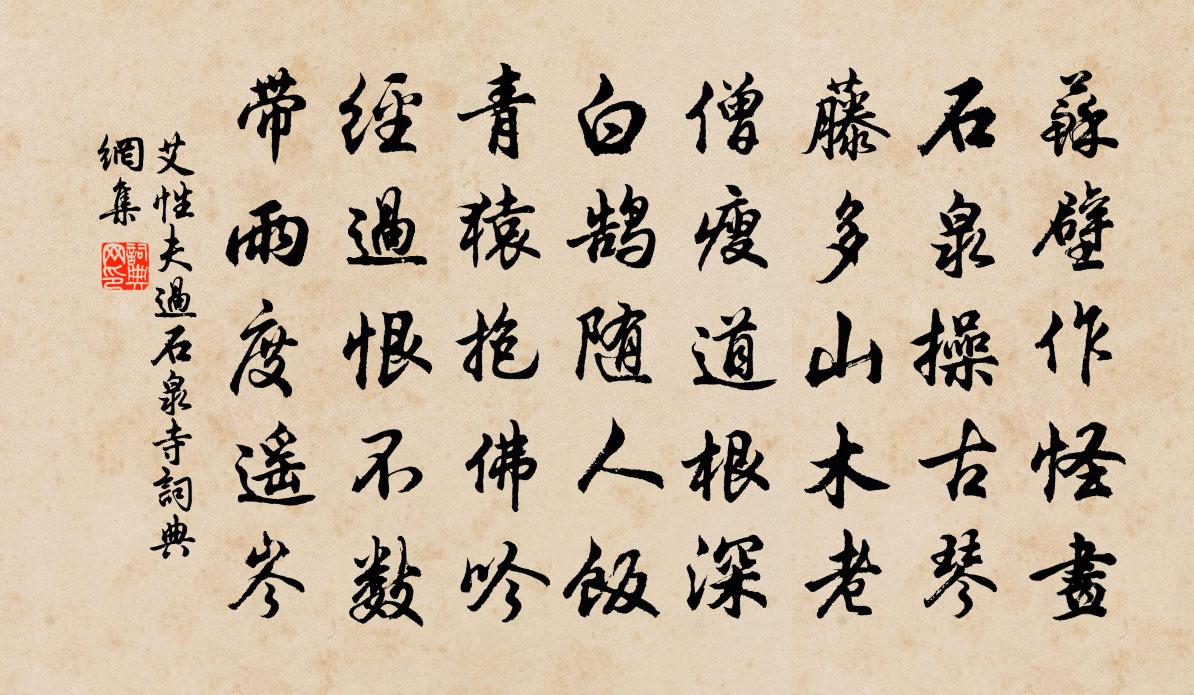 詩詞名句歷史字典書法欣賞書法字典國語詞典說文解字康熙字典古漢語字典標 題 作 者 詩 句 過石泉寺作者:艾性夫 朝代:宋代過石泉寺原文蘇壁作怪畫,石泉操古琴。藤多山木老,僧瘦道根深。白鵠隨人飯,青猿抱佛吟。經過恨不數,帶雨度遙岑。詩詞問答問:過石泉寺的作者是誰?答:艾性夫問:過石泉寺寫於哪個朝代?答:宋代問:過石泉寺是什麼體裁?答:五律艾性夫過石泉寺書法欣賞過石泉寺書法作品詩詞推薦嘲韋鏗邵景〔唐代〕飄風忽起團團旋,倒地還如著腳飠追。莫怪殿上空行事,卻為元非五品才。念奴嬌(長沙趙師席上作)劉仙倫〔宋代〕西風何事,為行人掃蕩,煩襟如洗。垂漲蒸瀾都卷盡,一片瀟湘清泚。酒病驚秋,詩愁入鬢,對景人千里。楚宮故漁家傲佚名〔宋代〕橘綠橙黃霜落候。小春天氣宜晴書。一片祥光橫宇宙。仙樂奏。千官共祝南山壽。湛露恩波濃似酒。□堂宴罷嵩呼走筆謝呂行甫惠子魚蘇軾〔宋代〕臥沙細肋吾方厭,通印長魚誰肯分。好事東平貴公子,貴人不與與蘇君。巴東寒食寇準〔宋代〕春雨蕭蕭寒食天,遠行猶在楚江邊。人思故國迷殘照,鳥隔深花語斷煙。薄宦未能酬壯節,良時空自感流年。因循看雲陳淳祖〔宋代〕南山雲欲歸,北山雲欲出。北山已成雨,南山還有日。天風忽吹舉,南北山如一。白雲本無心,不知果何術。出者舟中雨夜白居易〔唐代〕江雲暗悠悠,江風冷修修。夜雨滴船背,夜浪打船頭。船中有病客,左降向江州。贈姬人韋莊〔唐代〕莫恨紅裙破,休嫌白屋低。請看京與洛,誰在舊香閨?聞曉角趙湘〔唐代〕一聲初起曉光浮,吟笛啼猿亦暗羞。清動月華猶滿樹,冷呼山 * 歸樓。時縈別館侵燈過,偶帶涼颸入夢流。誰會代賀皇太子生日曾豐〔宋代〕里社鳴連日,黃河清九灣。乾坤和氣滿,朝野太平還。星斕荊州界,光流蘭殿間。階{萱一換六}猶美人,籬菊具送輝老自赤城住聖水徐大受〔宋代〕道人去往本無心,雲出空山鶴在陰。試問白蓮同淨社,何如赤壁臥青林。叫群孤雁水天闊,啼雪冷猿岩洞深。要勘思程氏父子兄弟因以寄之邵雍〔宋代〕氣候如當日,山川似舊時,獨來還獨往,此意有誰知。寺居陳與義〔宋代〕招提遠占一牛鳴,阻絕干戈得暫經。夢境了知非有實,醉鄉不入自常醒。樓台近水涵明鑑,草樹連空寫素屏。物象遊仙詞三十三首王鎡〔宋代〕靈液長流滿地香,洞中多是散仙房。金爐煮就金精汁,欲獻元君未敢嘗。臨江仙山主〔元代〕四願弘深垂教綱,心懷喜舍慈悲。愛河苦海度群迷。水離生滅,彼岸訂菩提。值難逢應稱聖號,他心慧眼痴知。焚春日張鎡〔宋代〕銀葉煎香細雨聲,竹陰行處藥花明。麥光小楷臨唐帖,更有人間第一清。僧門林景熙〔宋代〕一間每笑不如僧,及到僧門間未能。昨夜褐袍風雨裹,隔溪犬吠入林燈。偶吟白居易〔唐代〕人生變改故無窮,昔是朝官今野翁。久寄形於朱紫內,漸抽身入蕙荷中。無情水任方圓器,不繫舟隨去住風。猶有安樂廟頭楊萬里〔宋代〕誰遣詩家酷愛山,愛山說得口瀾翻。千峰萬嶺爭投奔,一陟三休卻倦煩。堆案滿前何處著,枯腸飽後豈能餐。殘嵐江上暫別蕭四劉三旋欣接遇陳子昂〔唐代〕昨夜滄江別。言乖( 一作乘 )天漢游。寧期此相遇。尚接武陵洲。結綬還逢育。銜杯且對劉。波潭一瀰瀰。臨名句推薦波光水鳥驚猶宿, 露冷流螢濕不飛。湯顯祖《江宿》 曉看天色暮看雲,行也思君,坐也思君。唐寅《一剪梅·雨打梨花深閉門》 關山四面絕,故鄉幾千里。劉昶《斷句》 奴為出來難,教君恣意憐。李煜《菩薩蠻·花明月暗籠輕霧》 受人之託,忠人之事馮夢龍《警世通言·卷三十四》 用貧求富,農不如工,工不如商。司馬遷《史記·貨殖列傳》 君思潁水綠,忽復歸嵩岑。李白《送裴十八圖南歸嵩山二首》 行人刁鬥風沙暗,公主琵琶幽怨多。李頎《古從軍行》 蘭陵美酒鬱金香,玉碗盛來琥珀光。李白《客中行 / 客中作》 漸行漸遠漸無書,水闊魚沉何處問。歐陽修《玉樓春·別後不知君遠近》