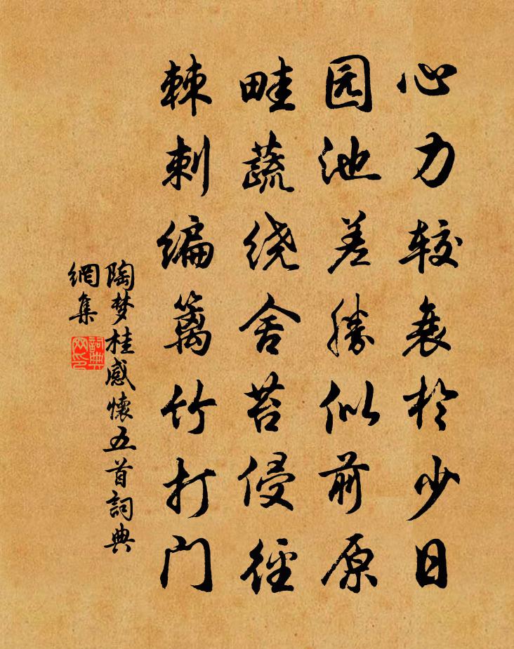 詩詞名句歷史字典書法欣賞書法字典國語詞典說文解字康熙字典古漢語字典標 題 作 者 詩 句 感懷五首作者:陶夢桂 朝代:宋代感懷五首原文心力較衰於少日,園池差勝似前原。畦蔬繞舍苔侵徑,棘刺編籬竹打門。詩詞問答問:感懷五首的作者是誰?答:陶夢桂問:感懷五首寫於哪個朝代?答:宋代陶夢桂感懷五首書法欣賞感懷五首書法作品詩詞推薦鷓鴣天晏幾道〔宋代〕楚女腰肢越女腮,粉圓雙蕊髻中開。朱弦曲怨愁春盡,淥酒杯寒記夜來。新擲果,舊分釵,冶遊音信隔章台。花間送趙屼秘書還錢塘蘇轍〔宋代〕世人何侷促,奔走鬢蒼蒼。聞道餘杭守,獨游何有鄉。禪心朝吐月,元氣夜生光。清靜安罷瘵,寬仁服暴強。聲名明叔有語贈贛丞曾幼度次韻簡明叔並寄幼度為趙蕃〔宋代〕詩成要落天地間,太虛明月相往還。聲名或覺四海隘,身乃憔悴窮閉關。詩中妙理超生死,何但不以彼易此。我來書事趙蕃〔宋代〕貧非事烹煎,病止治藥物。烏薪鬻之市,束縛論寸尺。煙浮多稚松,質重非老櫟。熾焰忽復然,寒灰已成積。夜飛鵲/夜飛鵲慢陳允平〔宋代〕秋江際天闊,風雨淒其。雲陰未放晴暉。歸鴉亂葉更蕭索,砧聲幾處寒衣。沙頭酒初熟,盡籬邊朱槿,竹外青旗。有感二首劉克莊〔宋代〕桓司馬欲兵夫子,哥利王曾醜釋迦。血面何須九墜臂,忮心終不怨鏌鎁。立春日園梅未花書呈尤檢正張鎡〔宋代〕凍禽先自起多時,暖戀衾重曉不知。栩栩夢回思樹繞,綿綿息動離床支。十行猶用午年曆,數首初編丁藁詩。臘雪郢城西樓吟(一作郎士元詩)張繼〔唐代〕連山盡塞水縈迴,山上戍門臨水開。珠簾直下一百丈,日暖游鱗自相向。昔人愛險閉層城,今人復愛閒江清。沙洲寄天目禮書記閩回釋普岩〔宋代〕爪牙訊息露三山,勘破曾郎想不難。一嘯歸來千嶂曉,於菟不似舊時斑。緣識宋太宗〔宋代〕年過百歲鬢如鴉,到處安然便是家,醉後有時相詰問,更言我解種黃芽。頌古五十七首釋道昌〔宋代〕擔東過西,移前作後。馬首千差,佛面百醜。和堯夫見寄司馬光〔宋代〕志趣苦難合,倀倀何所依。逢君始相照,知我信為稀。忽報除書下,徒瞻征蓋飛。相思千里遠,洛浦又春歸。木蘭花慢 和陳思濟 洞霄詩集卷九趙若秀〔元代〕看洞天佛地,秋氣爽,濕衣寒。對九鎖峰高,驚天一柱,壯觀杭山。岩前。舊遺仙跡,幻雲根、直作畫圖看。多少魚歸贊釋心月〔宋代〕左提魚籃,右搴衣袂。浩浩塵中,一聲活底。傾國傾城眼豁開,早已白雲千萬里。獨往方岳〔宋代〕黃冠野服隨孤鶴,竹逕松岡共往還。不肯避人當道筍,相看如客對門山。窮居作計未為左,造物於吾本不慳。徑掃方壺自詠書十首後汪莘〔宋代〕直寫胸中事,誰拈紙上塵。興來那暇懶,得處不容廑。行有鬼神覷,詩防天地嗔。歐蘇尋後輩,郊島是前身。嘲醉者宋伯仁〔宋代〕李白日斟三百盞,醉時寧記脫朝靴。一千八十萬杯酒,百歲消磨未是多。醉後狂言酬贈蕭、殷二協律白居易〔唐代〕餘杭邑客多羈貧,其間甚者蕭與殷:天寒身上猶衣葛,日高甑中未拂塵。江城山寺十一月,北風吹沙雪紛紛。賓客答余洪範二首黃庭堅〔宋代〕懸磬齋廚數米炊,貧中氣味更相思。可無昨日黃花酒,又是春風柳絮時。和張叔靖三絕鄭剛中〔宋代〕屋後瓜疇接芋區,門前寥落翳庵莒。愚痴不顧妻兒笑,依舊燈窗夜讀書。名句推薦探其懷,奪之威。主上用之,若電若雷。韓非及後人《韓非子·揚權》 停車數行日,勸酒問回期。王建《送人游塞》 萬頃風濤不記蘇。雪晴江上麥千車。蘇軾《浣溪沙·萬頃風濤不記蘇》 魂來楓葉青,魂返關塞蒙杜甫《夢李白二首·其一》 可憐日暮嫣香落,嫁與春風不用媒。李賀《南園十三首》 父子竭力山成玉,弟兄同心土變金。佚名《增廣賢文·下集》 燕子巢方就,盆池小,新荷蔽。杜安世《鶴沖天·清明天氣》 蓬山此去無多路,青鳥殷勤為探看。李商隱《無題·相見時難別亦難》 回首昭陽辭落日,傷心銅雀迎秋月文天祥《滿江紅·代王夫人作》 寂寂竟何待,朝朝空自歸。孟浩然《留別王侍御維 / 留別王維》