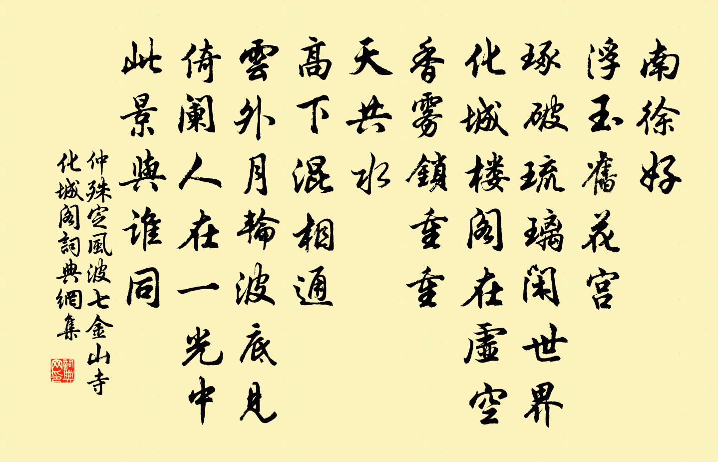 詩詞名句歷史字典書法欣賞書法字典國語詞典說文解字康熙字典古漢語字典標 題 作 者 詩 句 定風波(七·金山寺化城閣)作者:仲殊 朝代:宋代原文南徐好,浮玉舊花宮。琢破琉璃閒世界,化城樓閣在虛空。香霧鎖重重。天共水,高下混相通。雲外月輪波底見,倚闌人在一光中。此景與誰同。詩詞問答問:《定風波(七·金山寺化城閣)》的作者是誰?答:仲殊問:該詩寫於哪個朝代?答:宋代書法欣賞定風波(七·金山寺化城閣)書法作品詩詞推薦送林知錄劉克莊〔宋代〕狗監知才子,雌堂惜上賓。歸船載畫重,清俸買書貧。已作扶犁叟,難留拄笏人。洛英如見問,為說臥漳濱。新年無可〔唐代〕燃燈朝復夕,漸作長年身。紫閣未歸日,青門又見春。掩關寒過盡,開定草生新。自有林中趣,誰驚歲去頻。次韻楊廷秀郎中游西湖十絕喻良能〔宋代〕憶昔孤山和靖家,光風霽月總輸他。幾多水草連菸草,無限苹花雜藕花。團扇歌蕭衍〔南北朝〕手中白團扇。淨如秋團月。清風任動生。嬌香承意發。梁鼓吹曲 道亡沈約〔南北朝〕道亡數極歸永元。悠悠兆庶盡含冤。瀋河莫極皆無安。赴海誰授矯龍翰。自樊漢仙波流水清且瀾。救此倒懸拯塗炭再次趙侯韻陳造〔宋代〕理窟疏明面面通,如君襟抱古賢同。孤獨標碧地霜月,勝韻芳林度蕙風。妙語寧惟壓元白,大封端合啟龜蒙。規恢雪後梅邊方岳〔宋代〕寒雀群飛最上頭,啄殘香玉翠雲裘。老坡詩裹么麽鳳,待與梅花渠是不。送人歸吳齊己〔唐代〕比說歸耕釣,迢迢向海涯。春寒遊子路,村晚主人家。□□□□□,□山綠過茶。重尋舊鄰里,菱藕正開花。庚戍生日再擬去擬去歲輓歌辭葉茵〔宋代〕憶昨歲莫止,慷慨生當機。擬韻追先哲,持為自壽詩。成篇示叔季,心然 * 非。詎知不一霜,季兮先露晞。興思開府潞公太師得謝西歸謹賦七言四韻詩五首拜蘇頌〔宋代〕君臣一德千齡際,柱石三朝四紀中。天下重輕常系望,膝前謀議不言功。位高少有名兼美,體健方知福更隆。謾道仙女詞楊衡〔唐代〕玉京初侍紫皇君,金縷鴛鴦滿絳裙。仙宮一閉無訊息,遙結芳心向碧雲。泛茅山東溪儲光羲〔唐代〕清晨登仙峰,峰遠行未極。江海霽初景,草木含新色。而我任天和,此時聊動息。望鄉白雲里,發棹清溪側。松柏霜天曉角(子慶母八十)劉子寰〔宋代〕滿前兒女。今日都歡聚。今也阿彌八十,兒也五十五。瓷甌並瓦注。山歌和社舞。但管年年強健,妝成個、西王母江南曲李叔卿〔唐代〕湖上花女,江花南花,無花雙越女春浣紗。風似箭,月如弦,少年吳兒曉進船。郗家子弟謝家郎,烏巾白袷紫香囊經略待制趙侍郎輓詞周必大〔宋代〕仙系根蟠李,王孫種自龍。暮年都督府,早日大司農。密印加三品,朝冠掛四松。清暉遺蹟在,山水為誰容。浣溪沙侯置〔宋代〕客里忽忽夢帝州。故人相遇一杯休。疏梅些子最清幽。雙綰香螺春意淺,緩歌金縷楚雲留。不知妝鏡若為儔。北窗陸游〔宋代〕北窗無俗物,三伏有餘涼。玉麈消長日,風漪可一床。盞分新作茗,爐撥欲殘香。卻岸紗巾去,翛然野水傍。禪人並化主寫真求贊釋正覺〔宋代〕默默工夫,心田自鋤。醭生唇上滿,泥斲鼻頭余。少林何曾說話,曹溪不識文書。誰言伎倆渾無巧,自信家風也不狀江南季夏范燈〔唐代〕江南季夏天,身熱汗如泉。蚊蚋成雷澤,袈裟作水田。游張公善權二洞四首曾幾〔宋代〕此邦勝處名天下,今日爭來入眼中。筇杖一枝舟一葉,山行沖雨水衝風。名句推薦中庭月色正清明,無數楊花過無影。張先《木蘭花·乙卯吳興寒食》 一聲聲,一更更。万俟詠《長相思·雨》 沙上並禽池上暝。雲破月來花弄影。張先《天仙子·水調數聲持酒聽》 朝看水東流,暮看日西墜。錢福《明日歌》 舍其所爭,取其所棄,不亦君子乎?王通《中說·卷四·事君篇》 殊方日落玄猿哭,舊國霜前白雁來。杜甫《九日五首·其一》 欲人之處高爵祿,則以讓賢也;多財則以分貧也。墨子《墨子·49章 魯問》 兒女此情同。往事朦朧。湘娥竹上淚痕濃。辛棄疾《浪淘沙·賦虞美人草》 陋室空堂,當年笏滿床;衰草枯楊,曾為歌舞場。曹雪芹《好了歌注》 及茲春未深,數畝猶足佃。王守仁《謫居糧絕請學於農將田南山詠言寄懷》