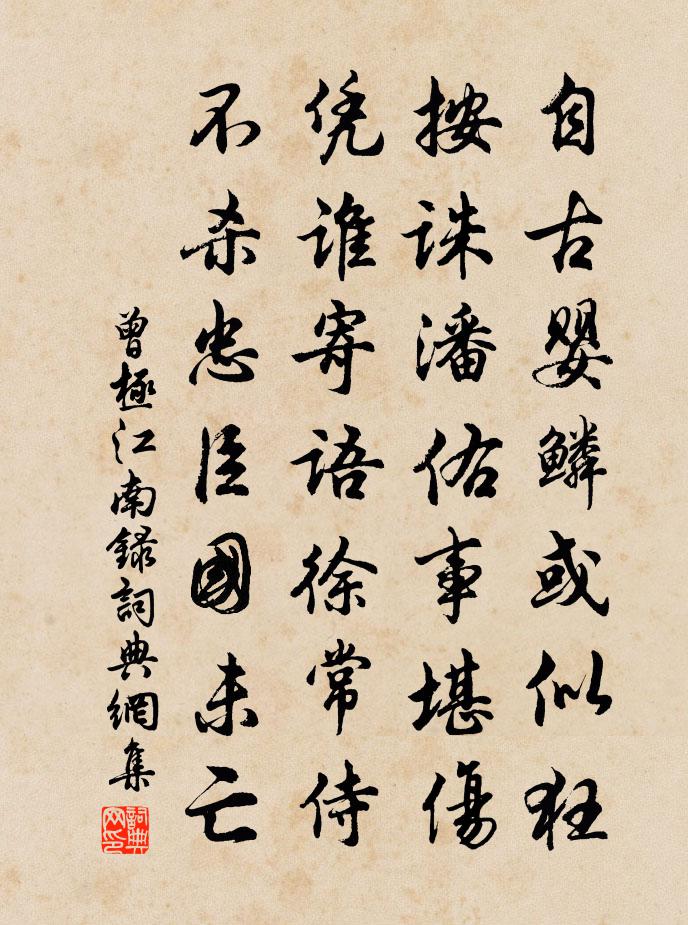 詩詞名句歷史字典書法欣賞書法字典國語詞典說文解字康熙字典古漢語字典標 題 作 者 詩 句 江南錄作者:曾極 朝代:宋代江南錄原文自古嬰鱗或似狂,按誅潘佑事堪傷。憑誰寄語徐常侍,不殺忠臣國未亡。詩詞問答問:江南錄的作者是誰?答:曾極問:江南錄寫於哪個朝代?答:宋代曾極江南錄書法欣賞江南錄書法作品詩詞推薦水仙花陳傅良〔宋代〕江梅丈人行,歲寒固天姿。蠟梅微著色,標緻亦背時。胡然此柔嘉,支本僅自持。乃以平地尺,氣與松篁夷。粹然采芹亭方蒙仲〔宋代〕便好時時具小槎,遍游水北水南涯。游時要揀山深處,恐有山人處士家。百字令 贈真蟾子葉大師李道純〔元代〕玄關欲透,做工夫、妙在一陽來復。天癸才生忙下手,采處切須虔篤。絕慮忘機,清心釋累,認取虛無谷。鉛銀砂菩提寺禁口號又示裴迪王維〔唐代〕安得舍羅網,拂衣辭世喧。悠然策藜杖,歸向桃花源。東陽郭彥明挽章呂祖謙〔宋代〕小試威名蓋一鄉,卷藏韜畧付農桑。傳家簽軸書盈幄,擇婿簪纓笏滿床。置邑萬家開兆域,送車千兩塞康莊。正須台城任希夷〔宋代〕隋家耕壟偏陳宮,留得鐘山蔣郡東。只怕東南分王氣,那知零落錦帆風。點絳唇·金谷年年林逋〔宋代〕金谷年年,亂生春色誰為主?余花落處,滿地和煙雨。又是離歌,一闋長亭暮。王孫去,萋萋無數,南北東西路。依韻釋道真〔宋代〕白壁雖然好丹青,無簡迷愚難悟醒。縱有百般僧氏巧,也有文徒書號名。空留佳妙不題宣,卻入五趣陷塵境。唯報宿城外張氏莊早起入三首楊萬里〔宋代〕眠雲跂石十餘年,回首拋官一瞬間。送舊迎新也辛苦,一番辛苦兩年閒。烏夜啼盧祖皋〔宋代〕幾曲微風按柳,生香暖日蒸花。鴛鴦睡足芳塘晚,新綠小窗紗。尺素難將情緒,嫩羅還試年華。憑高無處尋殘夢,謁墓五首劉克莊〔宋代〕庵里僧應行腳去,龕中佛也為眉嚬。炎炎昔有□□者,寂寂今無上冢人。秀江亭黃庭堅〔宋代〕因循不到此江頭,匹馬黃埃三十秋。舊舍只今人共老,清波常與月分流。羨君瀟灑成佳趣,感我淒涼念舊遊。沽酒煙雨奇觀樓吳機〔宋代〕此景儀真亦有年,何人管領向樓前。江淮自昔雖南北,煙雨從來肯變遷。萬里孤帆遺根在,半空佳句至今傳。諸公挽張魏公劉過〔宋代〕背水未成韓信陣,明星已隕武侯軍。平生一點不平氣,化作祝融峰上雲。殘句荔枝已成吾發白蘇軾〔宋代〕荔枝已成吾發白,猶作江南未歸客。薄媚摘遍·桂香消趙以夫〔宋代〕桂香消,梧影瘦, * 迷深院。倚西風,看落日,長江東去如練。先生底事,有賦飄然。剛到為田園。獨醒何為,青玉案 壽趙定宇程文海〔元代〕梅花杯酒年年早。有個詩人未老。恰則蛾眉新月巧。人間春信,水邊仙影,共約今宵到。少年回首卻休道。算只有拱秀閣釋紹曇〔宋代〕萬疊遙岑綠打圍,曉寒空翠潑禪衣。幽禽喚起蘿窗定,閒看春雲帶雨歸。游龍門分題十五首白傅墳歐陽修〔宋代〕芳荃奠蘭酌,共吊松林里。溪口望山椒,但見浮雲起。對花有感梅堯臣〔宋代〕新花朝竟妍,故花色憔悴。明日花更開,新花何以異。名句推薦木從繩則正,後從諫則聖。佚名《尚書·商書·說命上》 一葉葉,一聲聲,空階滴到明。溫庭筠《更漏子·玉爐香》 年年春日異鄉悲,杜曲黃鶯可得知。韋莊《江外思鄉》 他人有心,予忖度之。佚名《巧言》 朝作輕寒暮作陰,愁中不覺已春深。屈大均《壬戌清明作》 成事享其功,敗事委其過,且聖人弗能逾者,概人之本然也。來俊臣《羅織經·閱人卷第一》 雞鳴紫陌曙光寒,鶯囀皇州春色闌。岑參《奉和中書舍人賈至早朝大明宮》 雲間連下榻,天上接行杯。李白《與夏十二登岳陽樓》 酒未開樽句未裁,尋春問臘到蓬萊。曹雪芹《訪妙玉乞紅梅》 何處寄想思,南風搖五兩。王維《送宇文太守赴宣城》