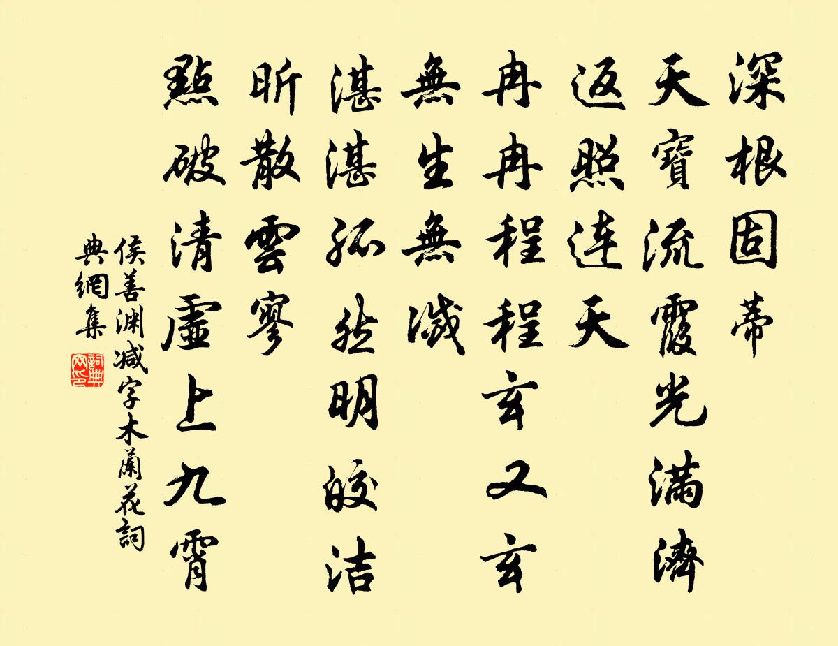 詩詞名句歷史字典書法欣賞書法字典國語詞典說文解字康熙字典古漢語字典標 題 作 者 詩 句 減字木蘭花作者:侯善淵 朝代:元代減字木蘭花原文深根固蒂。天寶流霞光滿濟。返照連天。冉冉程程玄又玄。無生無滅。湛湛孤然明皎潔。昕散雲寥。點破清虛上九霄。詩詞問答問:減字木蘭花的作者是誰?答:侯善淵問:減字木蘭花寫於哪個朝代?答:元代問:減字木蘭花是什麼體裁?答:詞侯善淵減字木蘭花書法欣賞減字木蘭花書法作品詩詞推薦如夢令吳潛〔宋代〕插遍門前楊柳。又是清明時候。歲月不饒人,鬢影星星知否。知否。知否。且盡一杯春酒。開元宮黃溍〔元代〕誰使藏舟一夕移,紅樓翠幕未全非。曾聞帝子乘鸞去,疑有仙人化鶴歸。煙徑月明瑤草歇,石壇露冷碧桃稀。赤欄偶成張耒〔宋代〕卻掃客不至,端為四國騷。杯寒薦園實,食儉煮溪毛。霜過橘柚熟,天晴鴻鵠高。幽齋高木近,不寢聽雞號。句何麟〔宋代〕一楠枯再生,兩石合無罅。梁山韭黃妙天下,玉箸金釵盈大把。題翠峰寺西軒黃公度〔宋代〕寂寂春葩映短牆,半山松竹奏笙簧。無情幽鳥背人去,不慣村童笑客狂。重陽日陪韋卿宴朱灣〔唐代〕何必龍山好,南亭賞不暌。清規陳侯事,雅興謝公題。入座青峰近,當軒遠樹齊。仙家自有月,莫嘆夕陽西。與龍節上壽孔武仲〔宋代〕瑞雪峨峨宮嚴明,千秋佳節會公卿。香飄彩霧縈天仗,酒浥流霞滿壽觥。密勿華封多好語,鏘洋鈞奏盡和聲。自鄰謁金門石孝友〔宋代〕歸不去。歸去又還春暮。洞裡小桃音信阻。幾番風更雨。相伴竹筇芒履。穿盡松溪花塢。早是行人貪道路。聲聲聞贈胡處士曹松〔唐代〕年光離岳色,帶疾臥南原。白日與無事,俗人嗔閉門。樵魚臨片水,野鹿入荒園。莫問榮華事,清霜點髮根。龍池寺喻良能〔宋代〕發軔資福山,弭轡龍池寺。杪春新雨足,老紅圍穉翠。溪流素縠寒,山色青羅膩。拄頰坐移晷,此意誰能會。絕句李流謙〔宋代〕圍爐獨扔夜深紅,已是摧頹一老翁。斷簡半披還半掩,如今不作蠹書蟲。辛丑大水滕岑〔宋代〕天公哀此生人苦,潸然出涕灑下土。五晝五夜涕不已,平陸成河山作渚。是方為邑本霔下,今者之變頃未睹。何止題南海東廟楊萬里〔宋代〕羅浮山如萬石鍾,一服南走如渴龍。雷奔電萬遮不住,直抵海濱無去處。低頭飲海吐絳霞,舉頭戴著祝融家。珠宮高郵因師薄萄蘆雁秋瓜三種敖陶孫〔宋代〕莫話淒涼塞北秋,銜蘆避弋使人愁。與君細展江南畫,水宿沙眠得自由。少年行張昌宗〔唐代〕少年毛不識事,毛落魄游韓毛魏。珠軒流水車,玉勒浮雲騎。縱橫意不一,然諾心無二。白璧贈穰苴,黃金奉毛遂崧高詩為九江趙使君壽楊冠卿〔宋代〕周邦鹹喜,式歌且舞。於時語語,厥聲載路。訴衷情方千里〔宋代〕遠山重疊亂山盤。江上晚風酸。秋容更兼殘日,楓葉照人丹。書未到,夢猶閒。鬢先斑。憑高無語,征雁知愁,聲白鶴關趙希邁〔宋代〕危亭石作關,假道一躋攀。白鶴何年去,青松盡日閒。坐時聞遠水,望處小他山。衲子云衣厚,寒猶宿此間。酬張籍司業見寄姚合〔唐代〕日日在心中,青山青桂叢。高人多愛靜,歸路亦應同。罷吏方無病,因僧得解空。新詩勞見問,吟對竹林風。奉送杜中丞赴洪州暢當〔唐代〕詔出鳳凰宮,新恩連帥雄。江湖經戰陣,草木待仁風。豪右貪威愛,紆繁德簡通。多慚君子顧,攀餞路塵中。名句推薦欲心難厭如溪壑,財物易盡若漏卮。程登吉《幼學瓊林·卷三·人事》 佳時倍惜風光別,不為登高。只覺魂銷。納蘭性德《採桑子·九日》 人學始知道,不學亦徒然。佚名《增廣賢文·上集》 何時一樽酒,重與細論文。杜甫《春日憶李白》 三十功名塵與土,八千里路雲和月。岳飛《滿江紅·寫懷》 重岩疊嶂,隱天蔽日。酈道元《三峽》 聞之而不見,雖博必謬;見之而不知,雖識必妄;知之而不行,雖敦必困。荀子《荀子·儒效》 日暮長江里,相邀歸渡頭。儲光羲《江南曲四首》 草木行列,煙消日出。蘇轍《黃州快哉亭記》 澗戶寂無人,紛紛開且落。王維《辛夷塢》